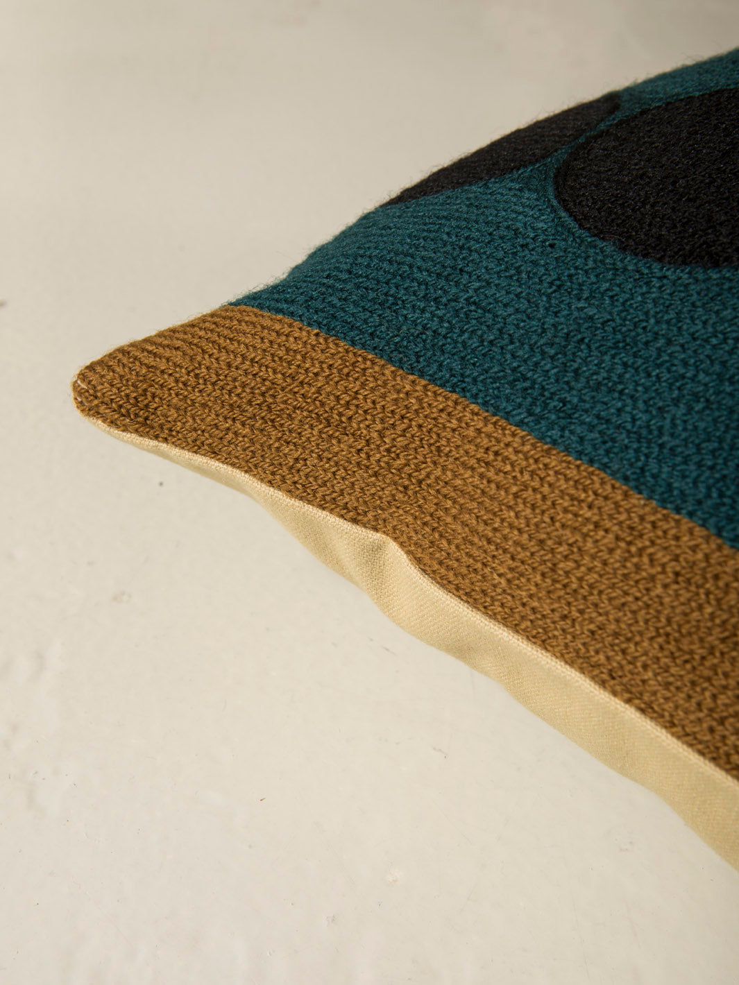 Cojín de Lindell & Co. diseñado en exclusiva por Gabrielle Soyer y fabricado 100% a mano: bordados, tejidos y tintes están hechos por artesanos de India y Nepal. Los materiales utilizados son lana de Nueva Zelanda y seda india. Sus delicadas irregularidades son parte de su innegable personalidad y prueba de su autenticidad. Todas las creaciones de Lindell & Co. están producidas en pequeñas cantidades.