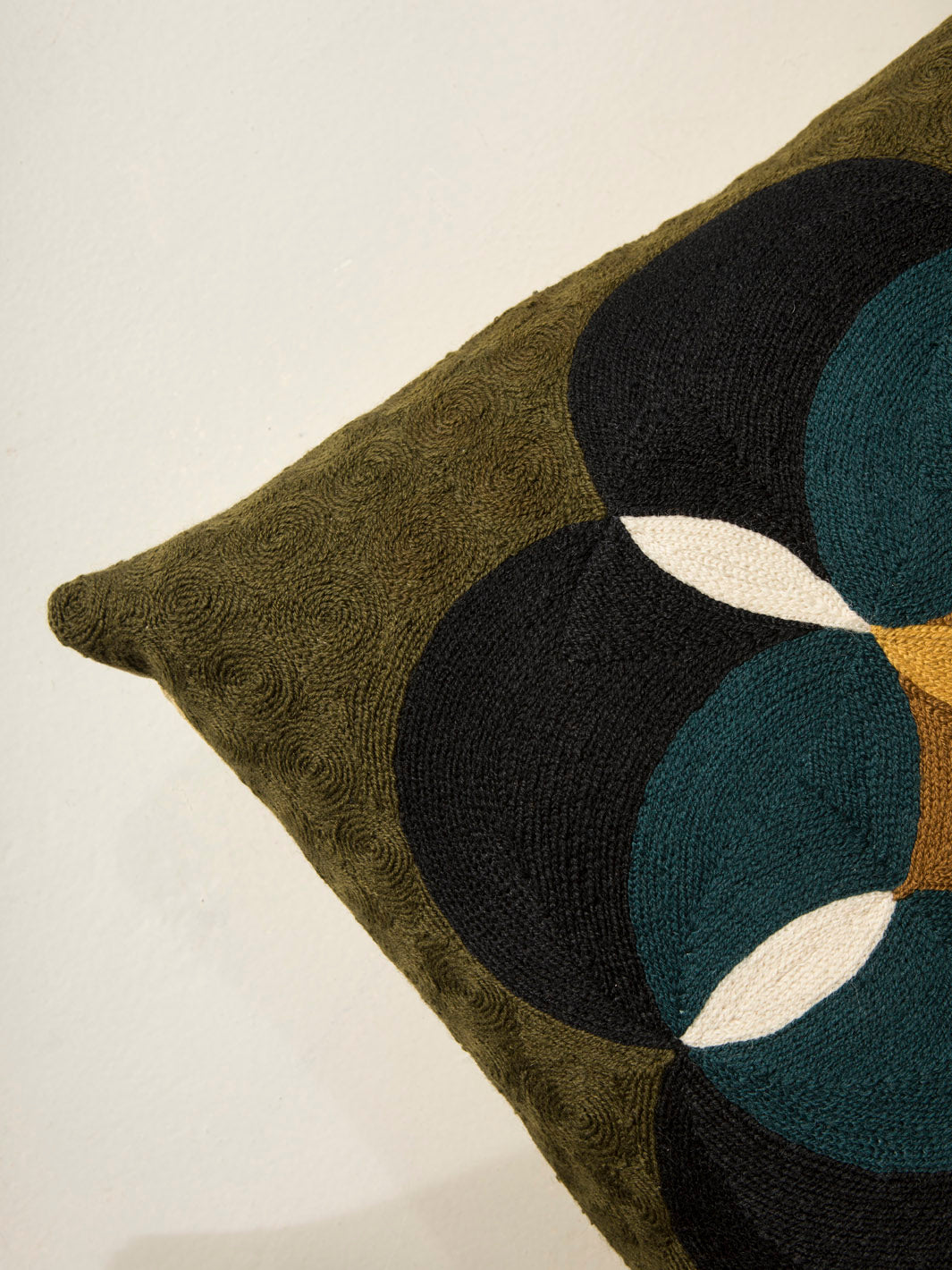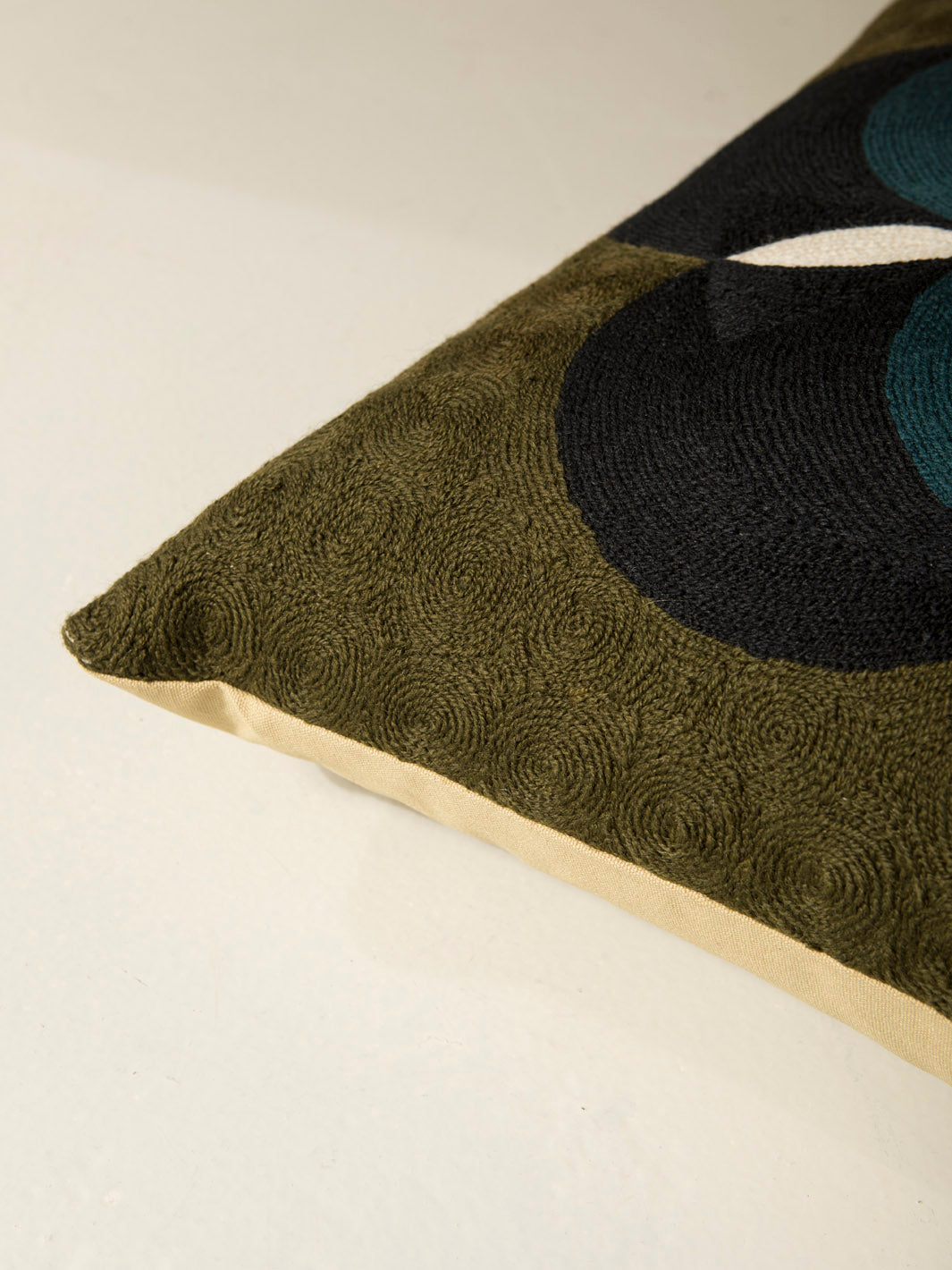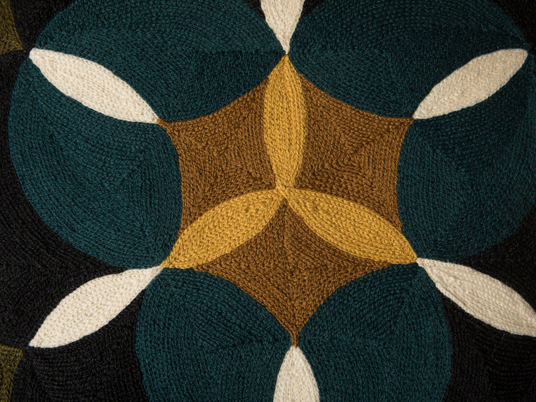 Cojín de Lindell & Co. diseñado en exclusiva por Gabrielle Soyer y fabricado 100% a mano: bordados, tejidos y tintes están hechos por artesanos de India y Nepal. Los materiales utilizados son lana de Nueva Zelanda y seda india. Sus delicadas irregularidades son parte de su innegable personalidad y prueba de su autenticidad. Todas las creaciones de Lindell & Co. están producidas en pequeñas cantidades.