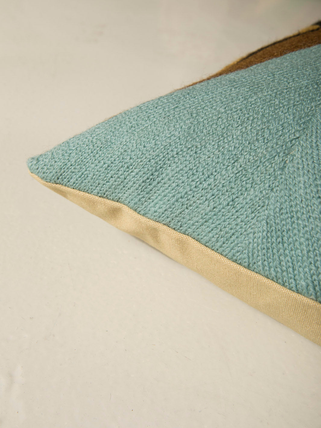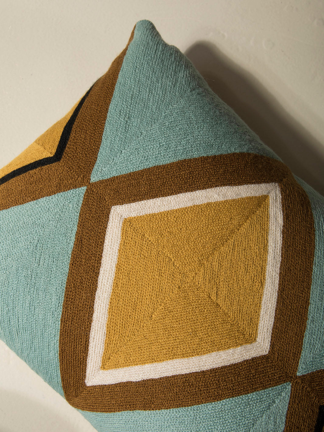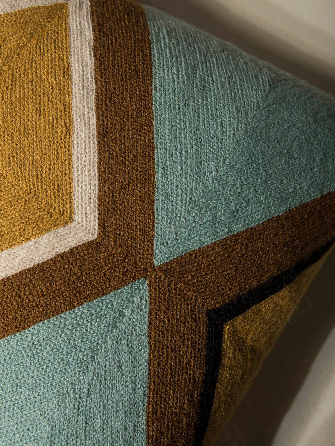 Cojín de Lindell & Co. diseñado en exclusiva por Gabrielle Soyer y fabricado 100% a mano: bordados, tejidos y tintes están hechos por artesanos de India y Nepal. Los materiales utilizados son lana de Nueva Zelanda y seda india. Sus delicadas irregularidades son parte de su innegable personalidad y prueba de su autenticidad. Todas las creaciones de Lindell & Co. están producidas en pequeñas cantidades.