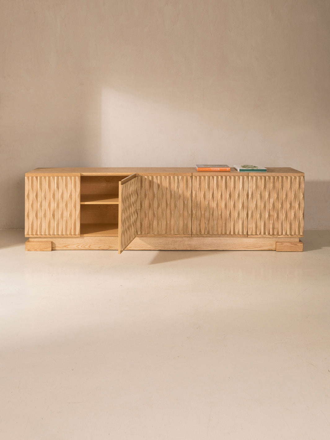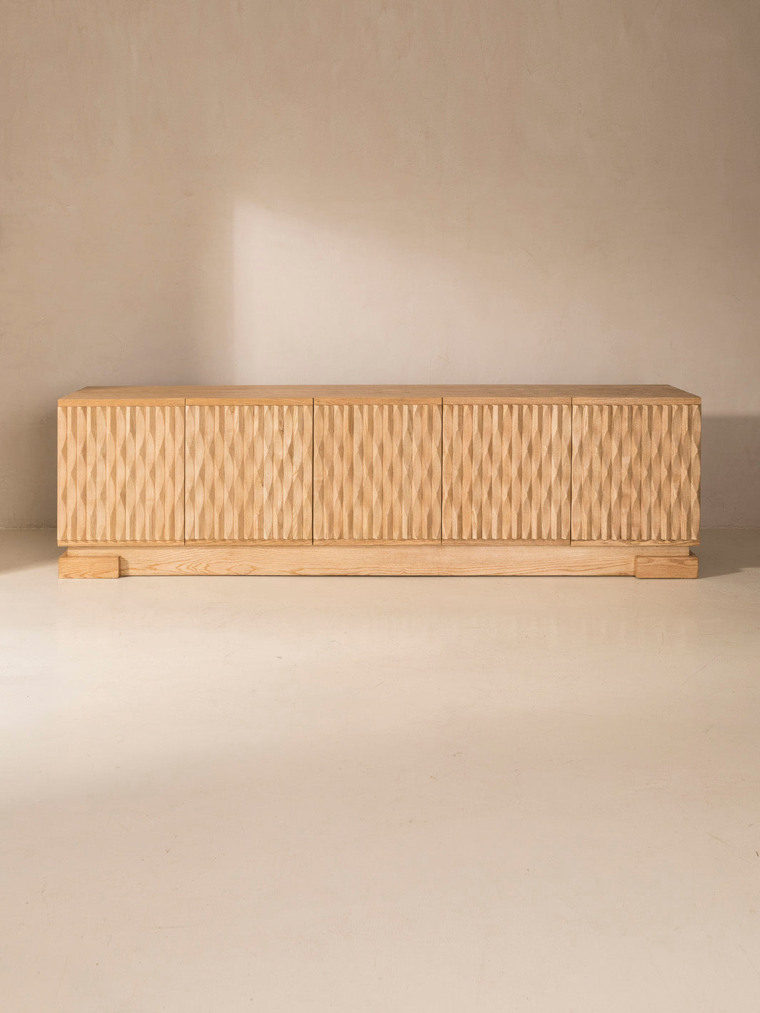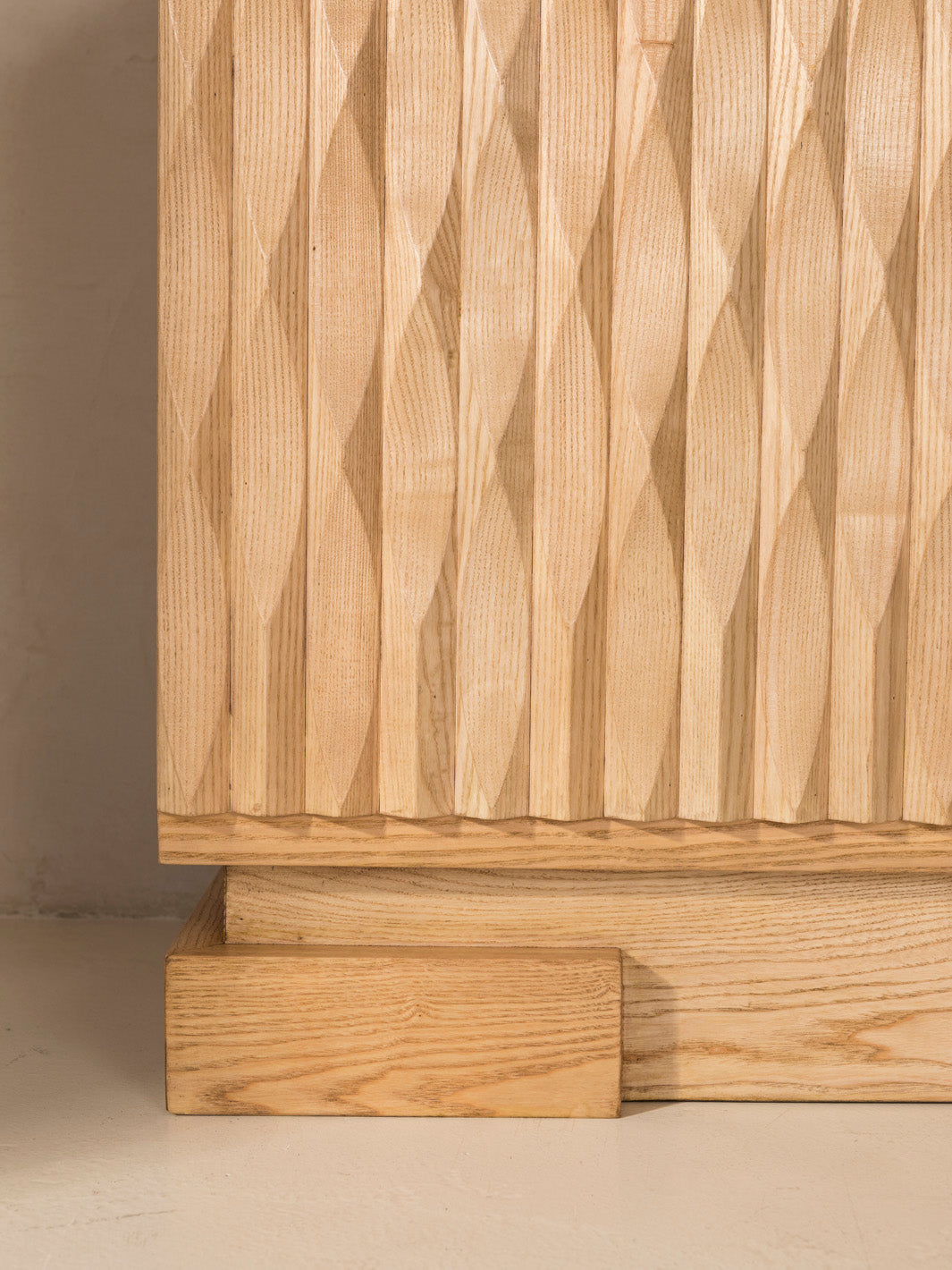 Aparador italiano trabajado artesanalmente en madera de fresno blanco mate. Su imponente tallado en bloques irregulares de inspiración años 70 lo convierte en una pieza escultural.