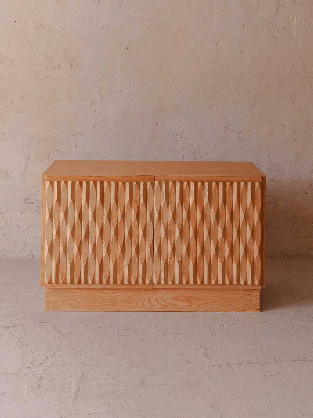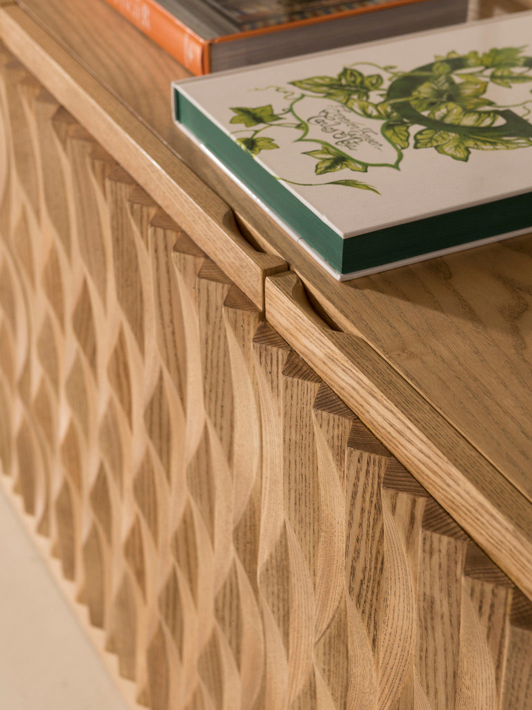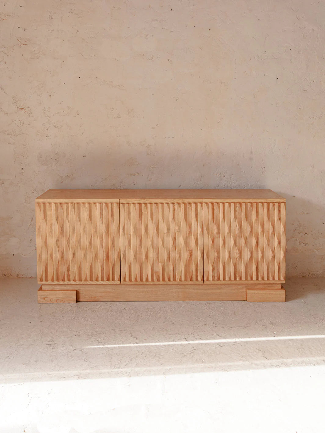 Aparador italiano trabajado artesanalmente en madera de fresno blanco mate. Su imponente tallado en bloques irregulares de inspiración años 70 lo convierte en una pieza escultural.