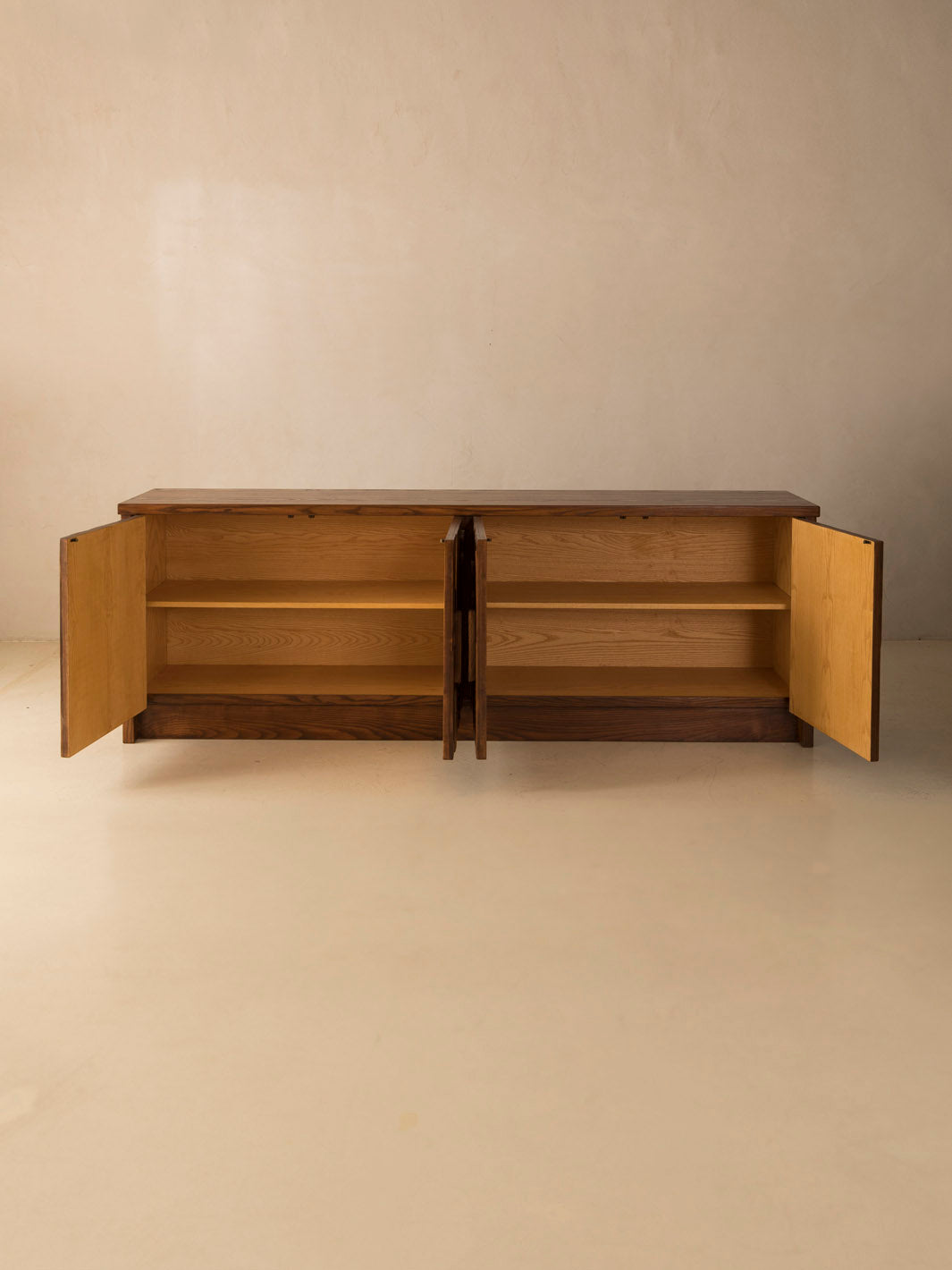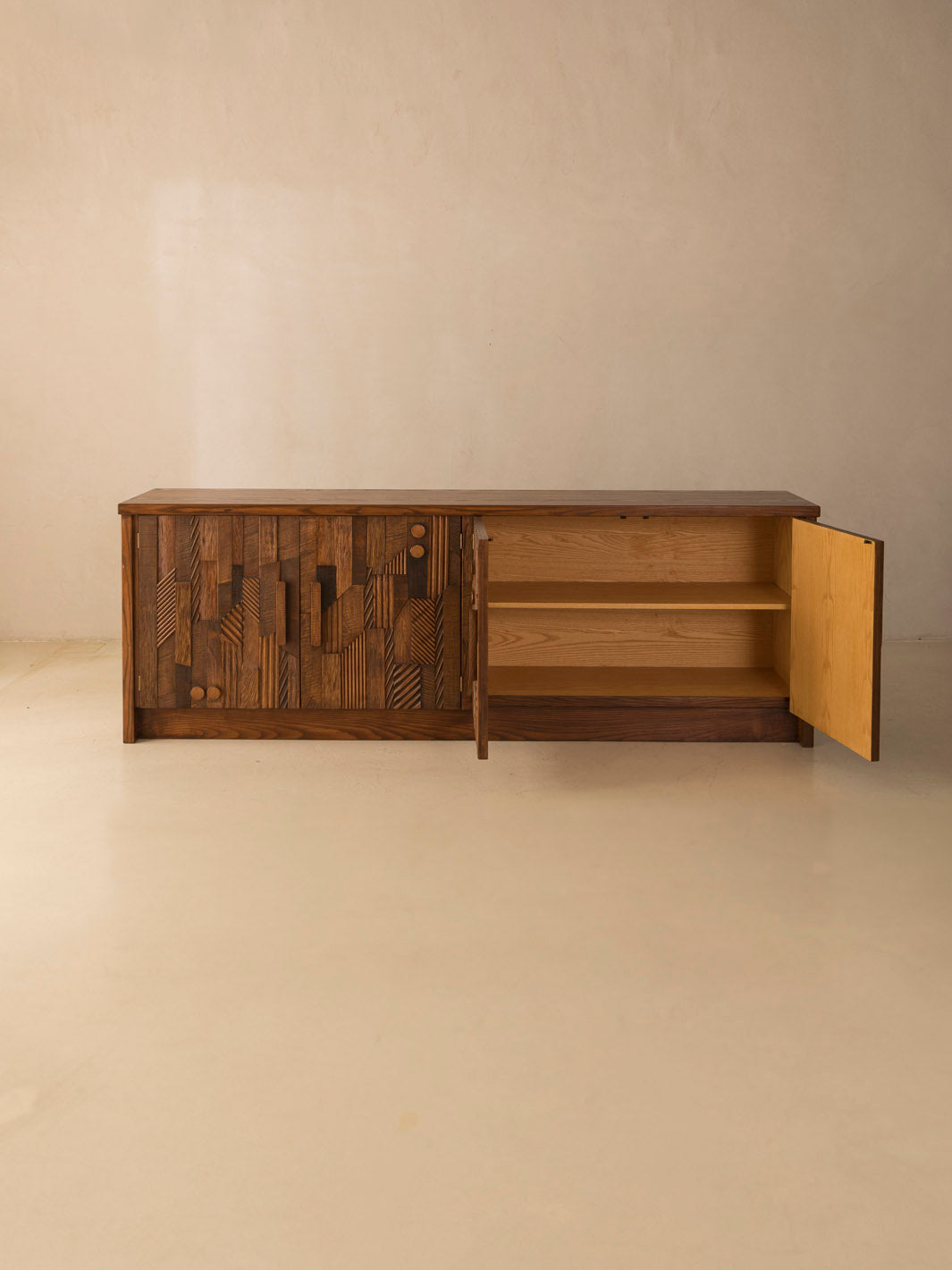 Aparador italiano de cuatro puertas trabajado artesanalmente en madera de fresno con madera tallada en caoba, roble, y nogal canaletto. Su imponente tallado de inspiración africana lo convierte en una pieza escultural.