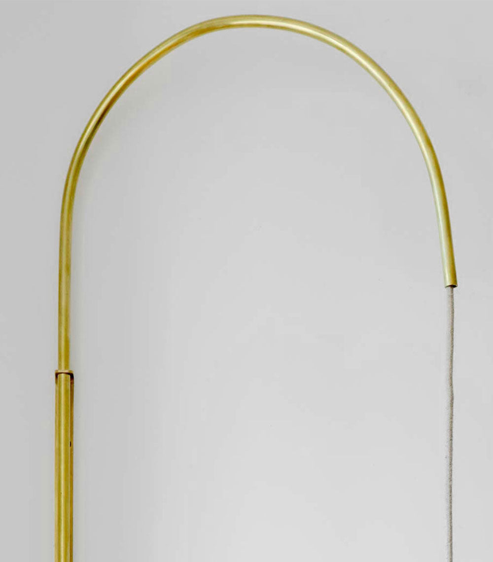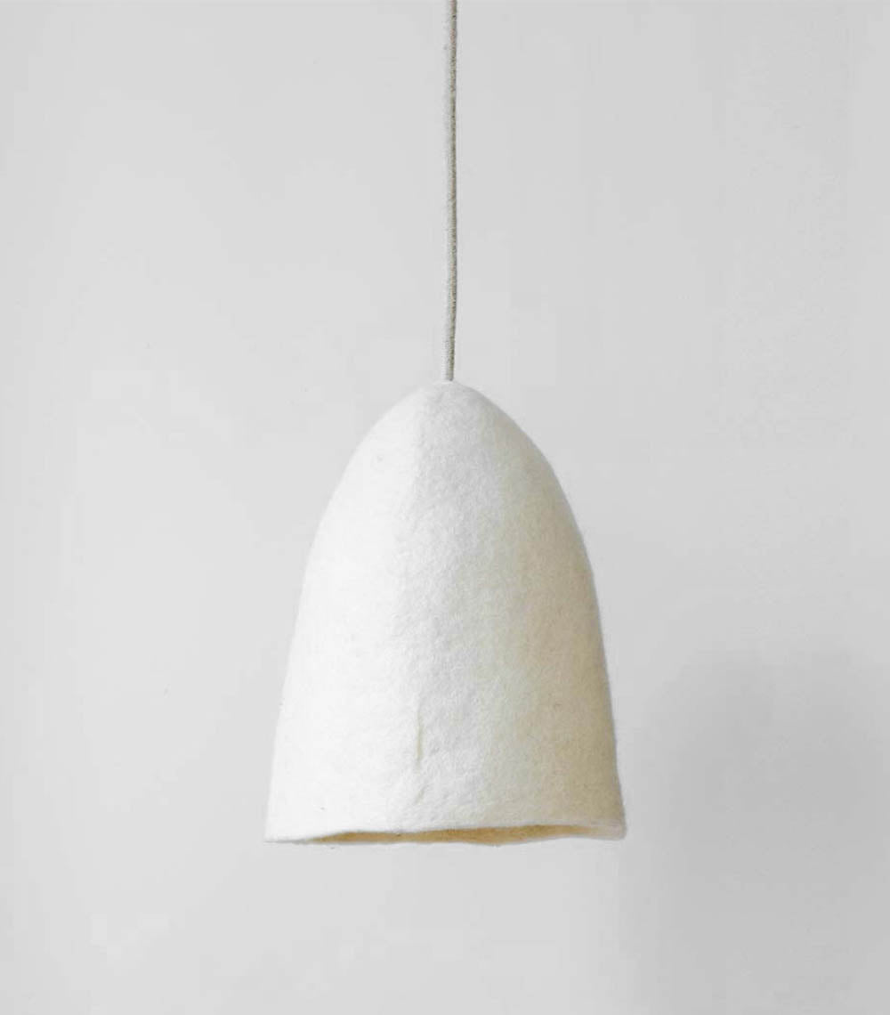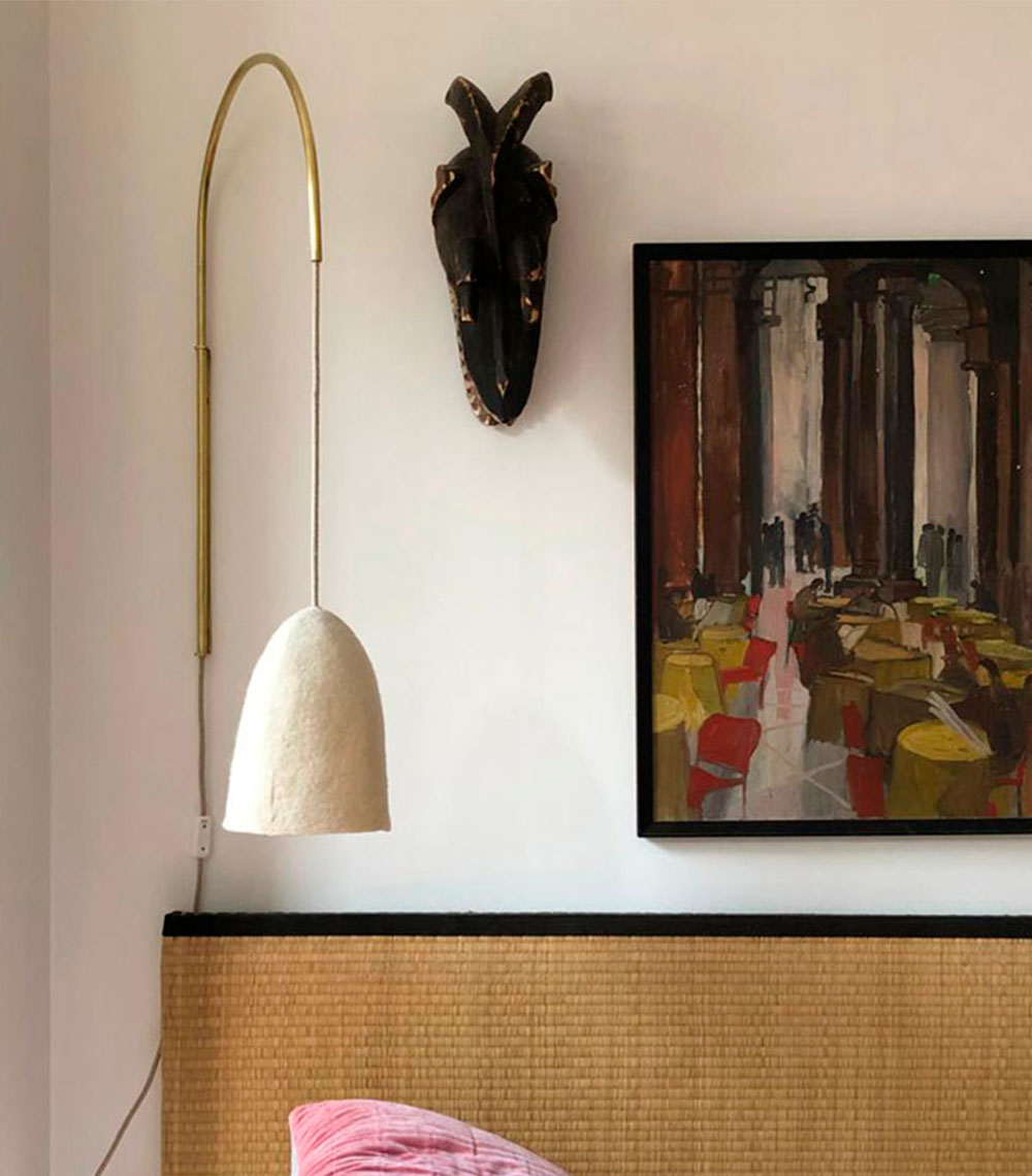 Aplique de pared con pantalla de fieltro y estructura móvil de latón. Está inspirada en el “qelesh”, un sombrero tradicional usado por los hombres en la Albania rural. Cada pantalla está hecha artesanalmente con una laboriosa técnica tradicional.