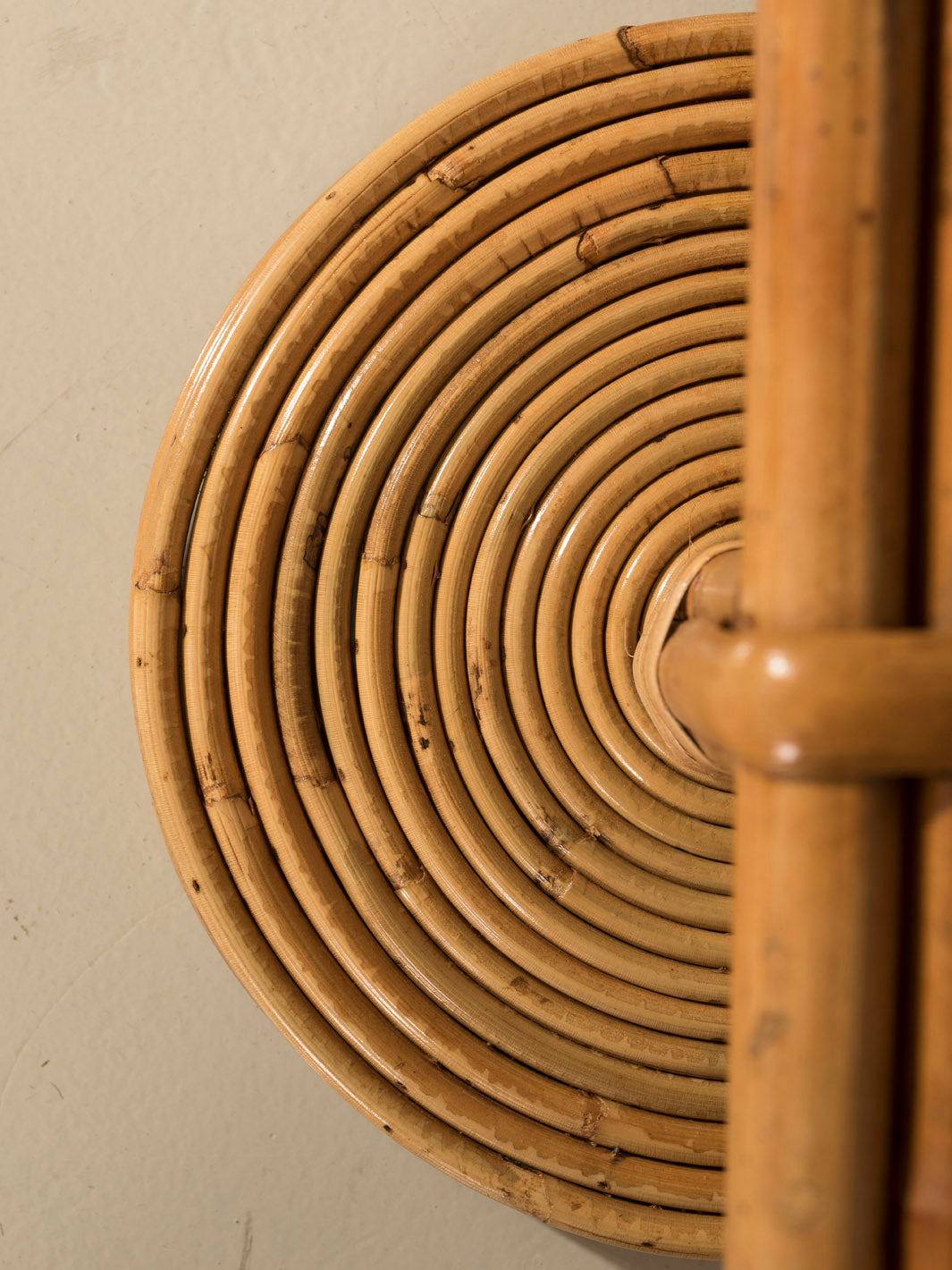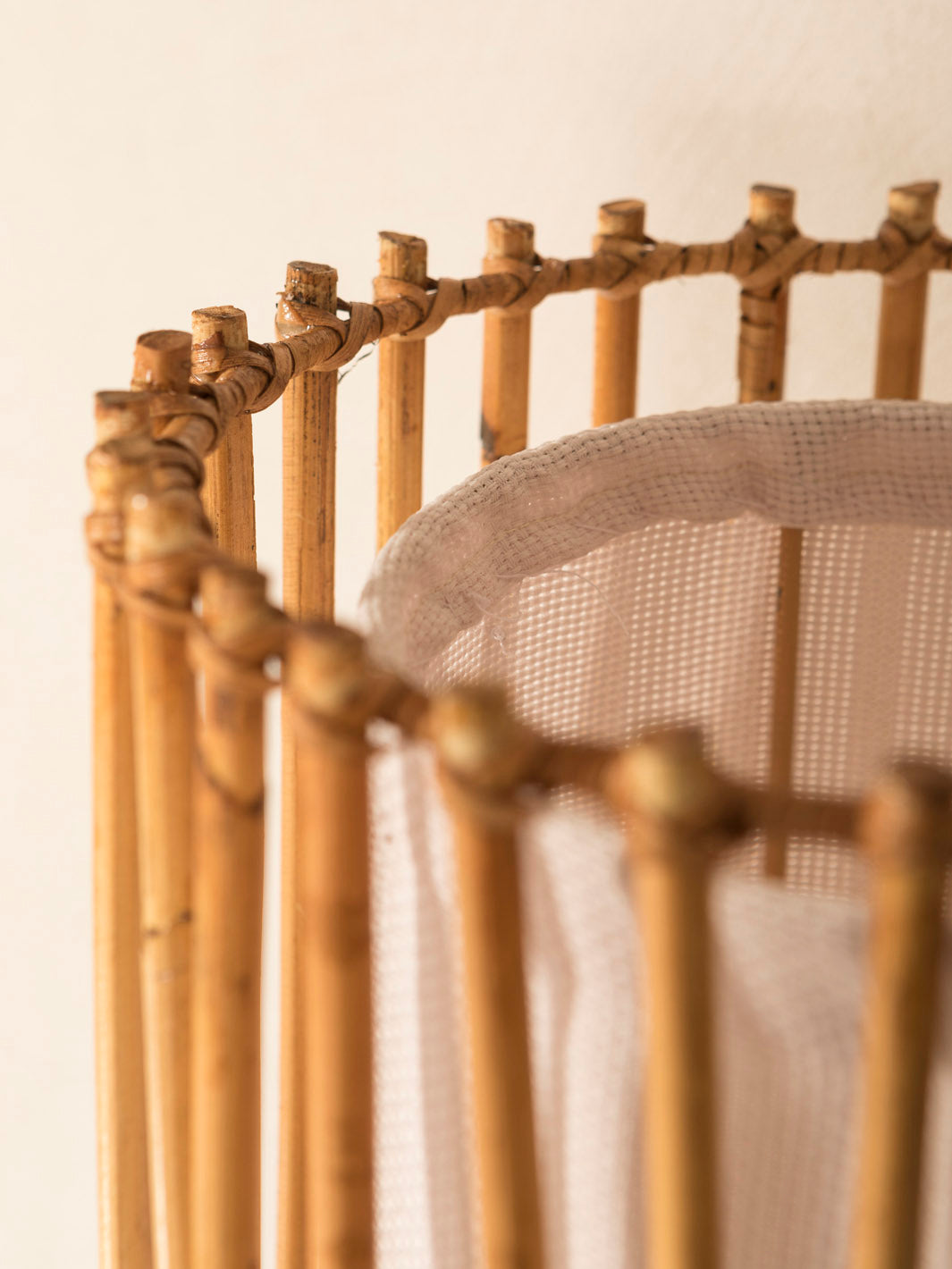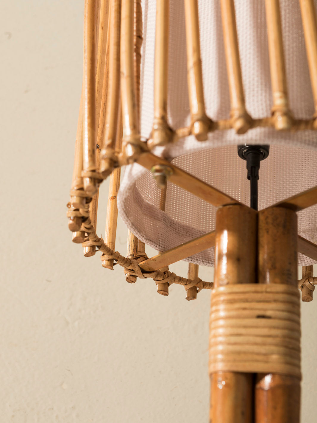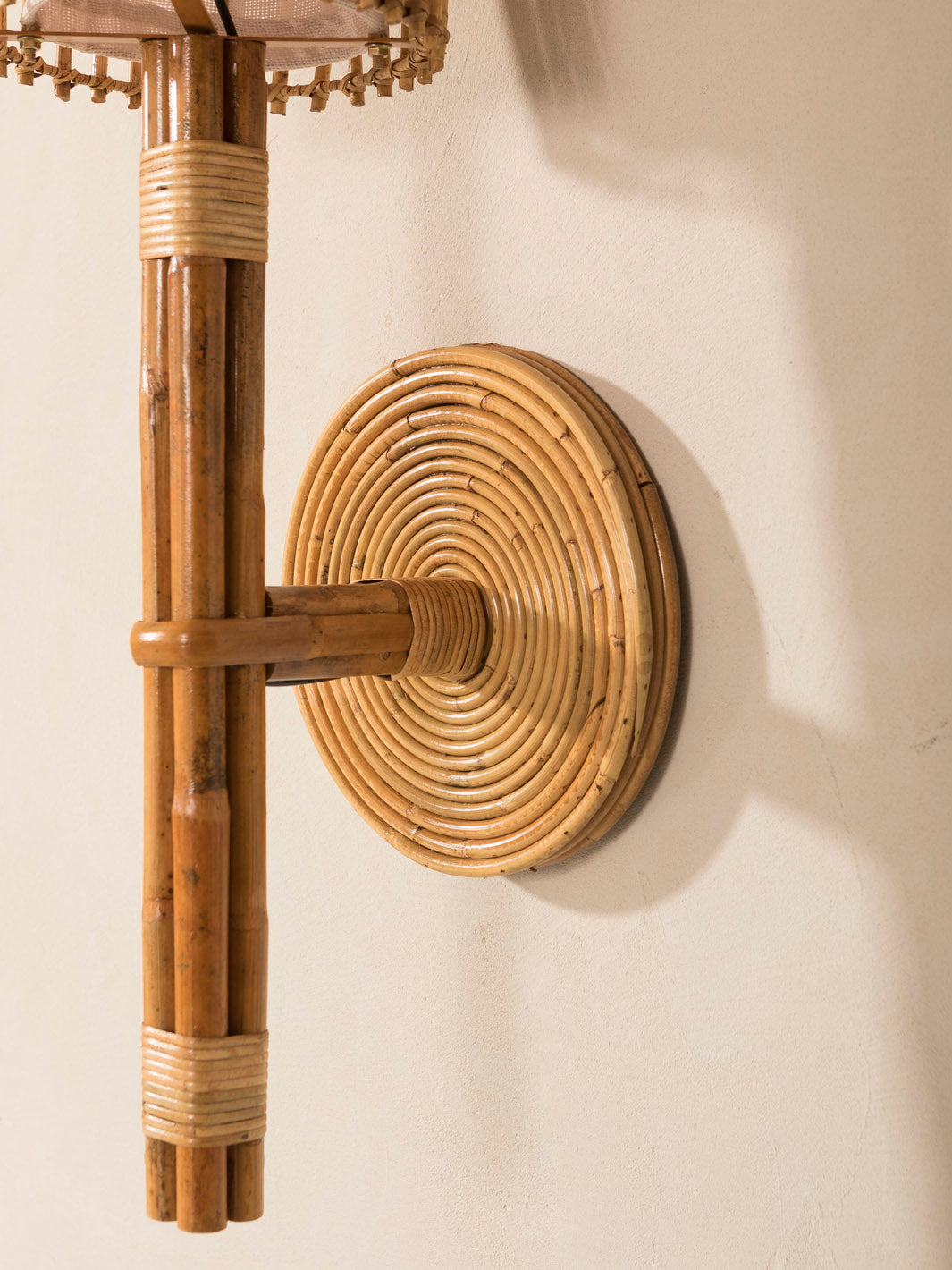 Aplique de pared de bambú con un diseño artesanal y natural que aporta calidez y estilo a cualquier espacio. Su estructura de varillas de bambú permite una iluminación suave y acogedora, ideal para ambientes relajantes.