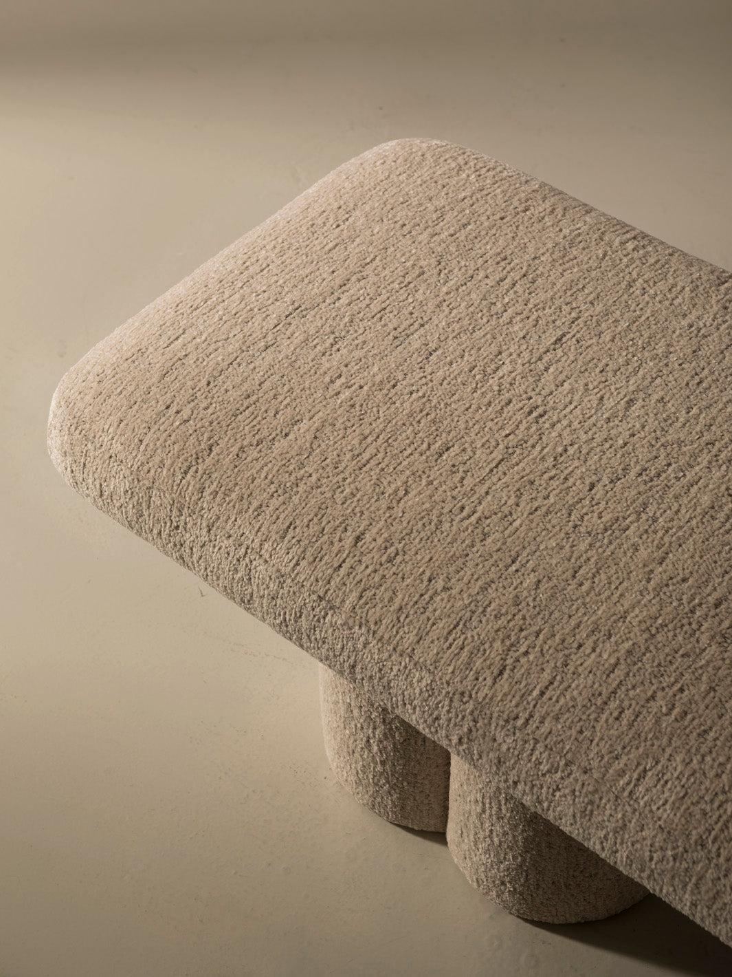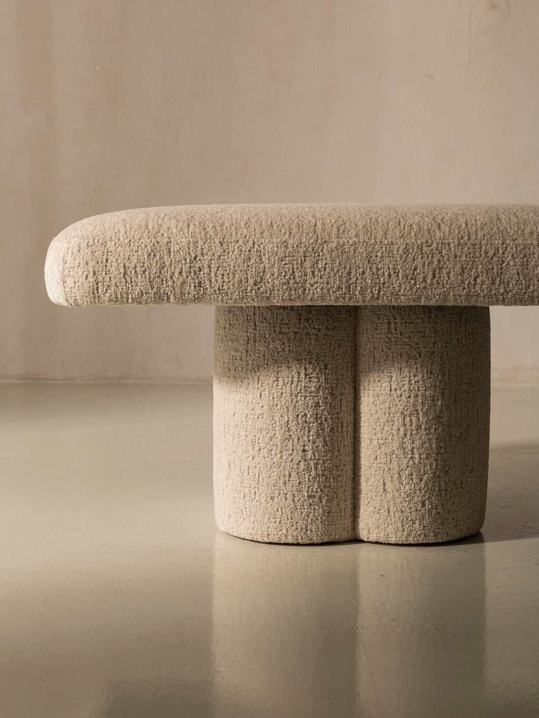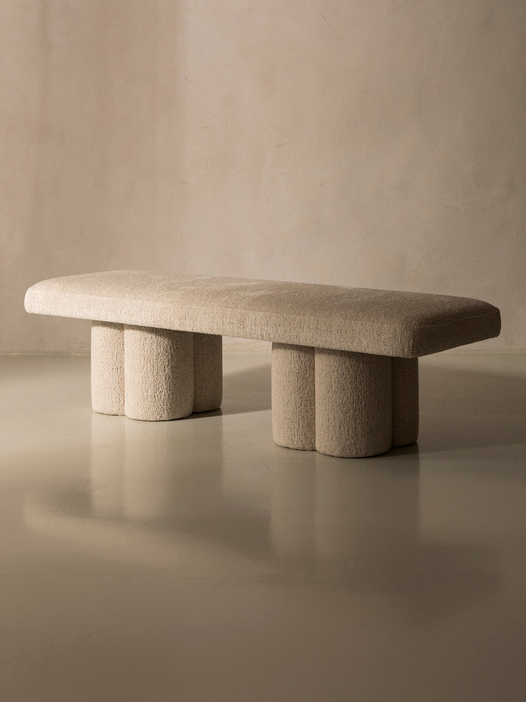 Un equilibrio perfecto entre forma y función, este banco tapizado en bouclé redefine la sofisticación con su diseño escultórico. Sus bases cilíndricas con detalles orgánicos evocan una estética brutalista, mientras que la suavidad de su textura aporta calidez y confort. Su tonalidad neutra lo convierte en una pieza versátil, ideal para elevar cualquier ambiente con su presencia imponente y refinada.