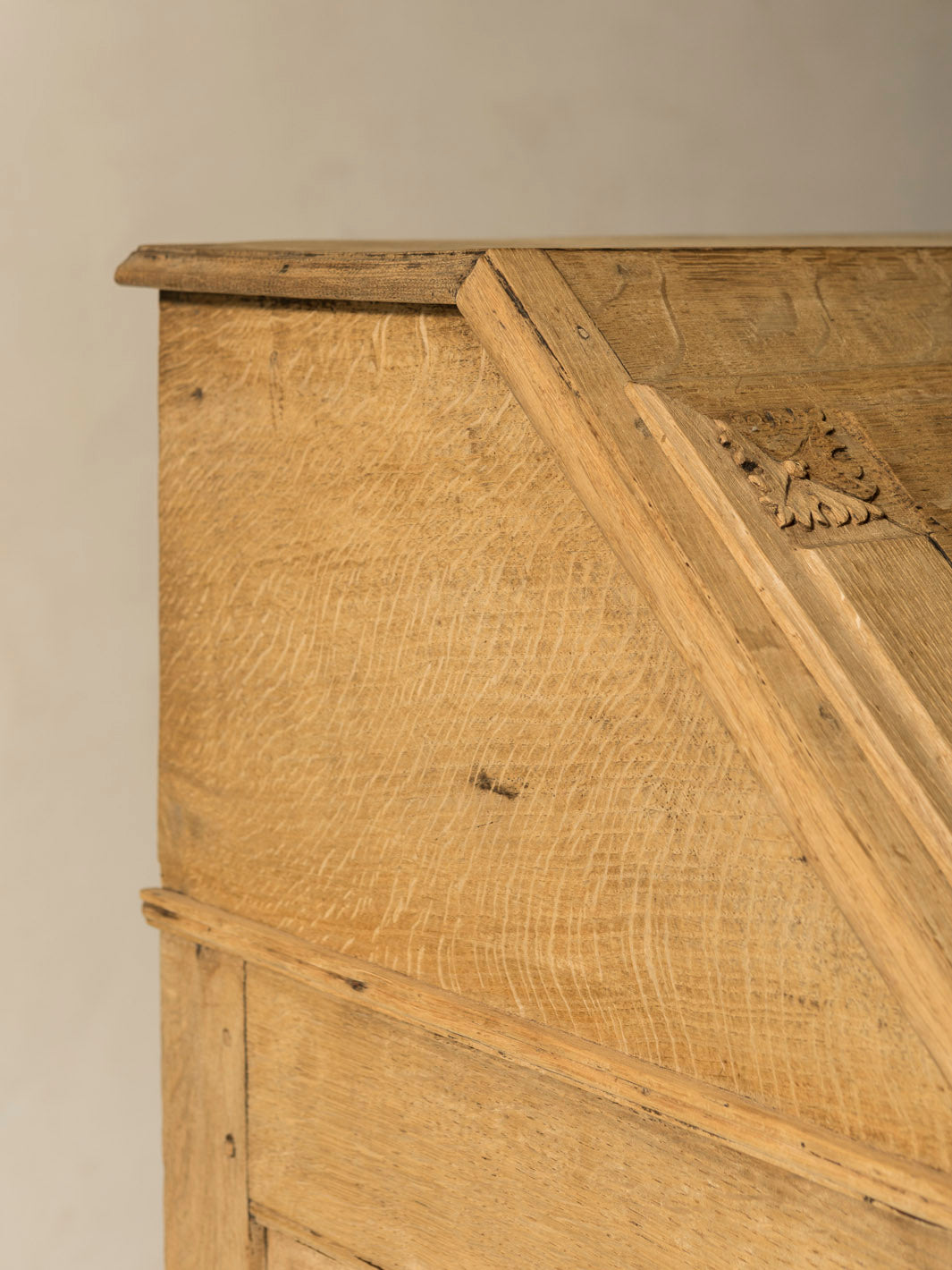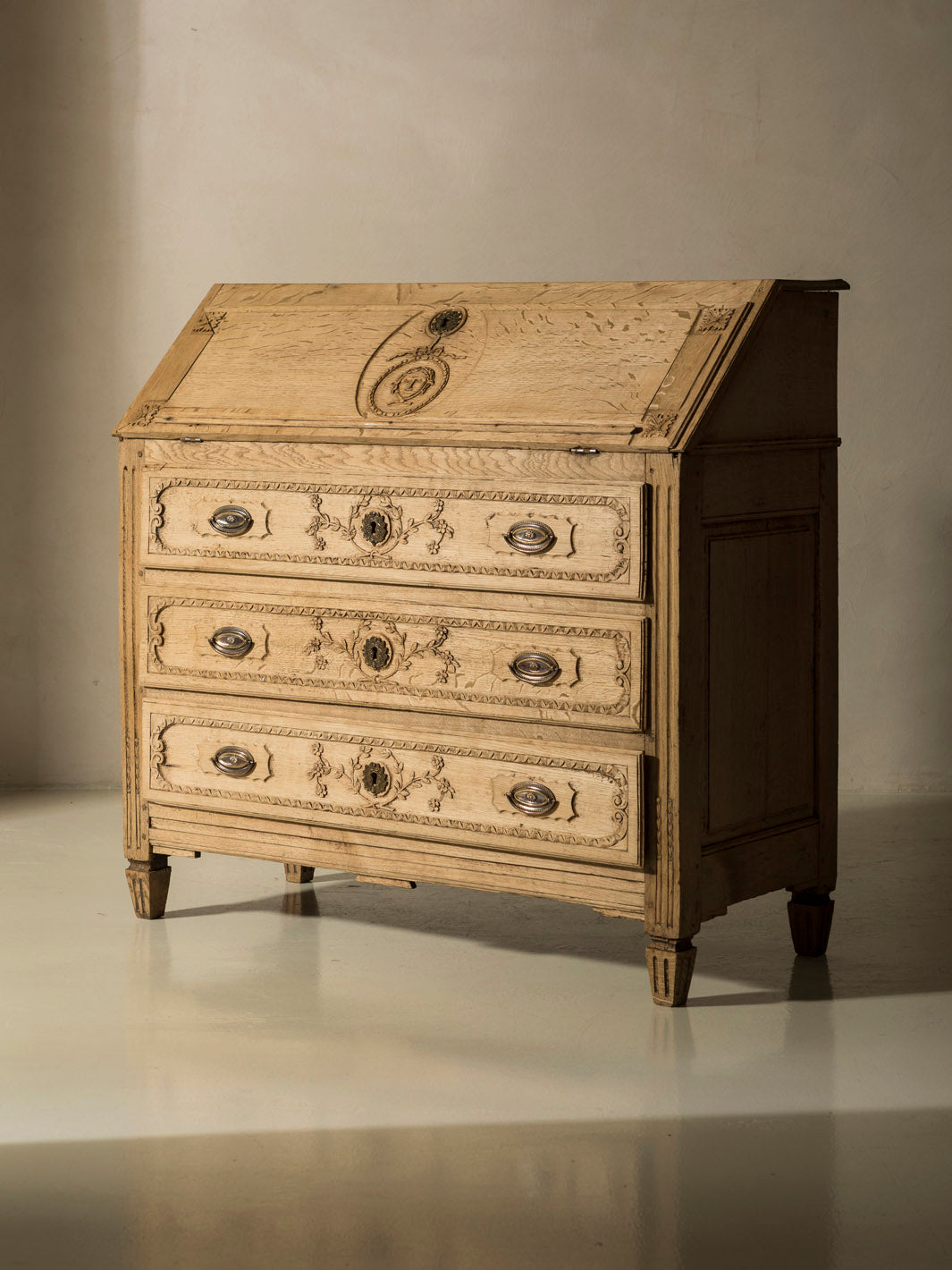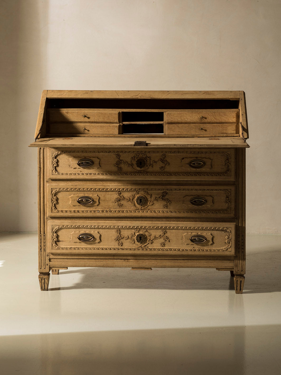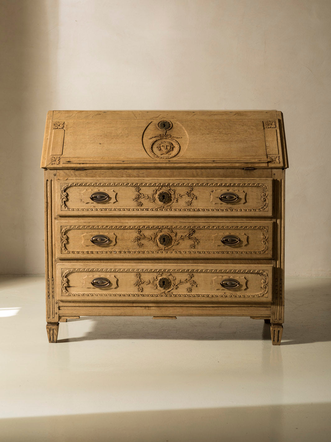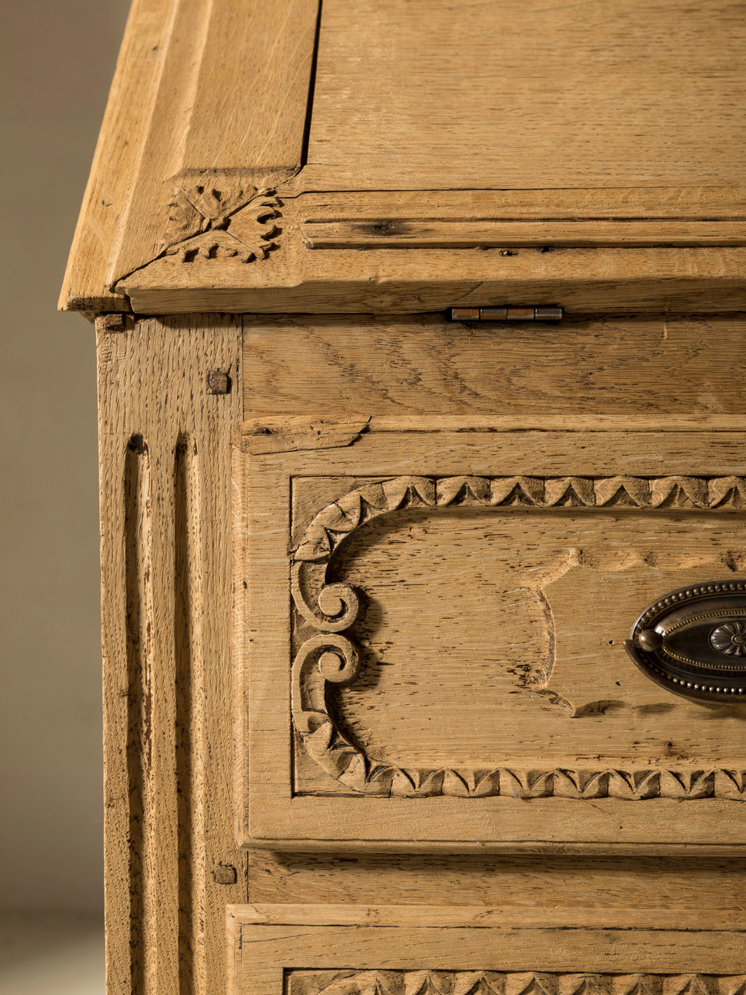 Bureau belga original de Lieja en madera de castaño del siglo XIX con talla floreada en cajones. Esta pieza, meticulosamente trabajada, es un reflejo de la tradición artesanal europea. Su diseño, destaca por sus líneas clásicas y su atractivo atemporal, elementos que se combinan para crear una estética única y distinguida. La solidez de la madera de castaño y el esmero en su acabado evidencian la maestría de los artesanos belgas, quienes supieron fusionar funcionalidad y belleza de manera extraordinaria.
