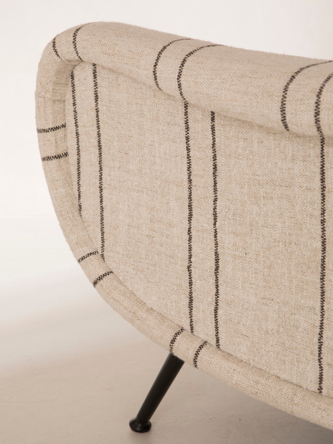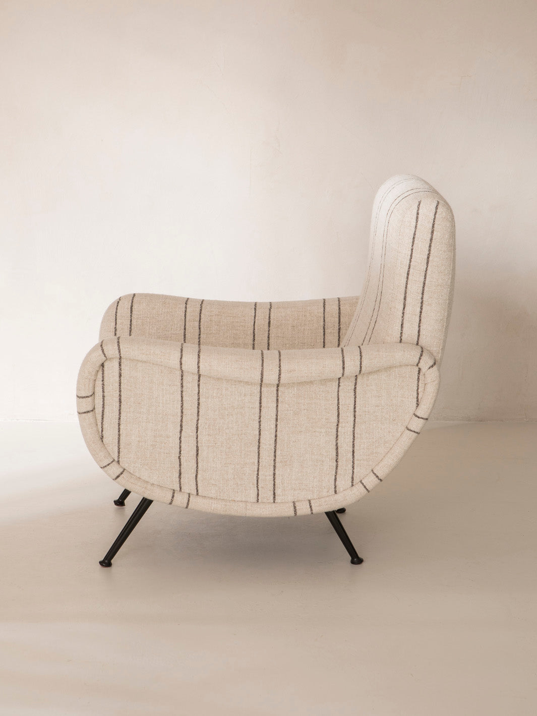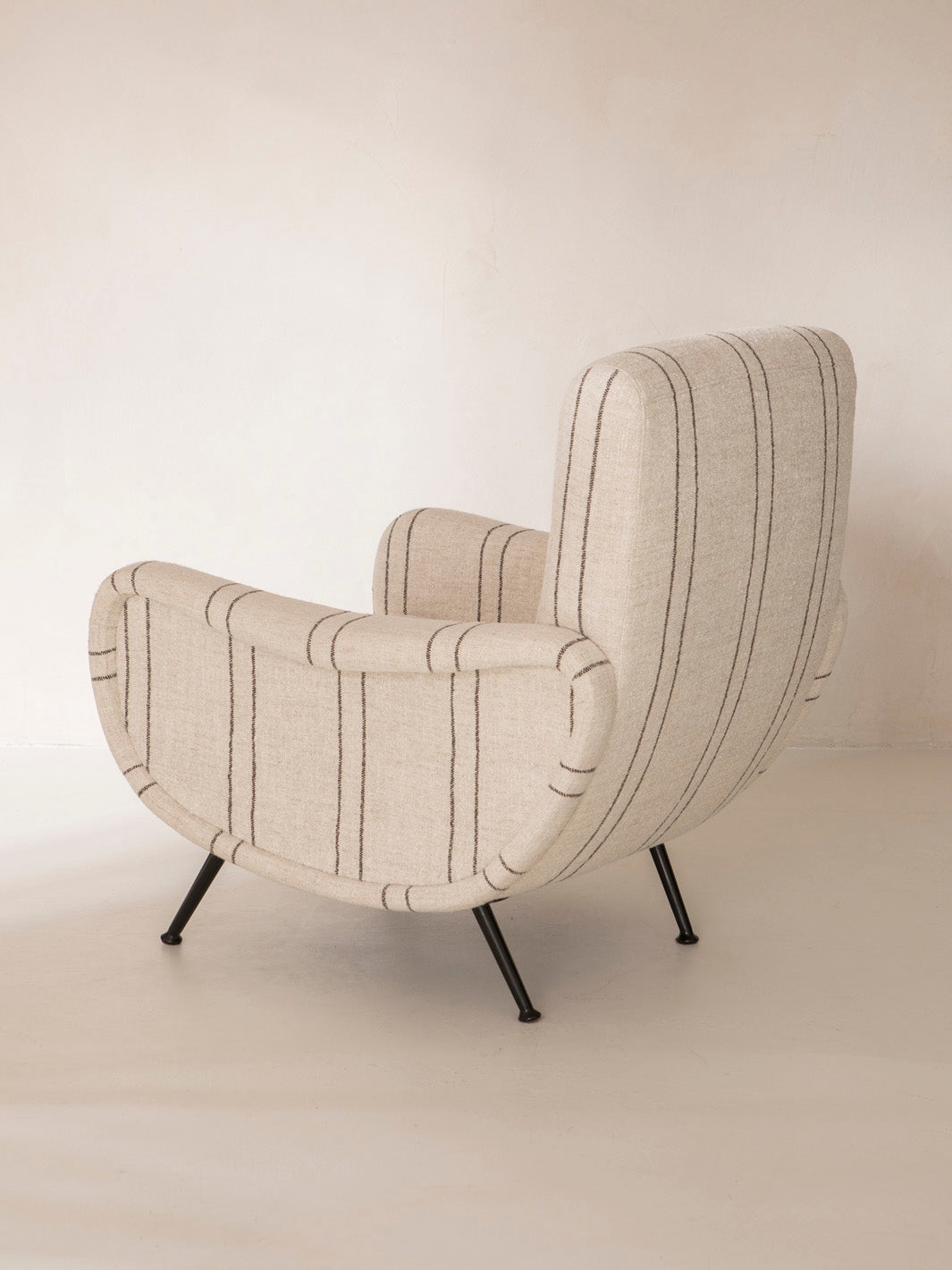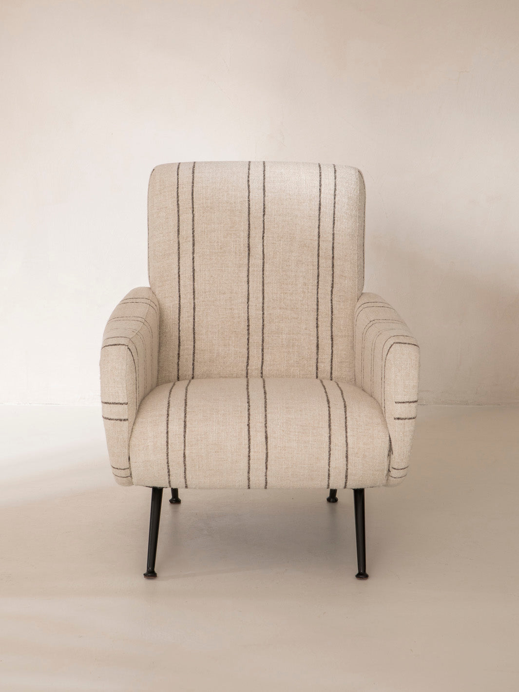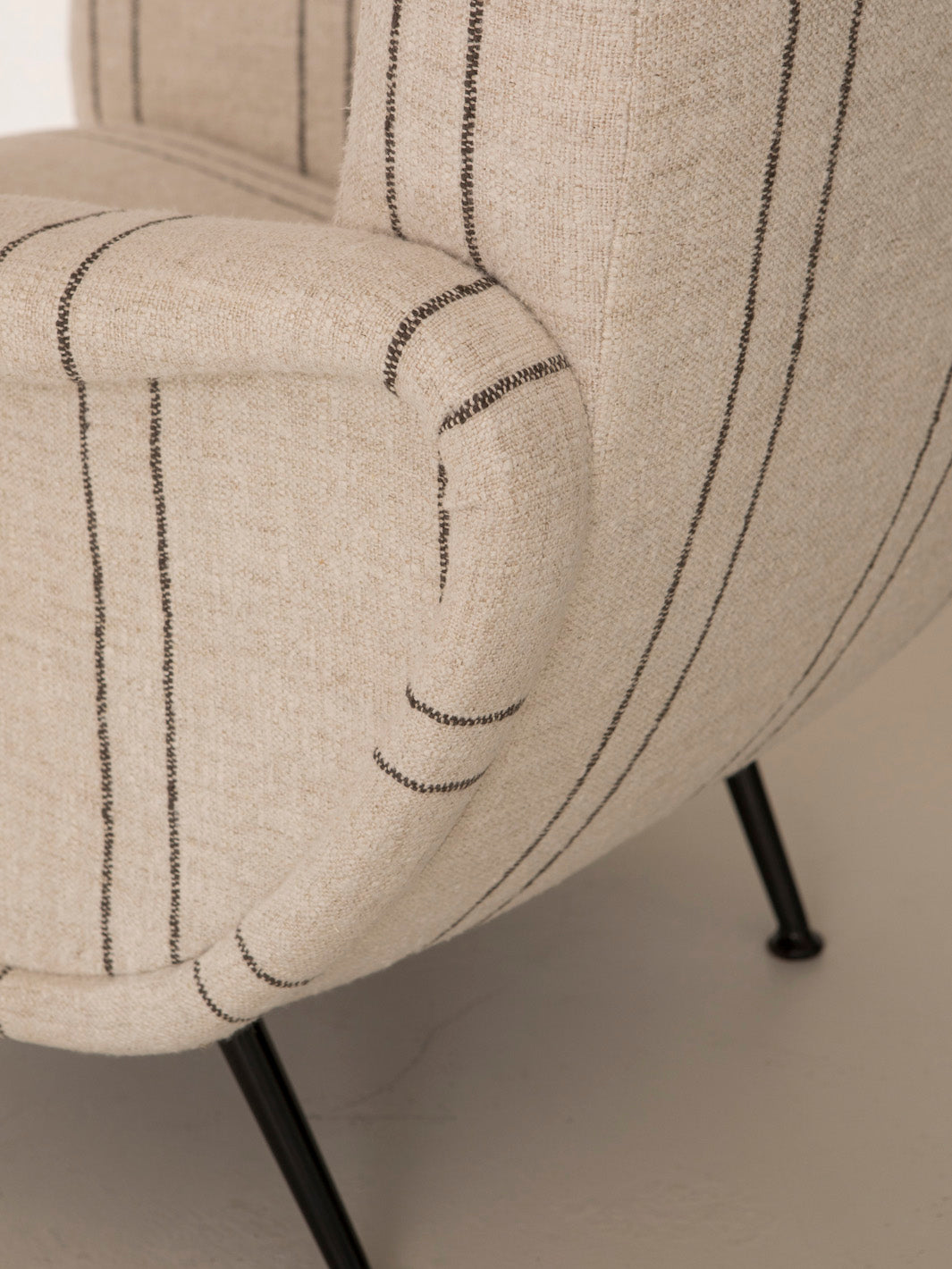Butaca de inspiración midcentury italiana, tapizada en un tejido a rayas de lino y algodón. Nuestro modelo más clásico reinterpretado en una edición contemporánea.