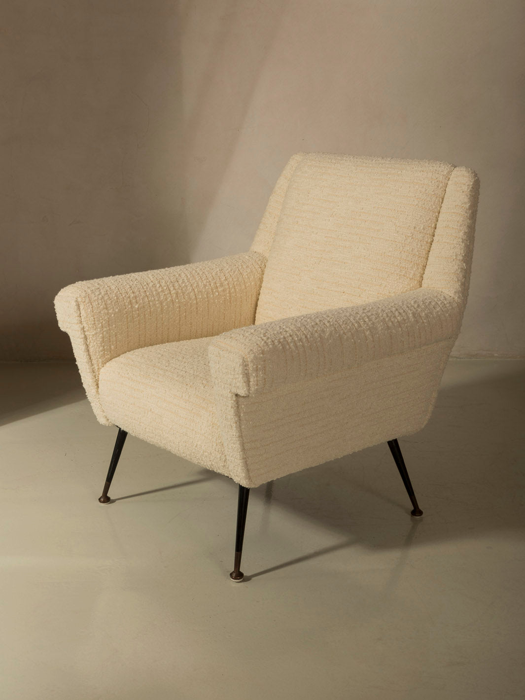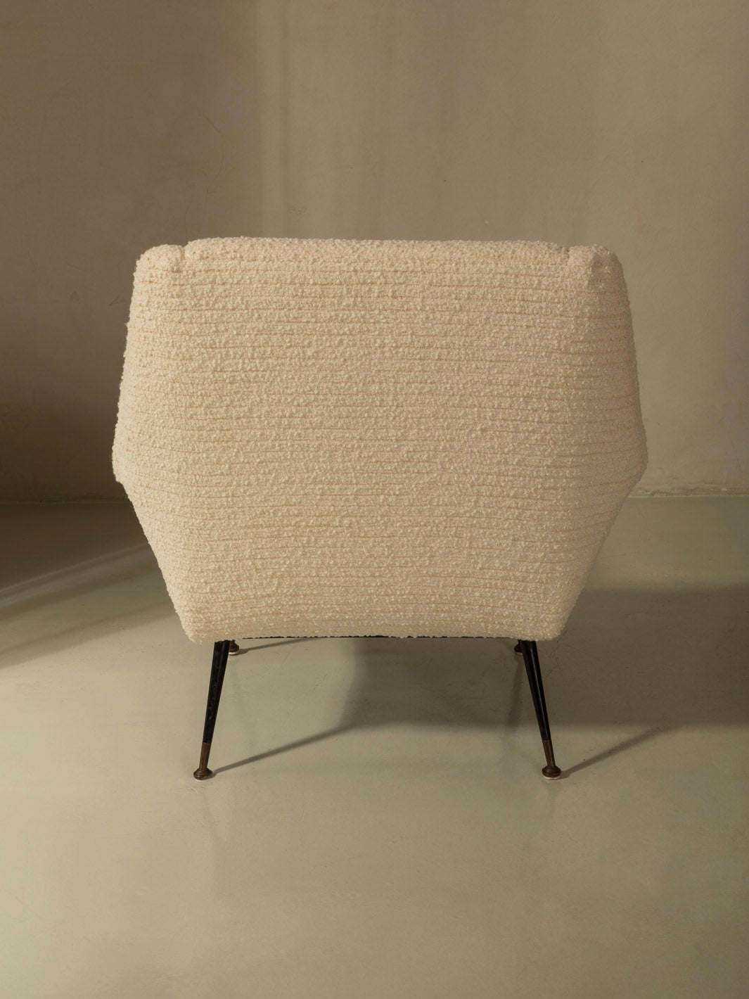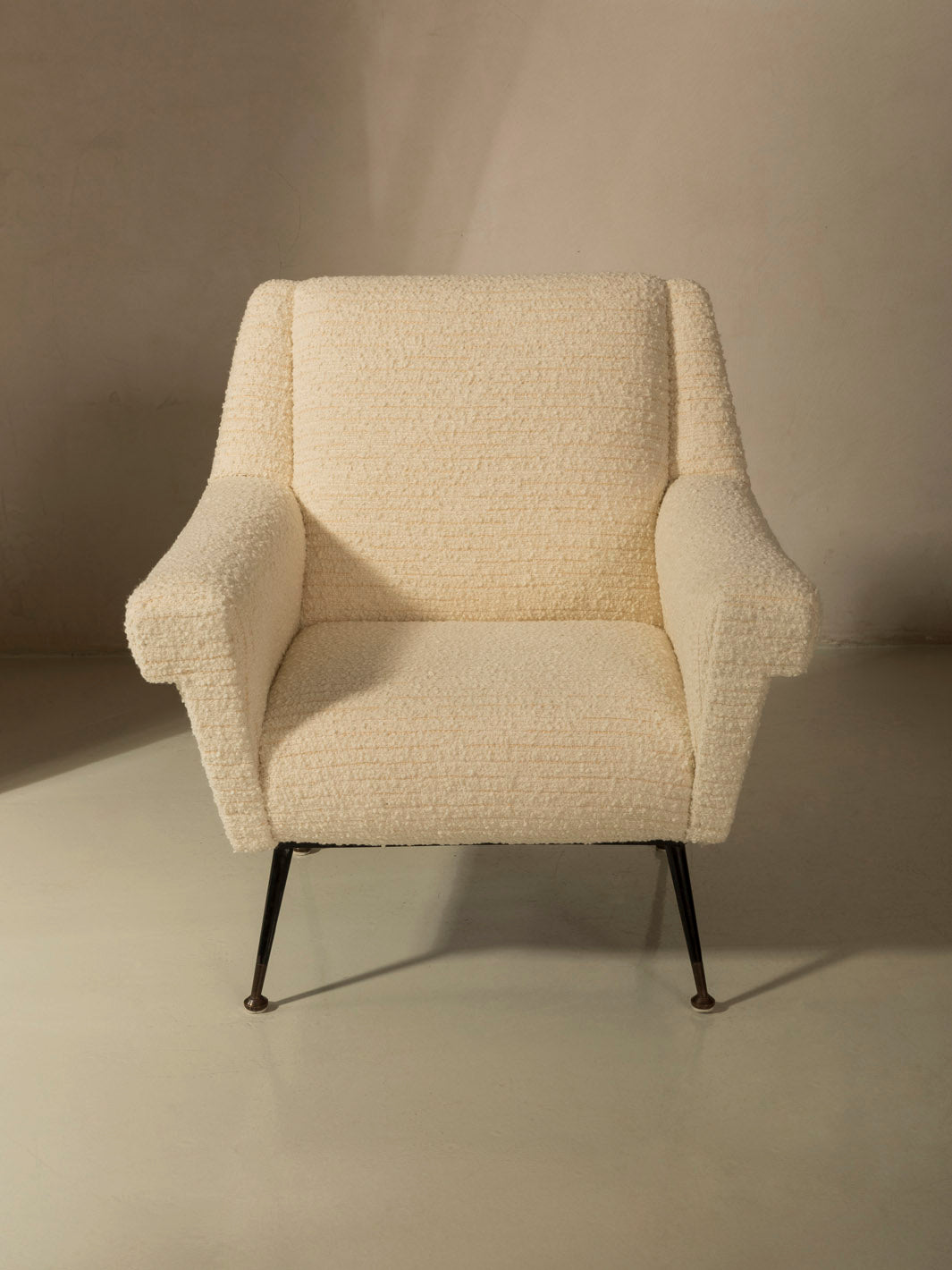 Pareja de butacas italianas estilo midcentury, una fusión perfecta entre elegancia atemporal y envolvente comodidad. Su diseño estructural sobrio y estilizado destaca por las patas metálicas delgadas que contrastan con los generosos volúmenes del asiento y respaldo, tapizados en color crema. Esta combinación de texturas y líneas limpias evoca el refinamiento del diseño moderno de mediados del siglo XX, ideal para aportar calidez y sofisticación a cualquier espacio contemporáneo.