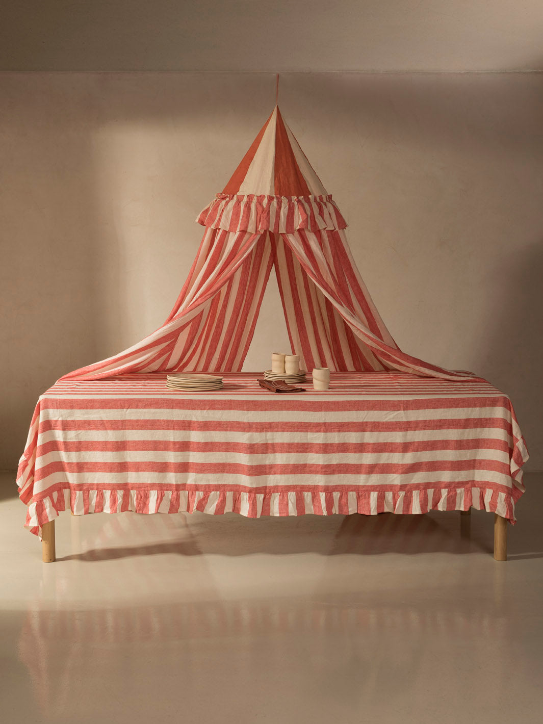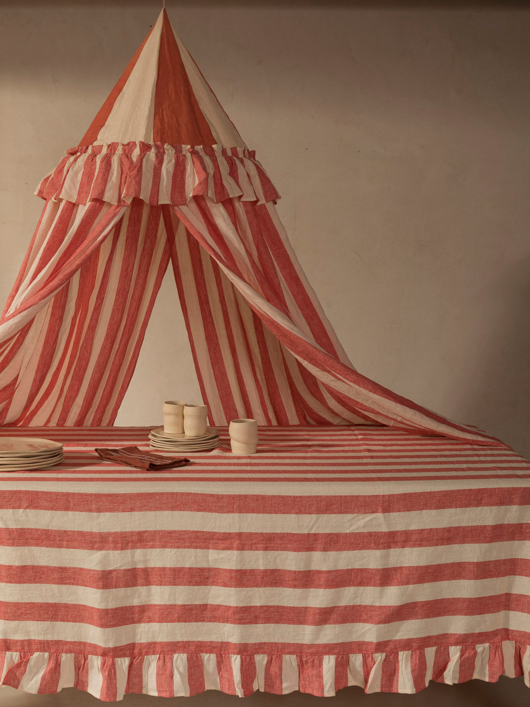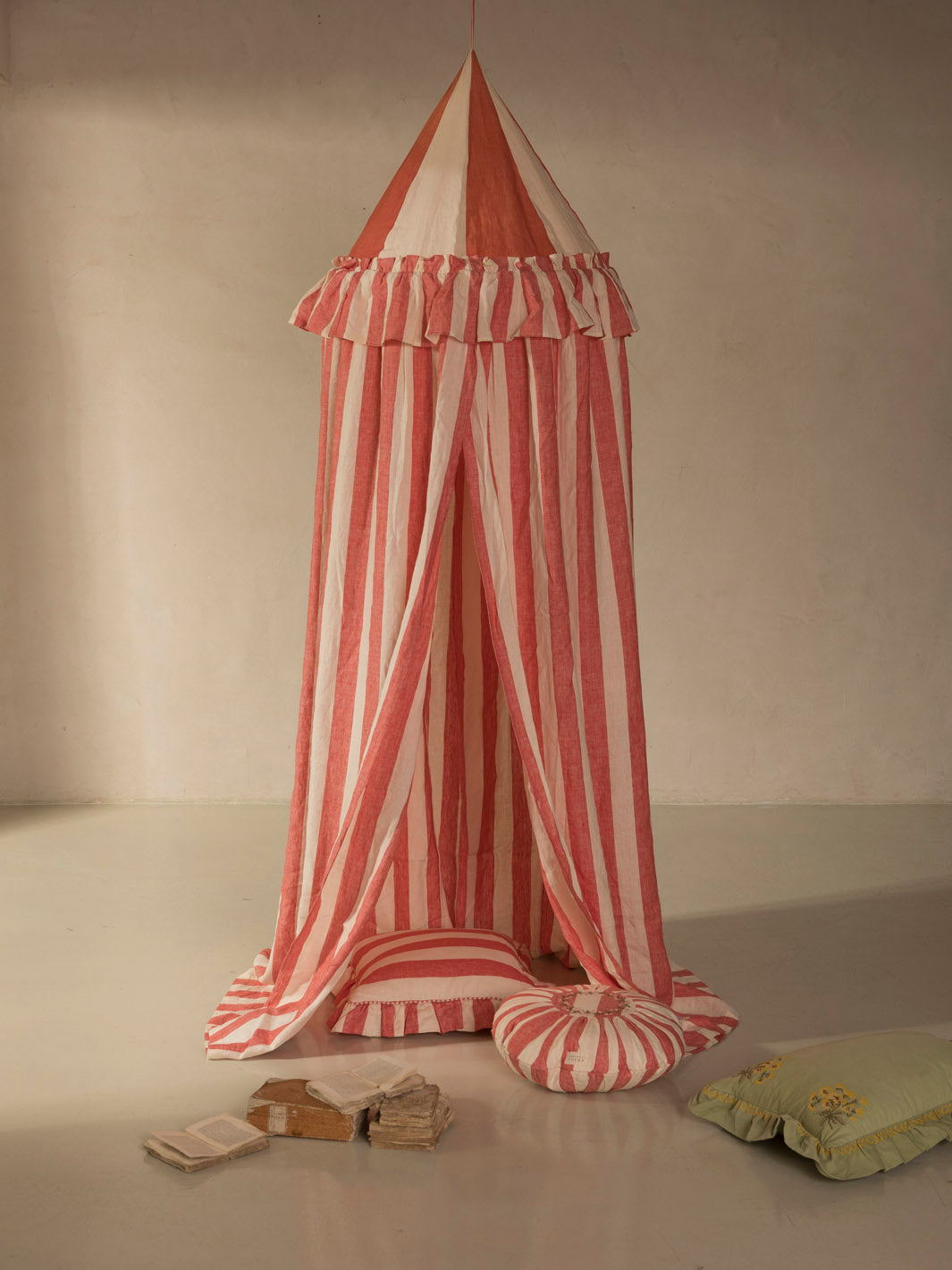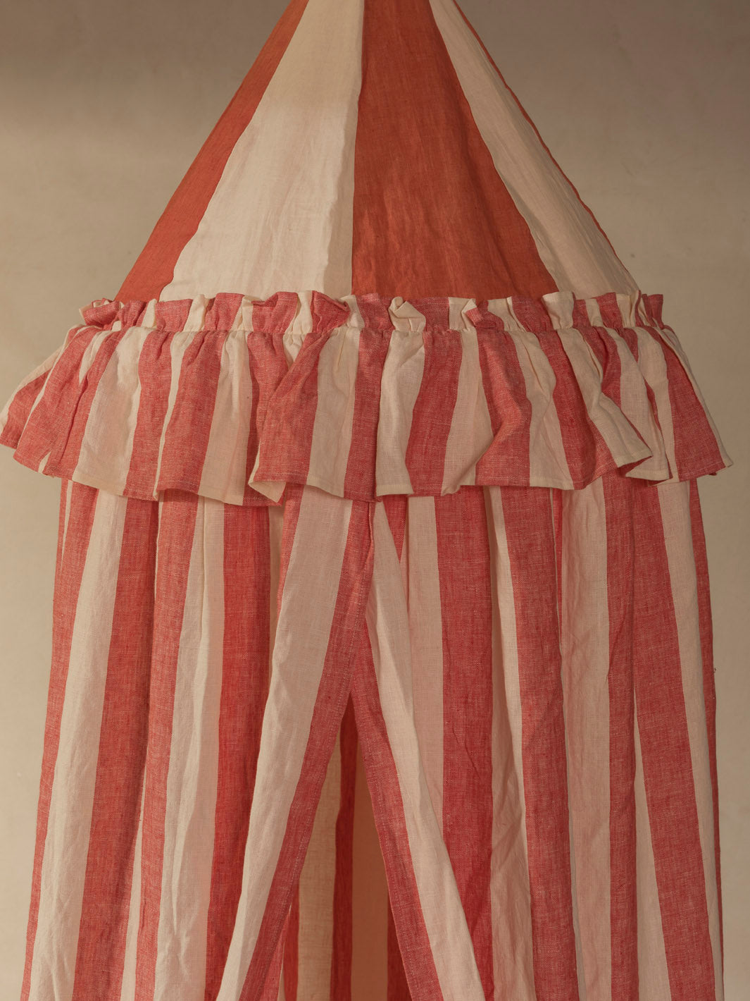 Dosel de rayas en color fresa. Está hecho a mano con más de 6 metros de lino 100%. Está compuesto por dos cortinas independientes para que el dosel pueda abrirse tanto como se desee.