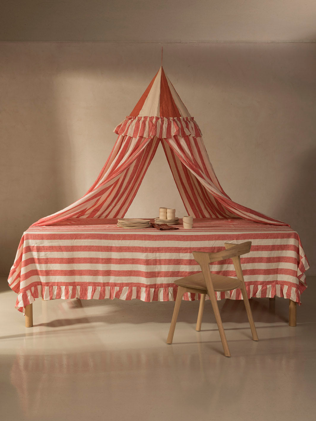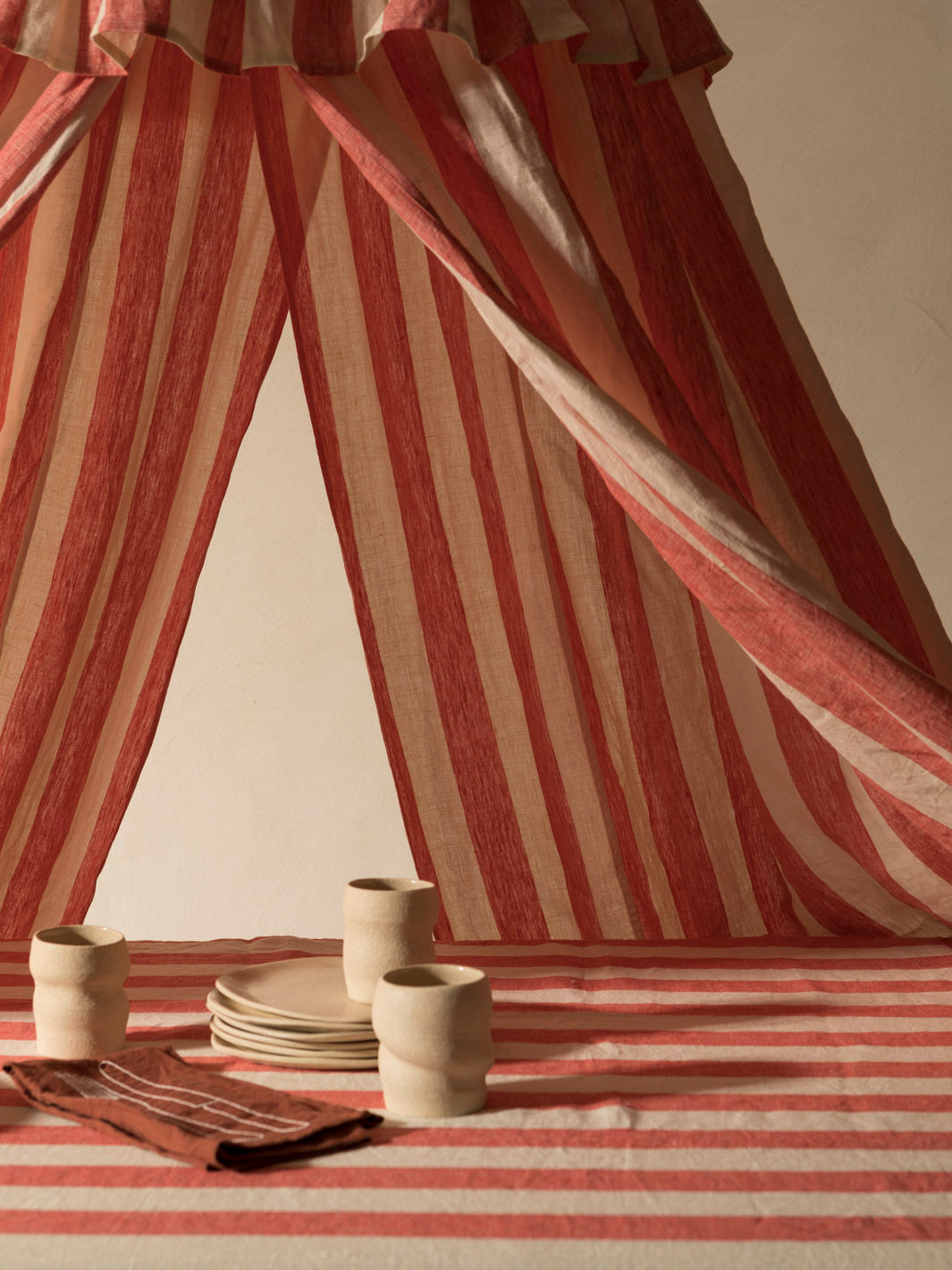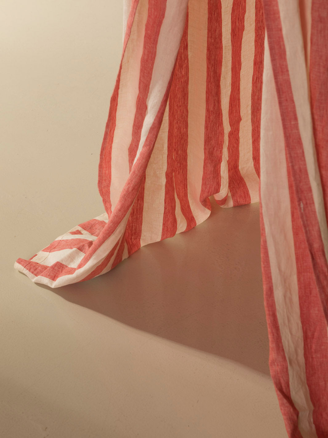 Dosel de rayas en color fresa. Está hecho a mano con más de 6 metros de lino 100%. Está compuesto por dos cortinas independientes para que el dosel pueda abrirse tanto como se desee.
