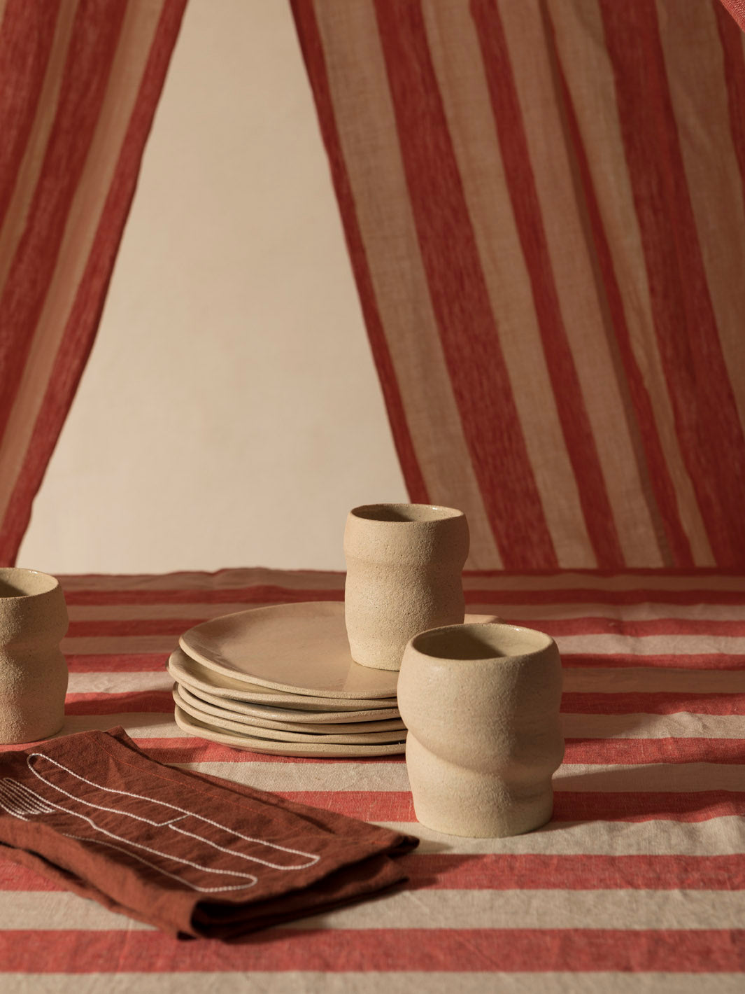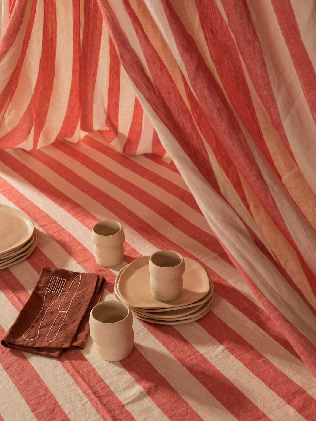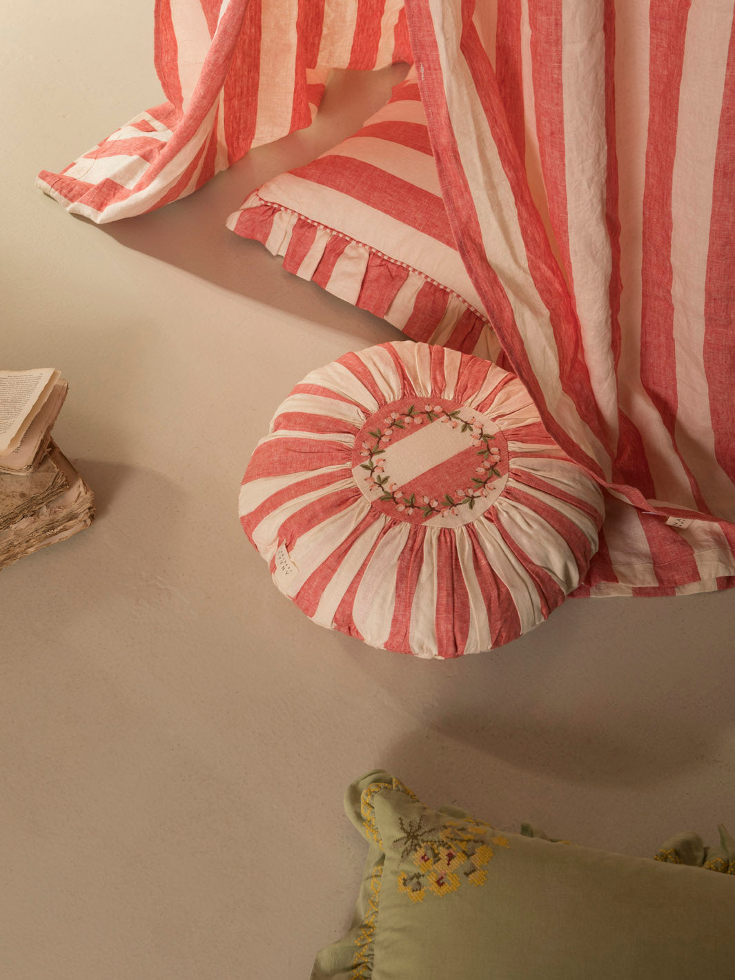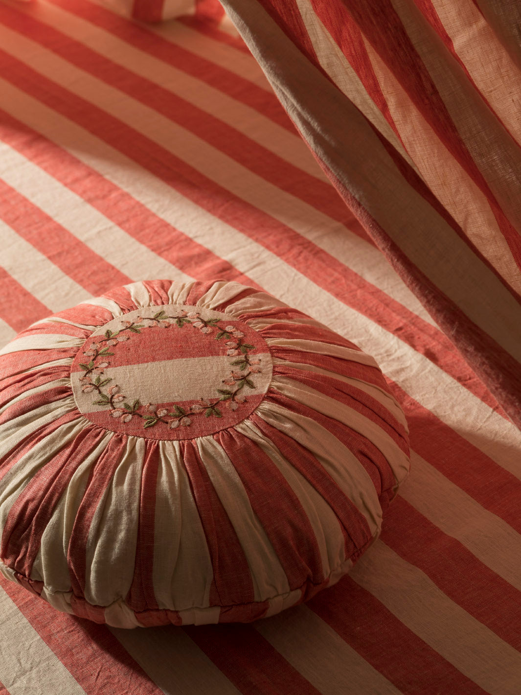 Dosel de rayas en color fresa. Está hecho a mano con más de 6 metros de lino 100%. Está compuesto por dos cortinas independientes para que el dosel pueda abrirse tanto como se desee.