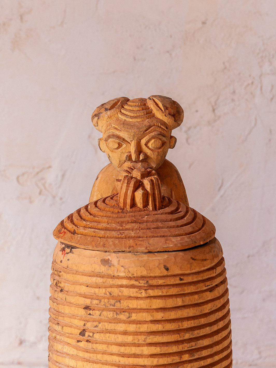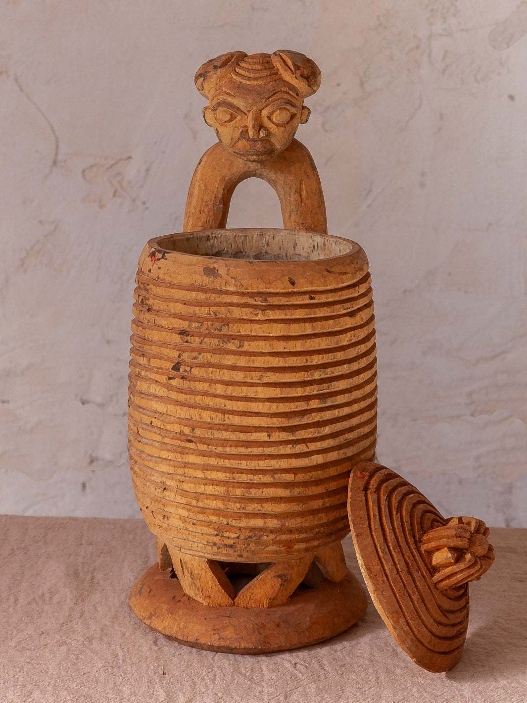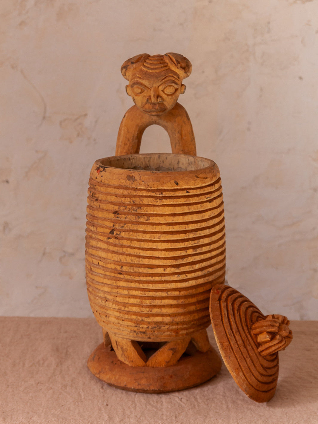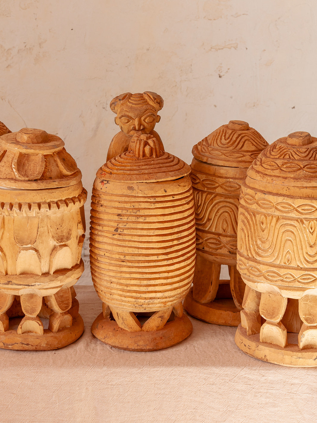 Se trata de cofres relicarios tradicionales de la etnia Bamileke. Están tallados en una única pieza de madera de eyong sin tratamiento, con geometrías y figuraciones propias de sus creencias, con relieves que adoptan distintas posiciones en un intento de romper la simetría.