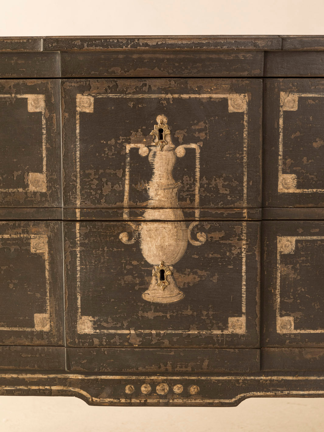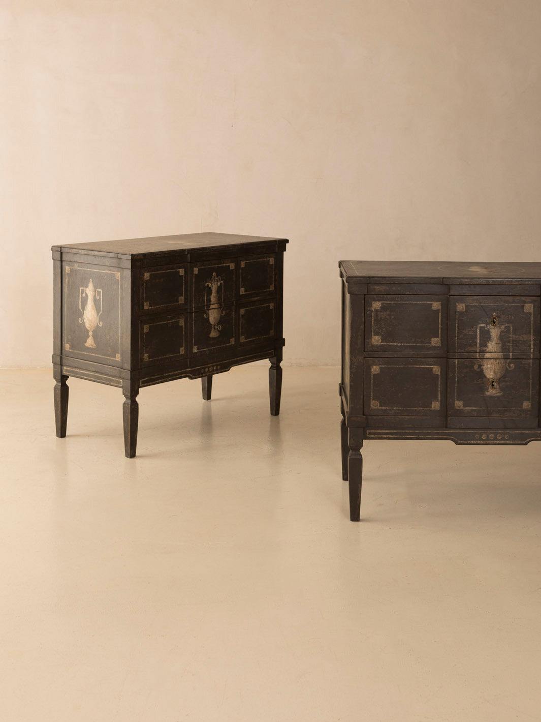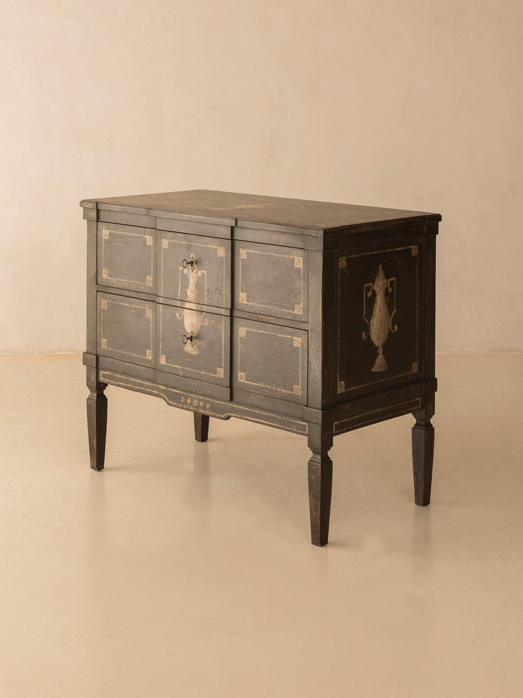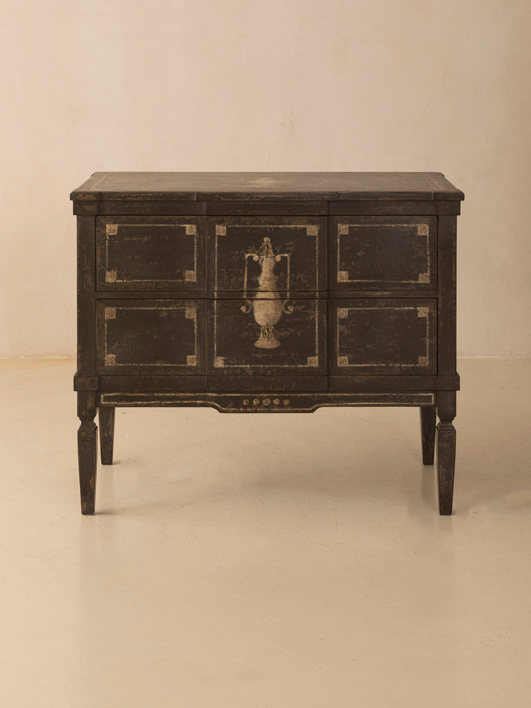 Cómoda alemana original de Baviera, con una delicada pátina negra y unos decorados de ánforas en color marfil. Una pieza que reúne lo mejor del mobiliario clásico en una pieza contemporánea.