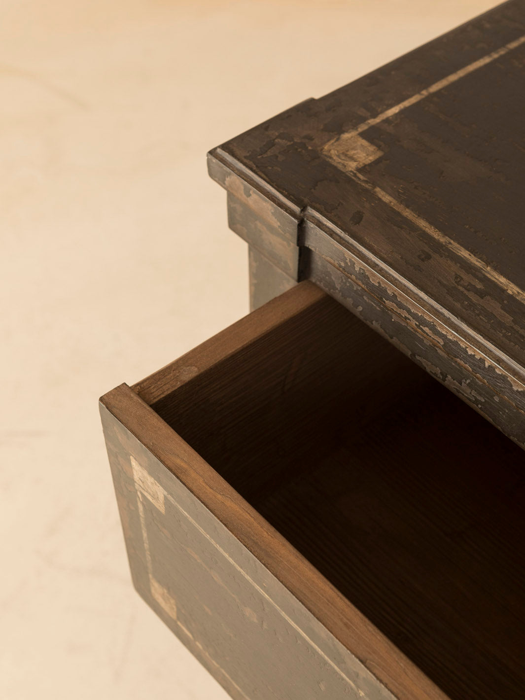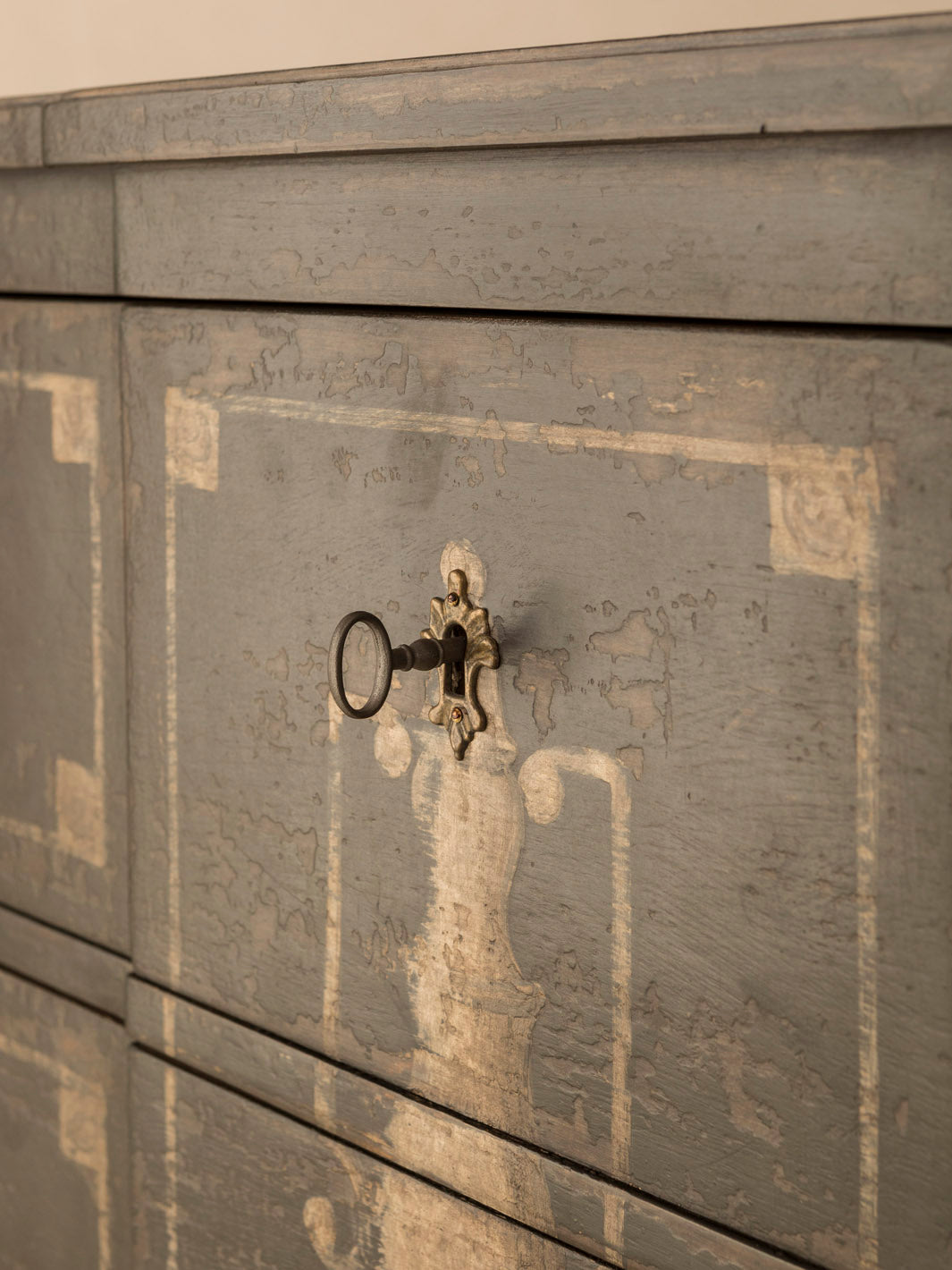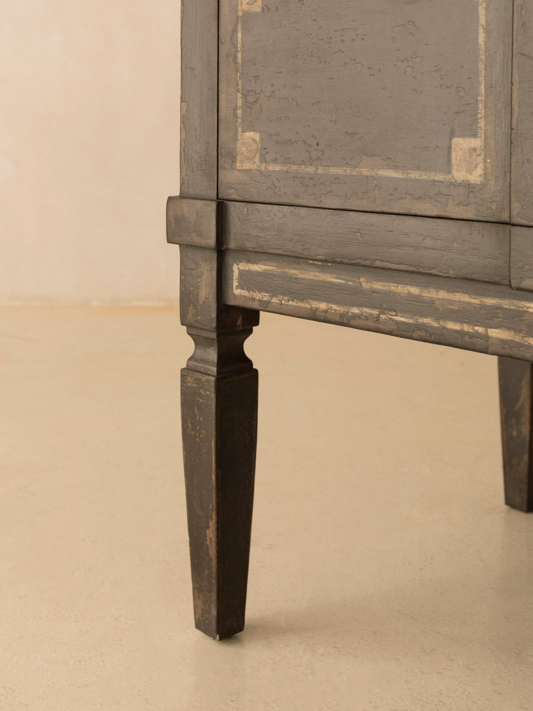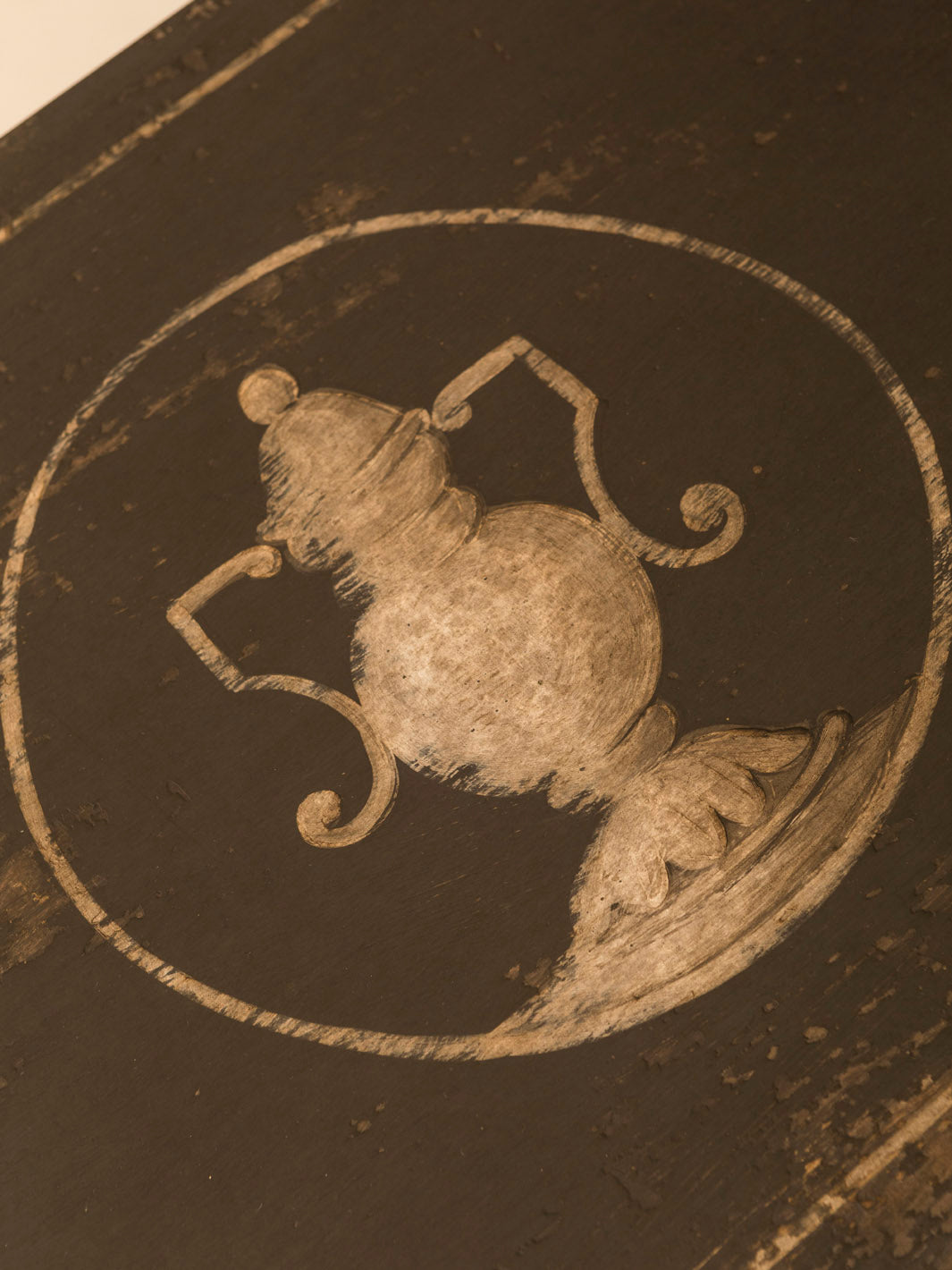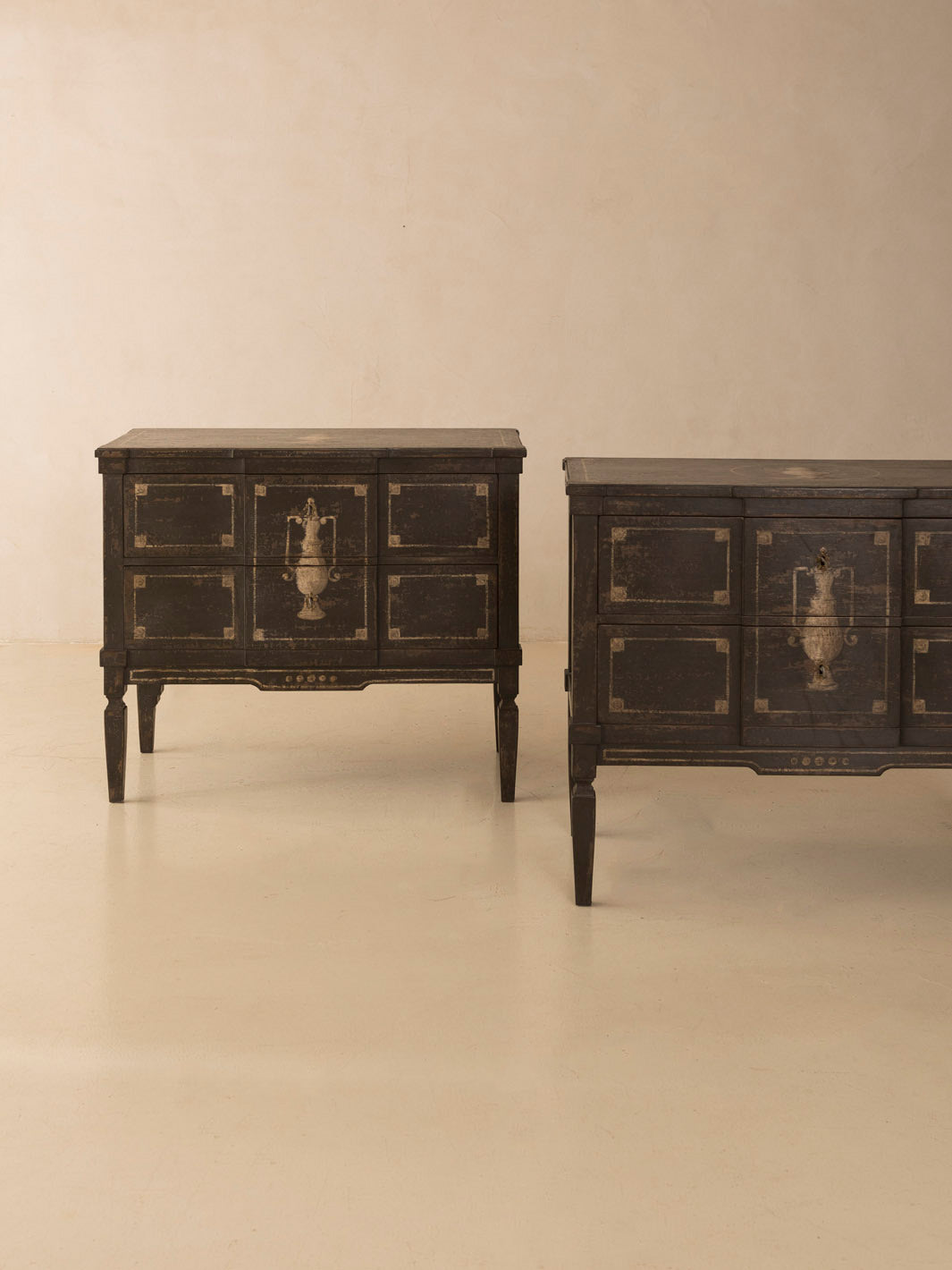 Cómoda alemana original de Baviera, con una delicada pátina negra y unos decorados de ánforas en color marfil. Una pieza que reúne lo mejor del mobiliario clásico en una pieza contemporánea.