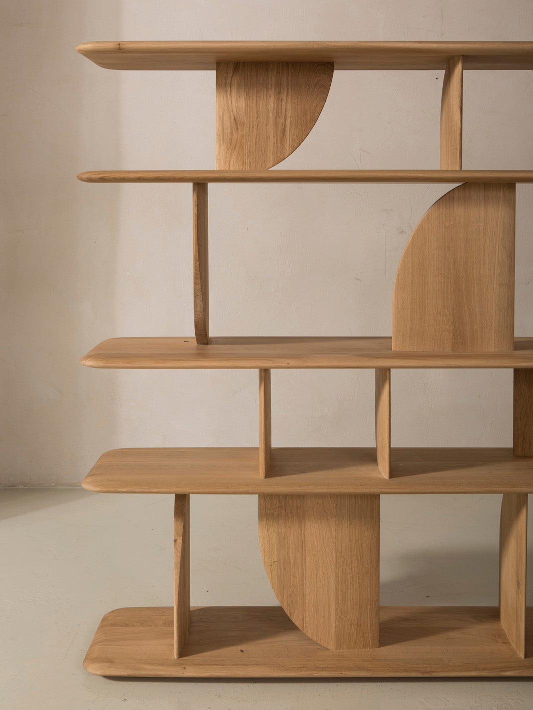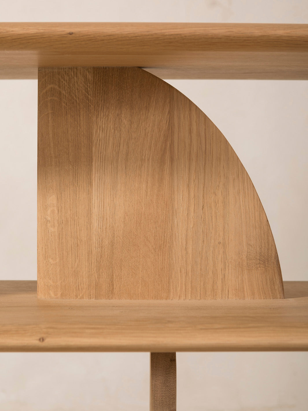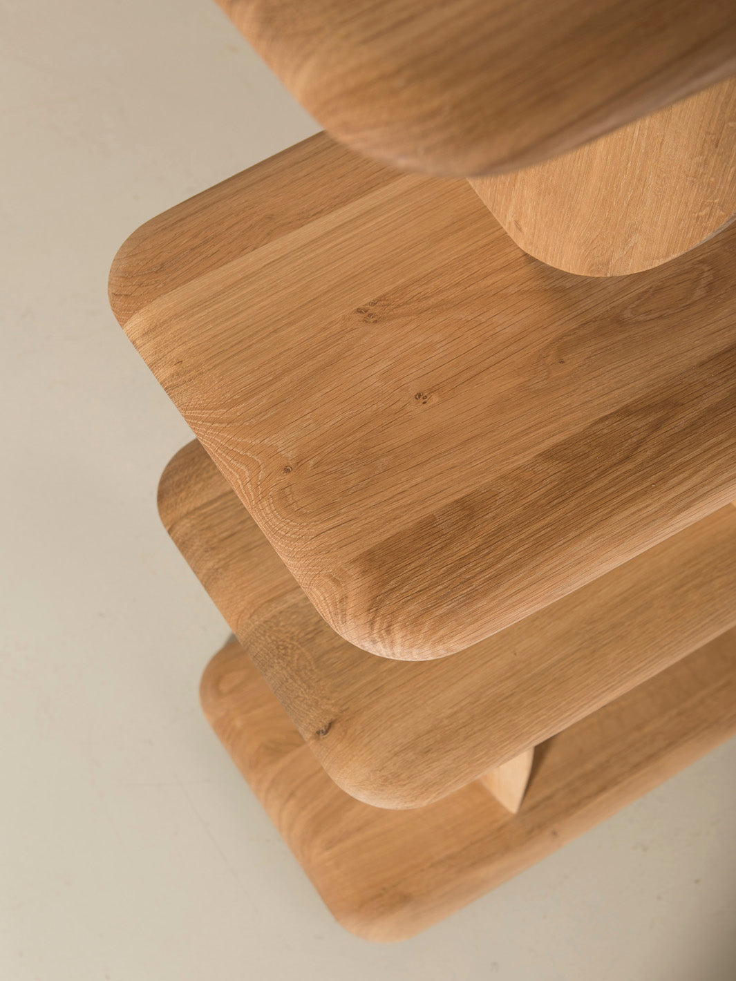 En la colección Geometric de Ethnicraft, las formas se entrecruzan de forma inesperada, creando divertidos contrastes con luces y sombras en todos los ángulos. Este diseño está realizado en madera de roble maciza.