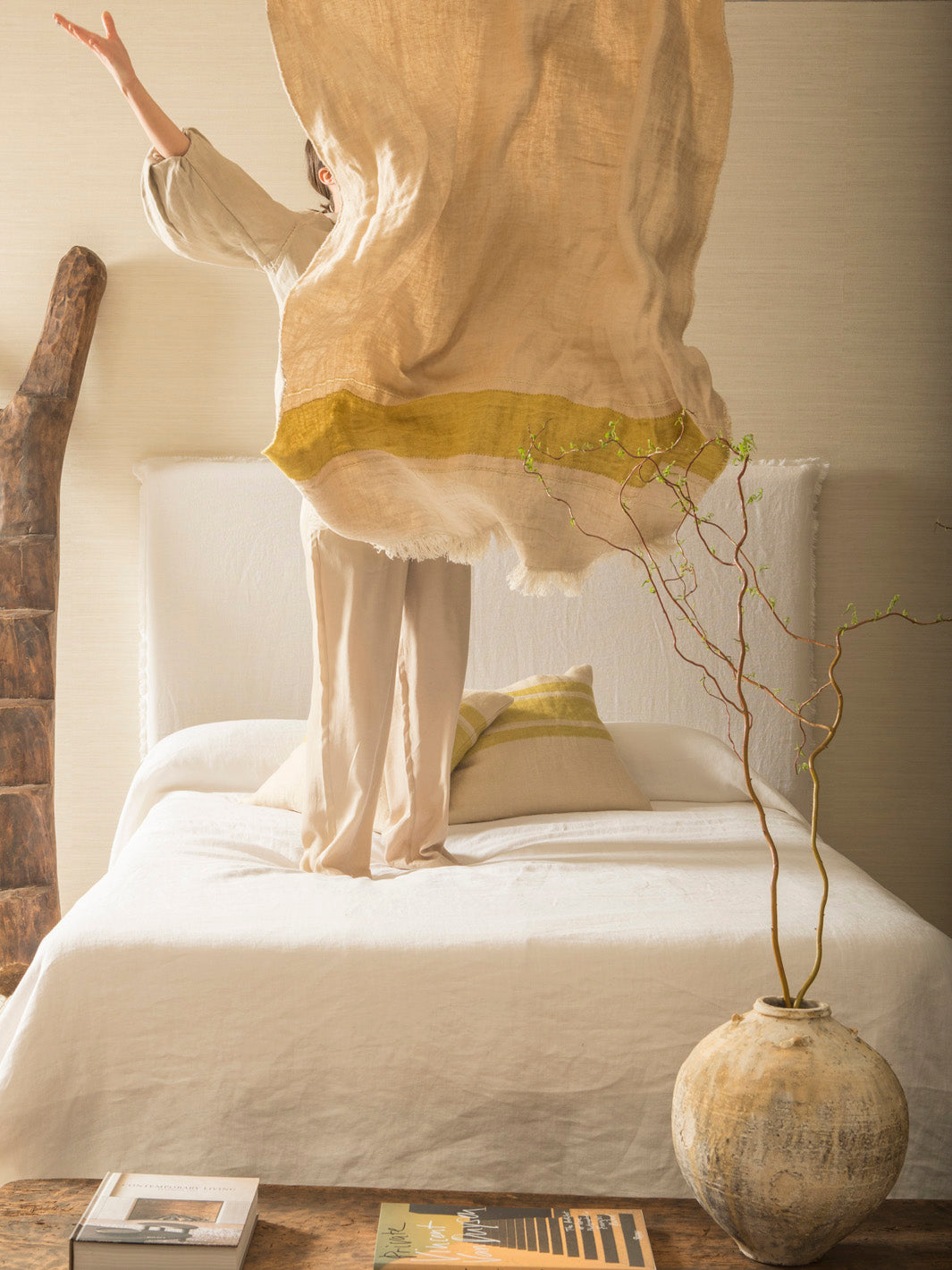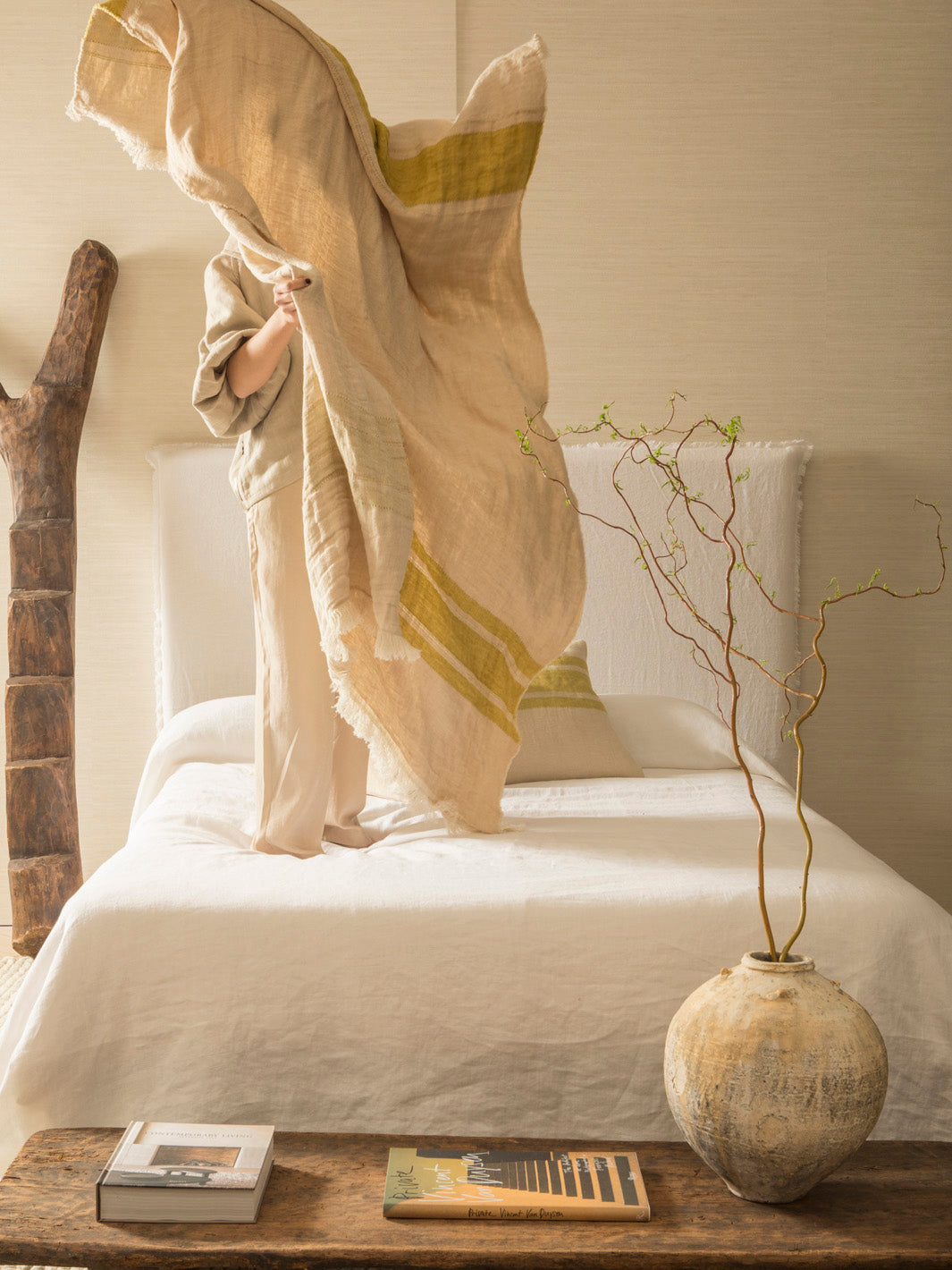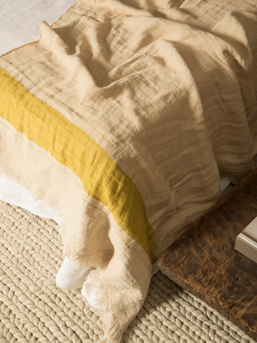 Plaid en lino natural de la firma Libeco. Su agradable tacto, su resistencia y su calidad lo convierten en un complemento ideal para tu salón o dormitorio.