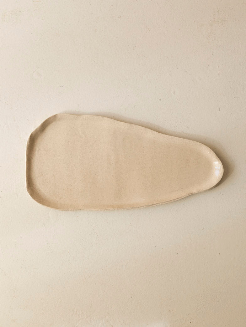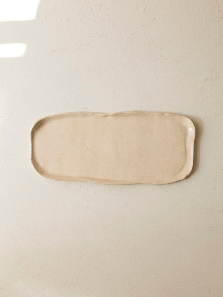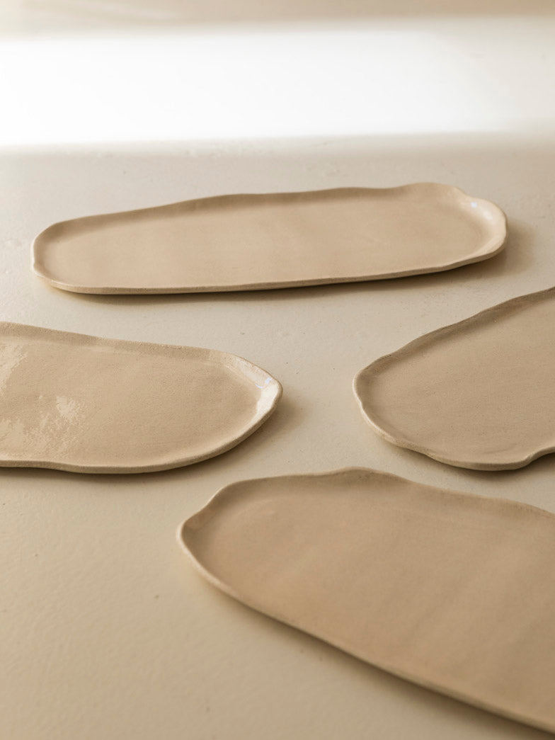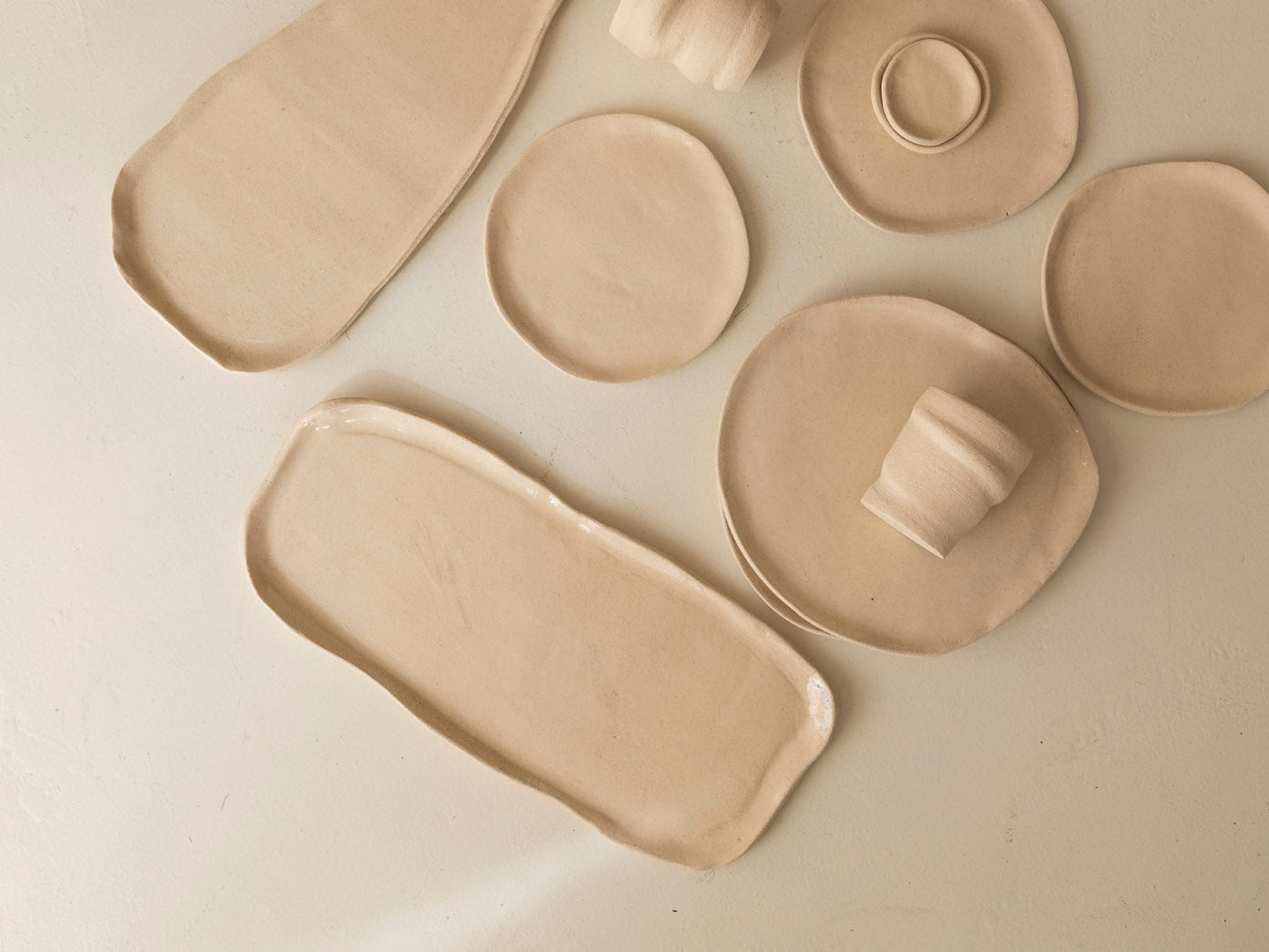 Fuente llana artesanal de cerámica en color crudo, diseñada en exclusiva por Omé Studios para RV74.