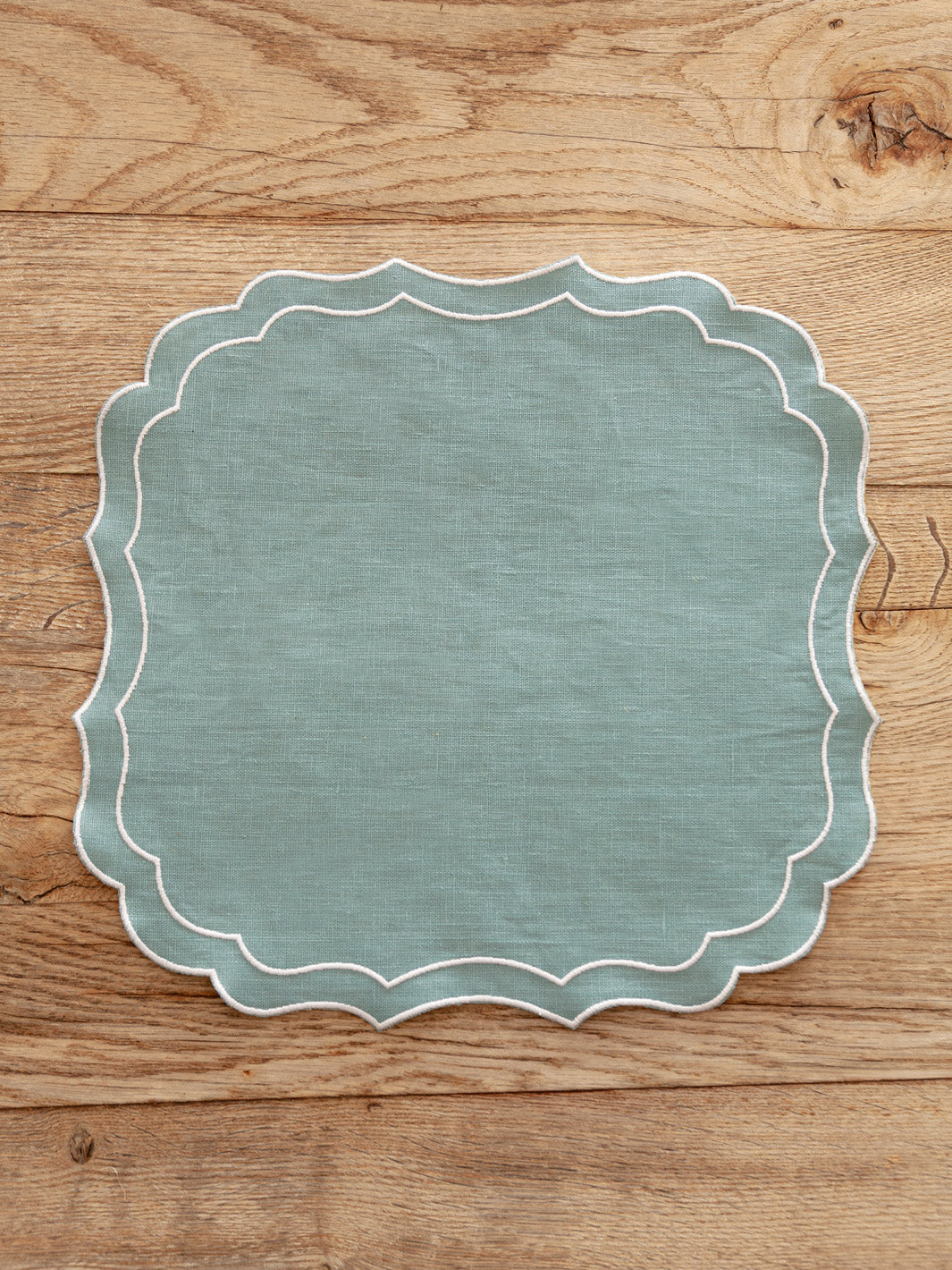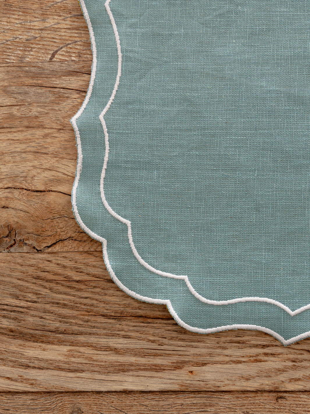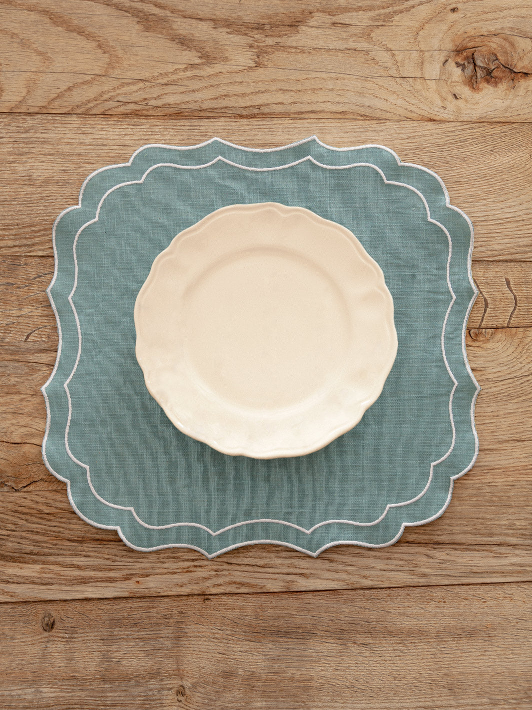 Mantel individual de lino italiano encerado con vivos blancos bordados. Su particular tratamiento le aporta impermeabilidad haciéndolo mucho más resistente a las manchas.