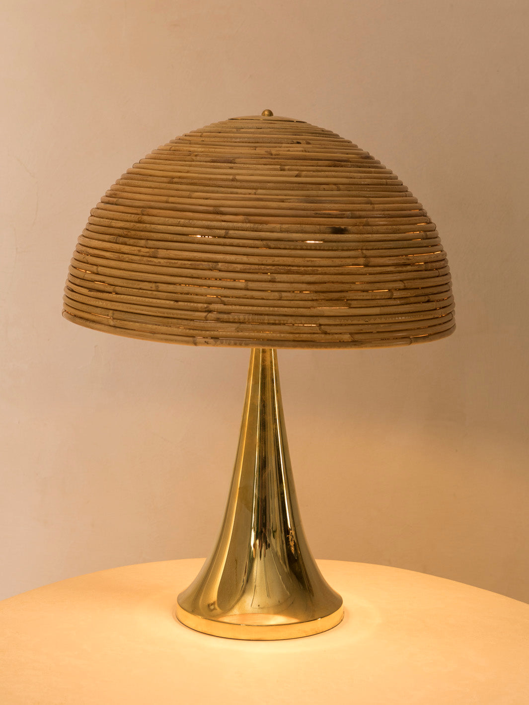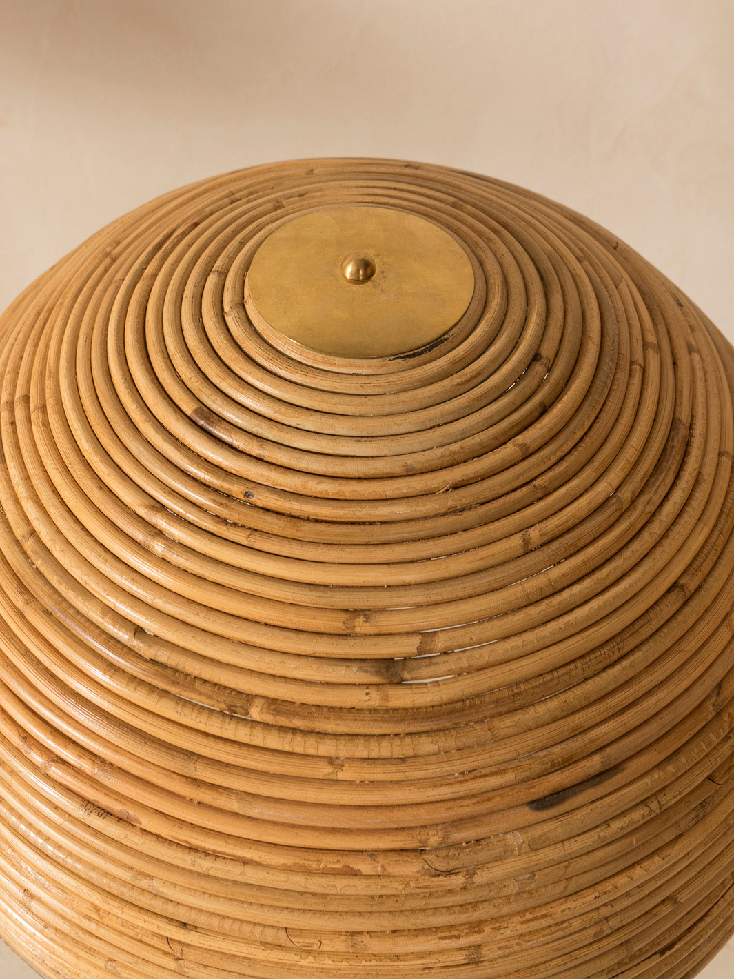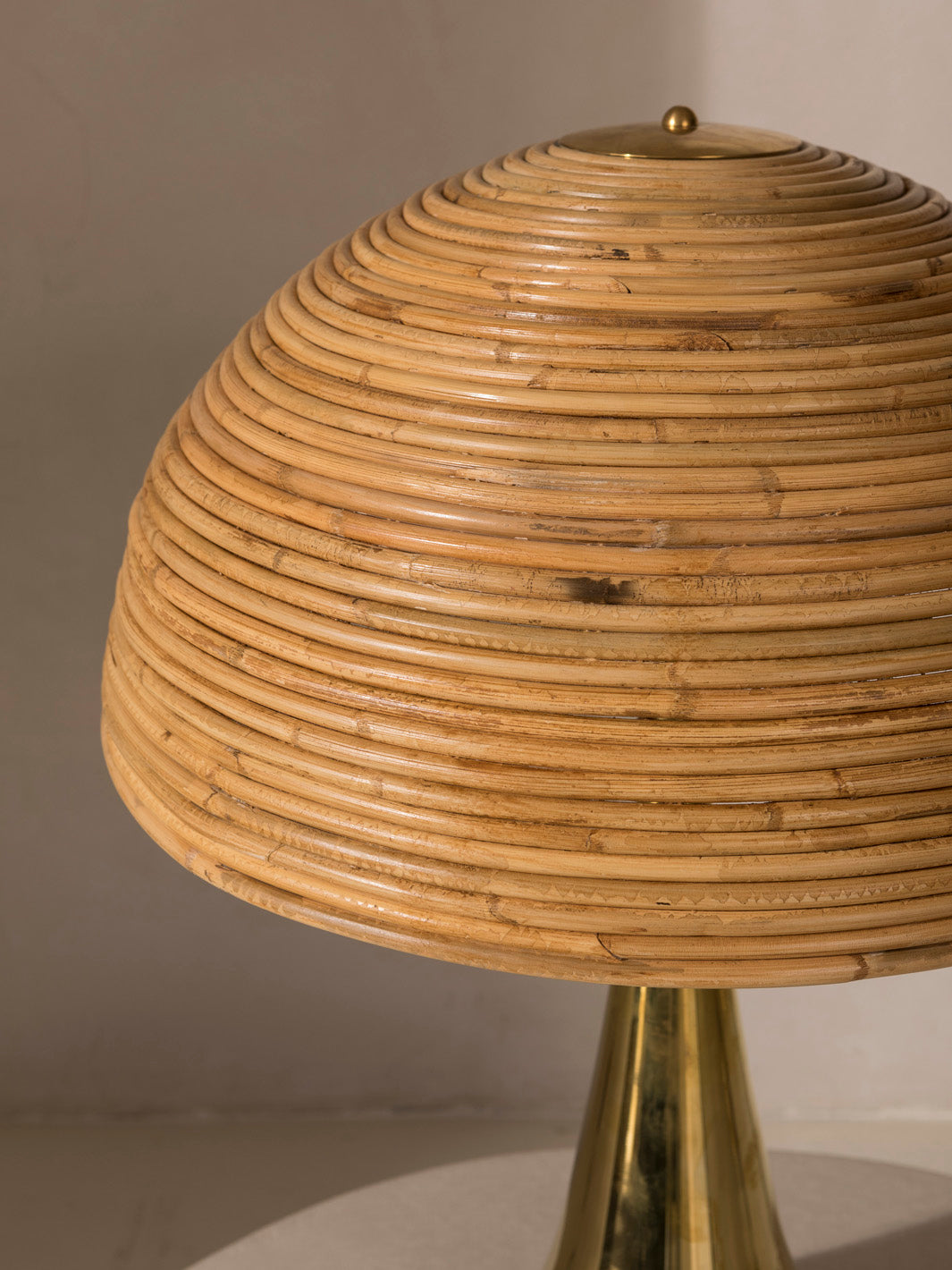 Lámpara de sobremesa artesanal original de Italia, trabajada en bambú con base de latón, inspirada en el estilo Palm Beach Regency años 60.