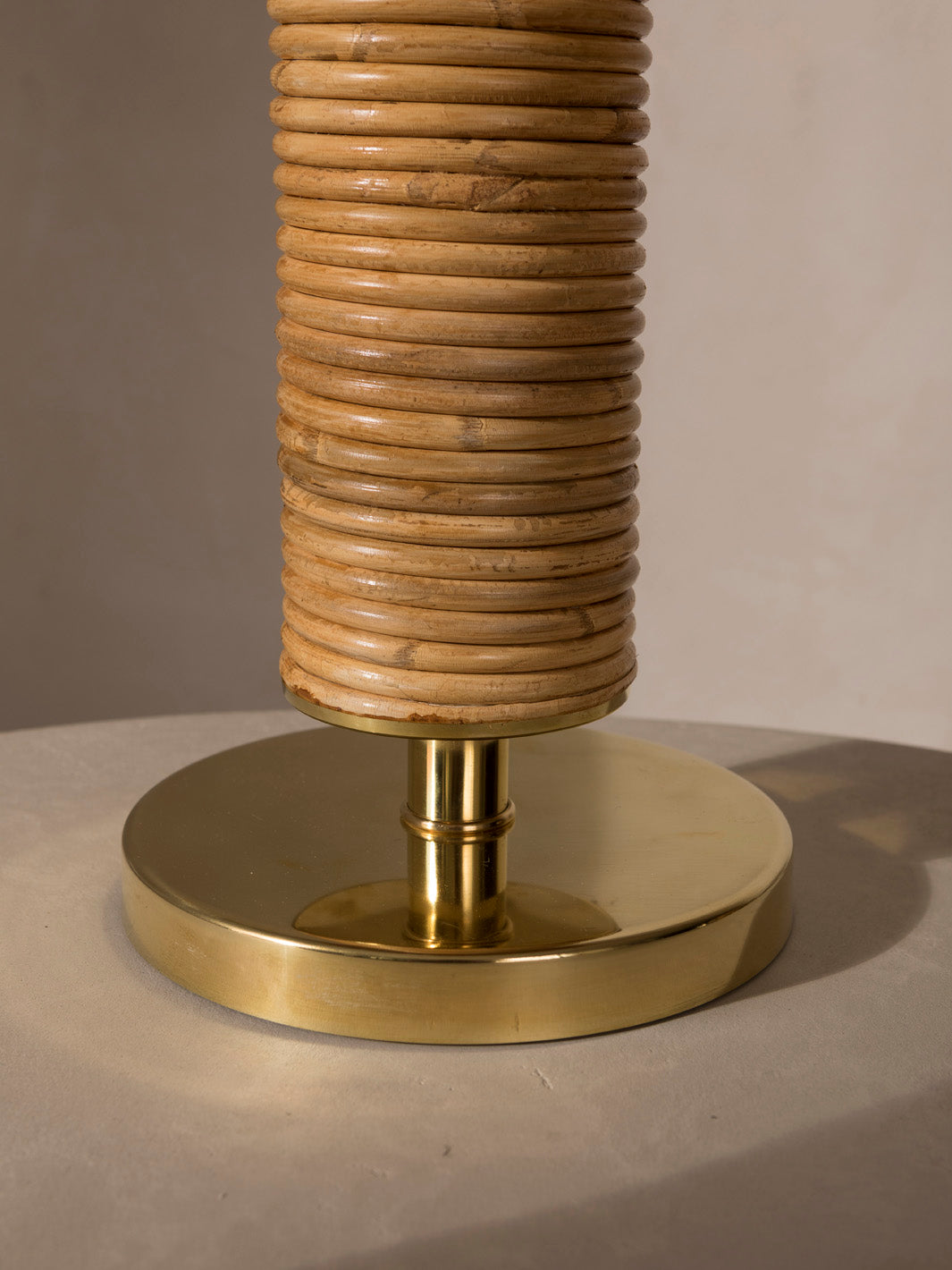 Lámpara de sobremesa artesanal original de Italia, trabajada en bambú con detalles en latón, inspirada en el estilo Palm Beach Regency de los años 60.