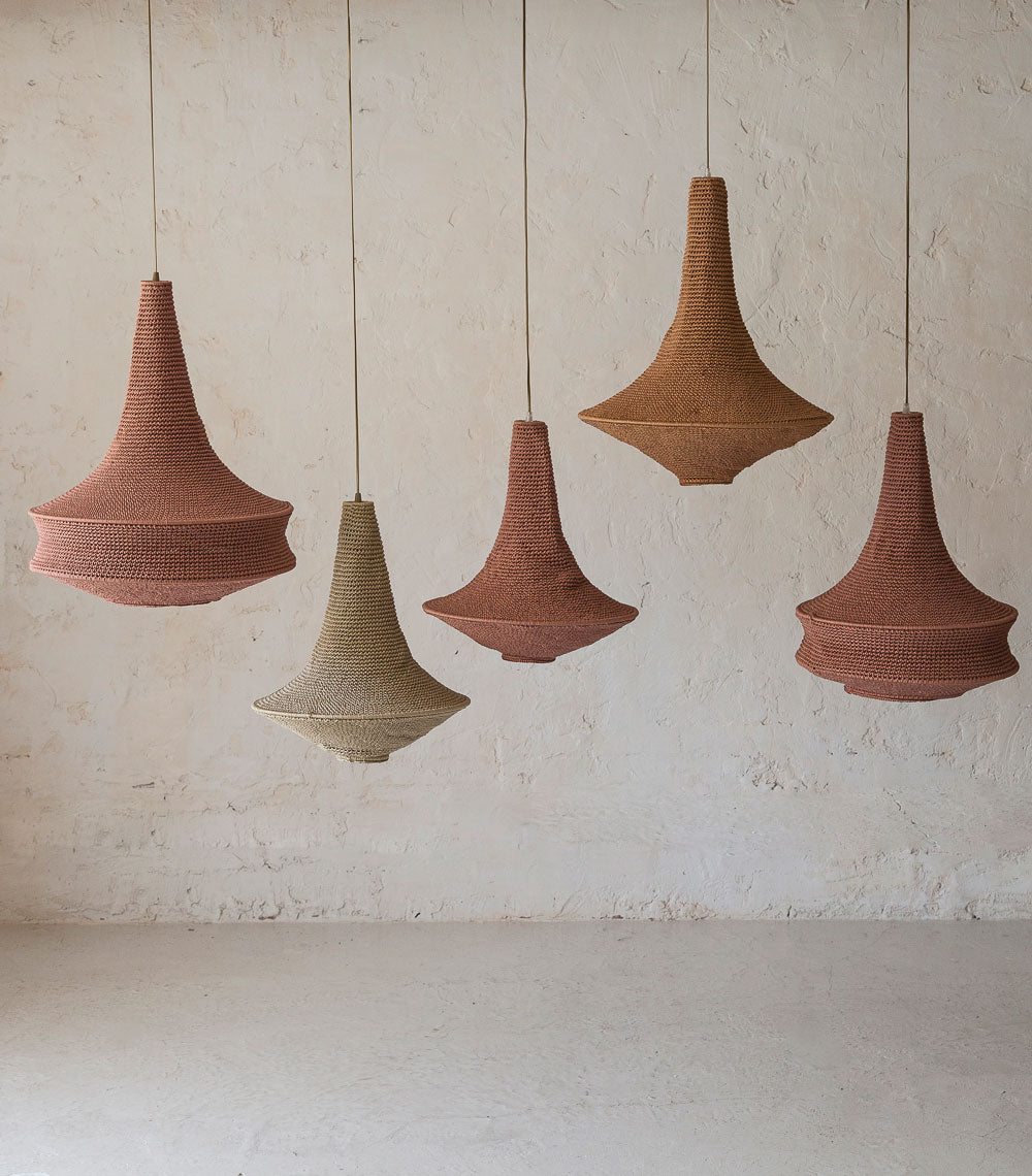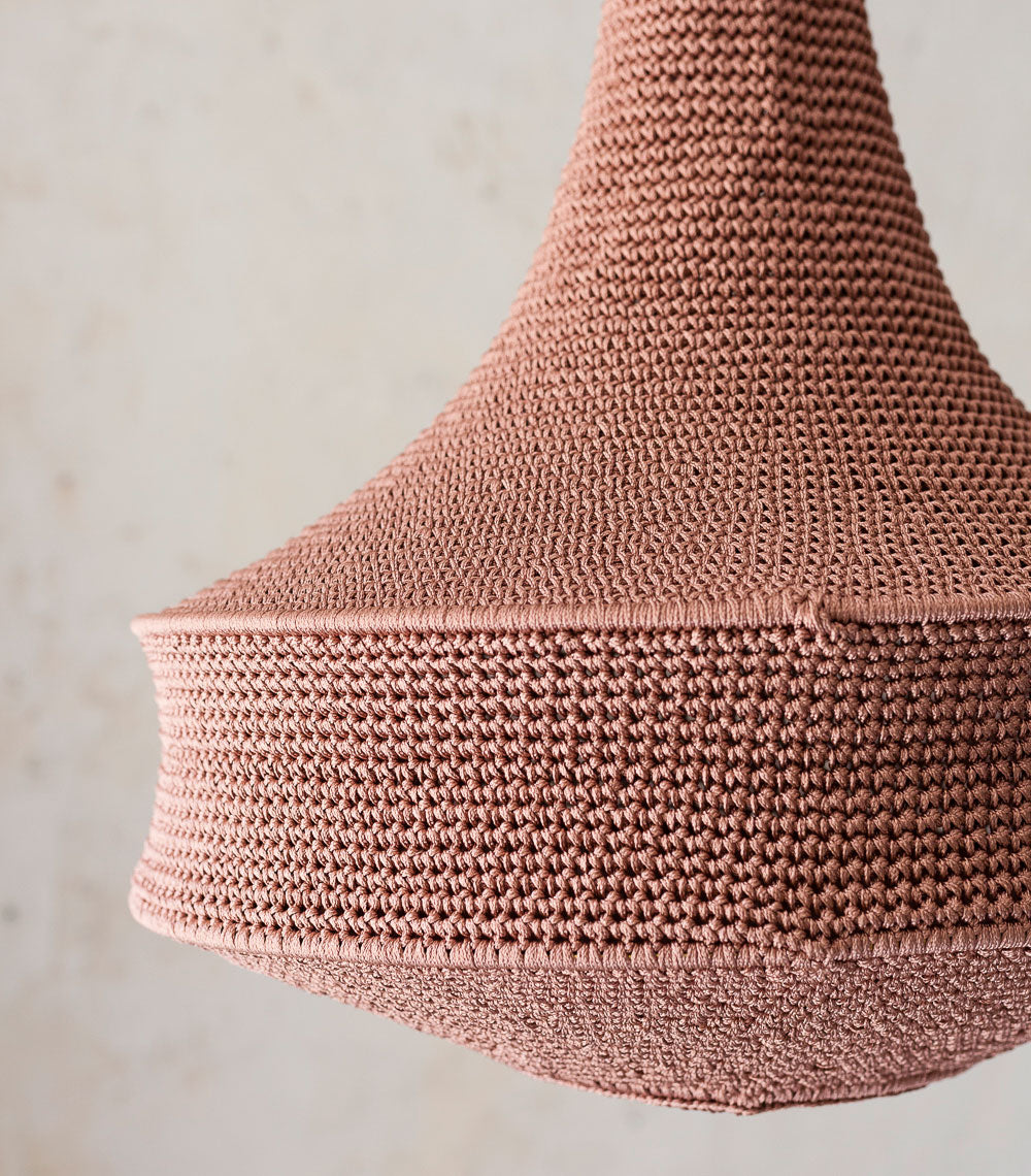 Lámpara artesanal hecha por mujeres de Marrakech tejida con hilo de "Kitan" en color maquillaje.