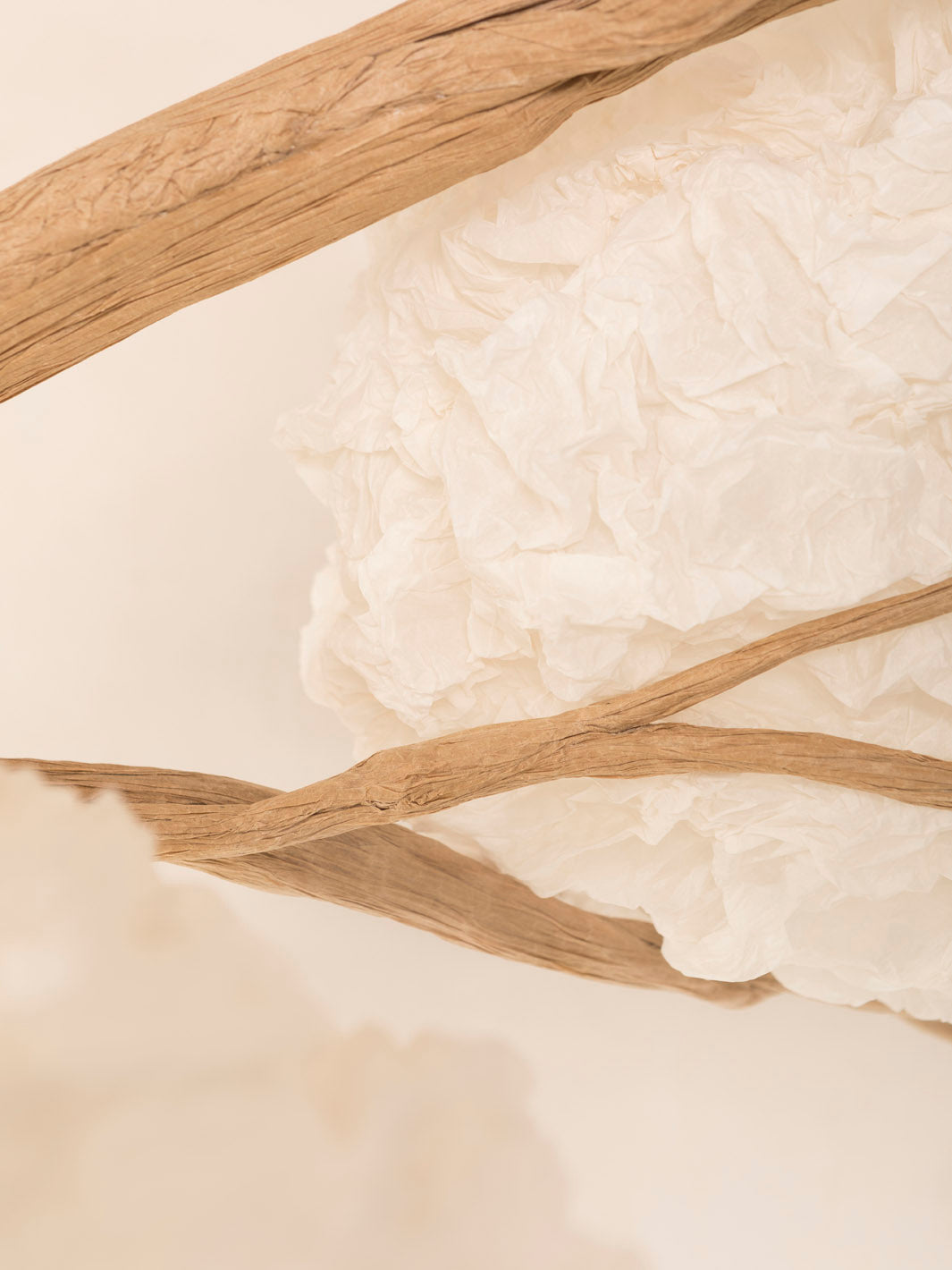 Lámpara de pie con un diseño orgánico que recuerda la elegancia de un árbol. Combina la solidez de la base de madera natural con la delicadeza de pantallas hechas a mano en papel plisado y las líneas y pliegues del papel que forman el tronco del árbol.