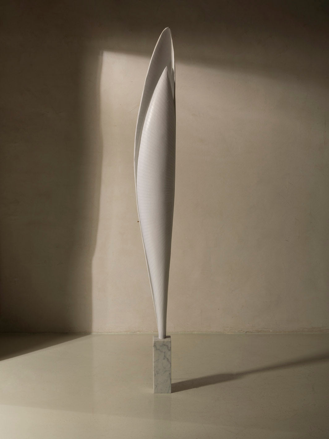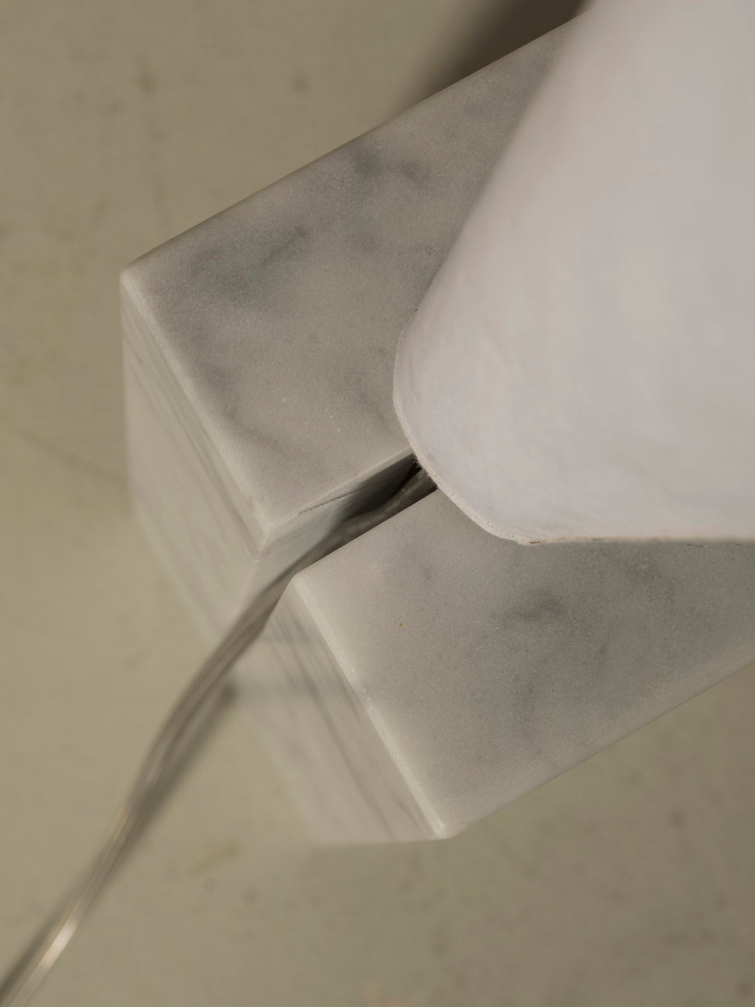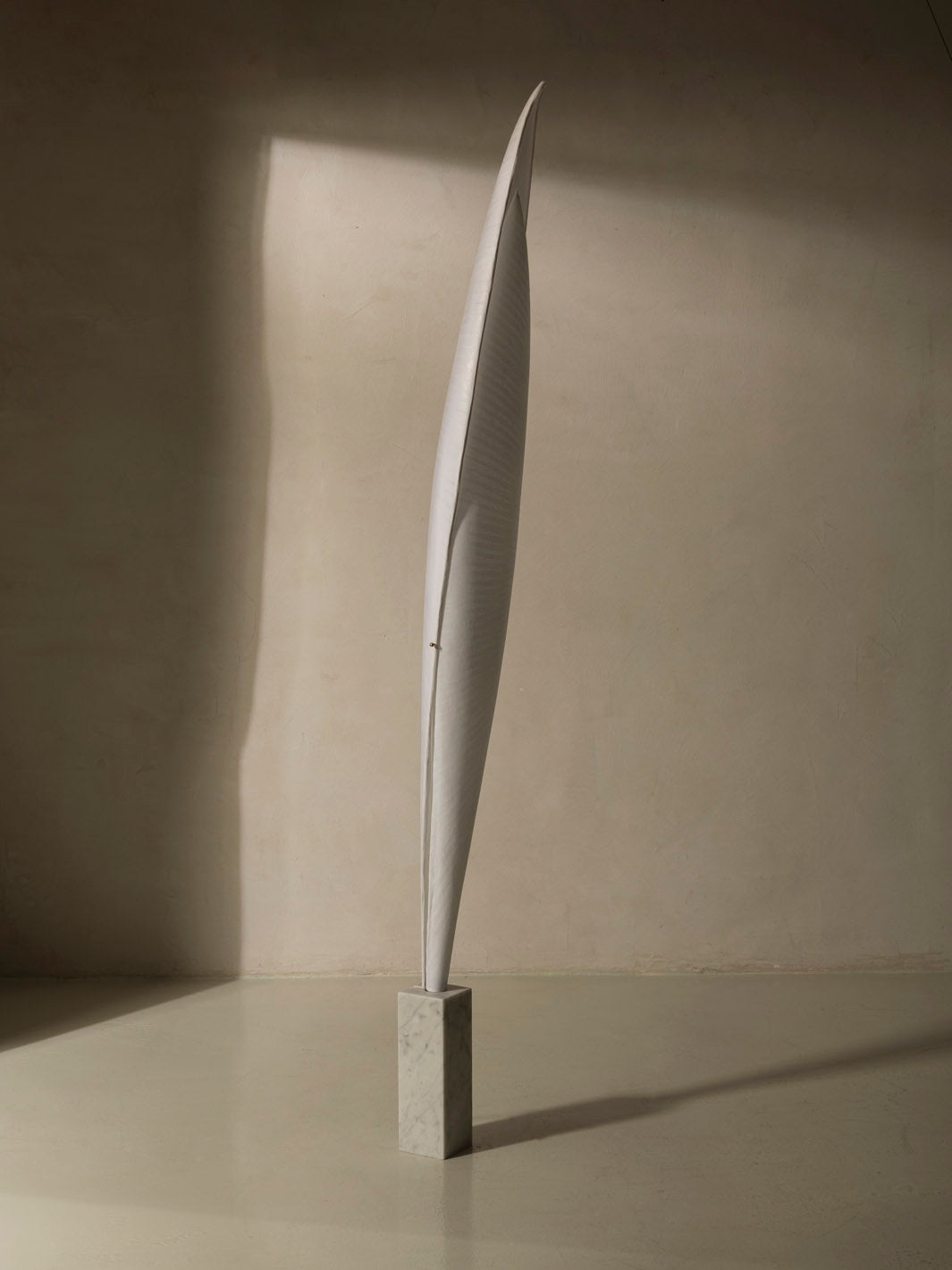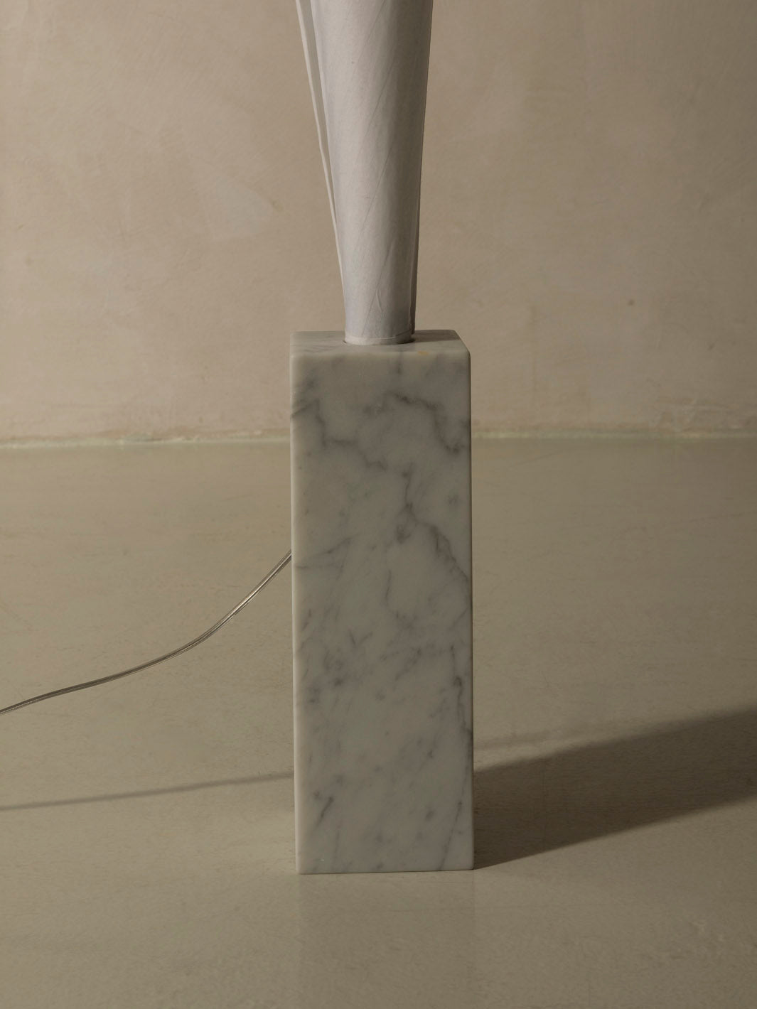 Papel japonés, ratán, estructura metálica, base de mármol de Carrara pulido, cable eléctrico de cristal (2,5 m), regulador de intensidad en el pie
