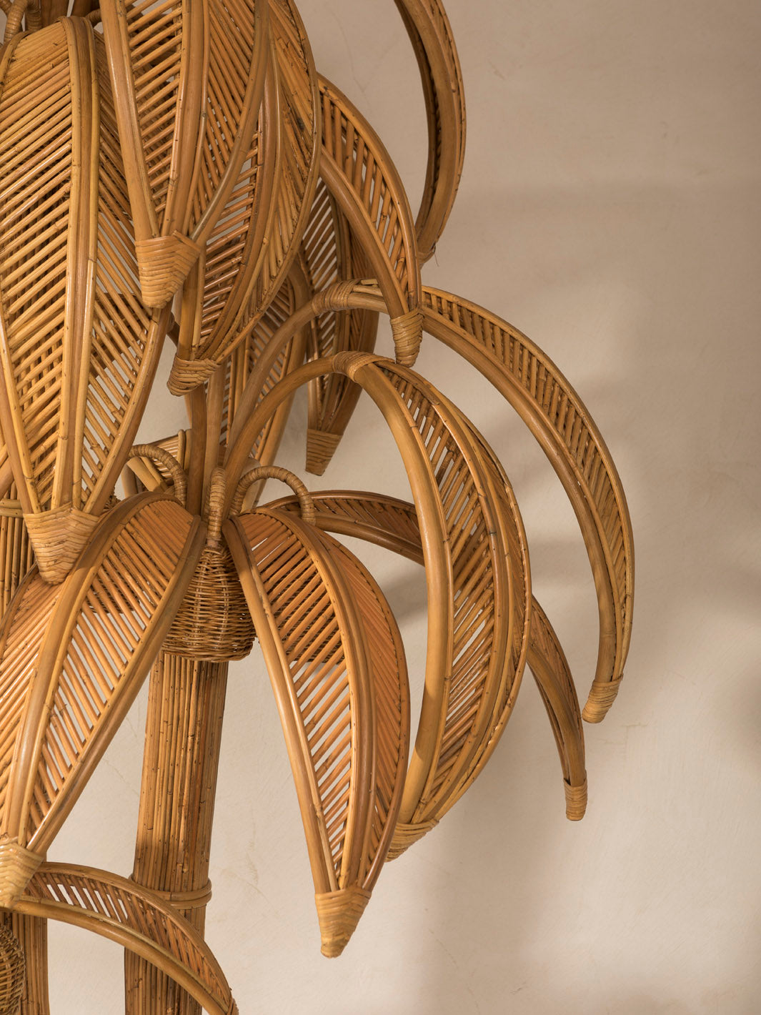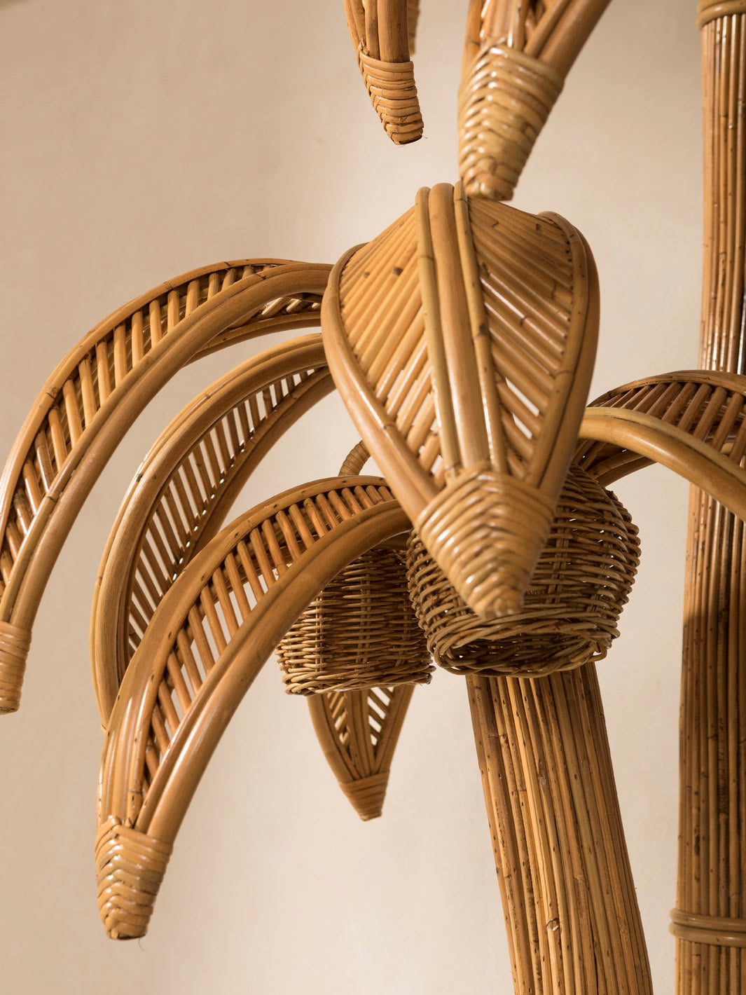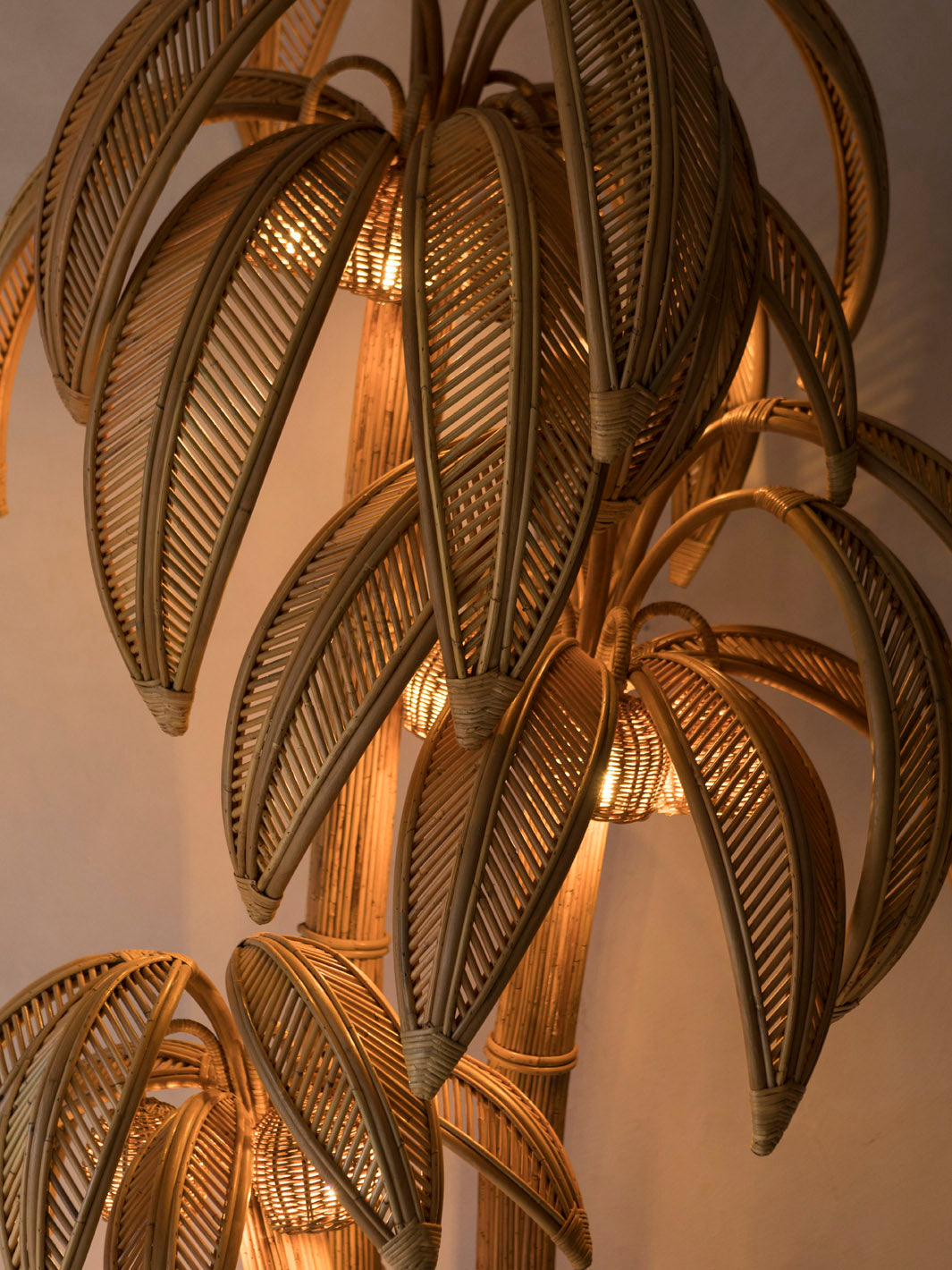 Esta lámpara de ratán combina un diseño escultórico con una fuerte inspiración natural, evocando la silueta de una palmera tropical. Su estructura artesanal destaca por la meticulosa curvatura y el trenzado del ratán, logrando un efecto orgánico y ligero. Es una pieza decorativa única que aporta calidez, textura y un aire relajado a cualquier espacio.