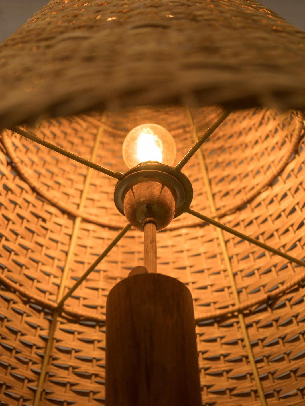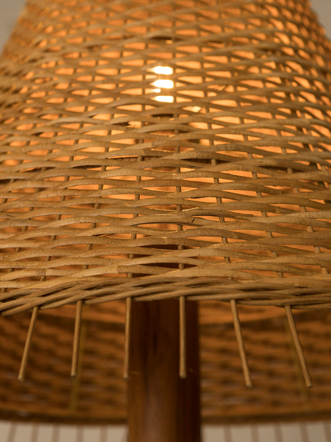 Lámpara de pie elaborada en teca con pantalla de ratán trenzado, perfecta para añadir un toque natural y sofisticado a cualquier ambiente. Una pieza atemporal que combina artesanía y elegancia con materiales nobles.