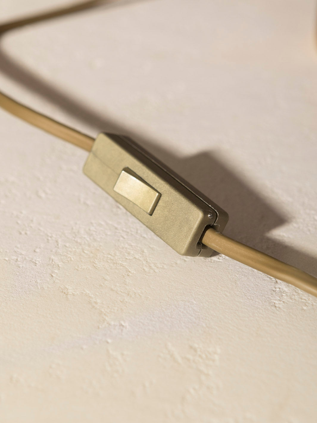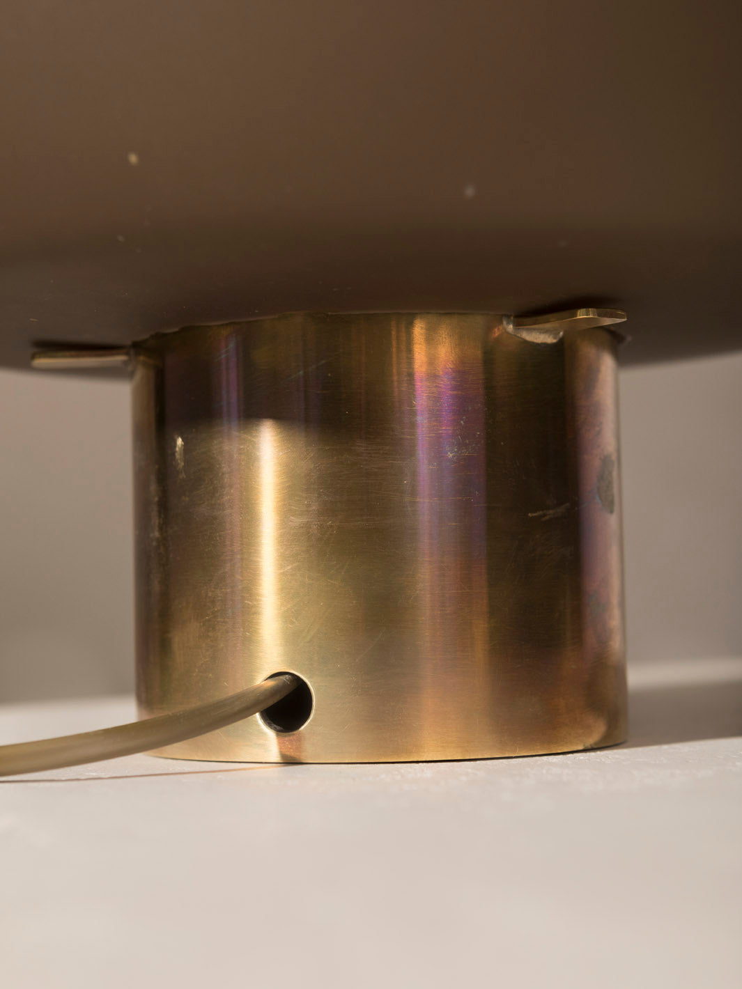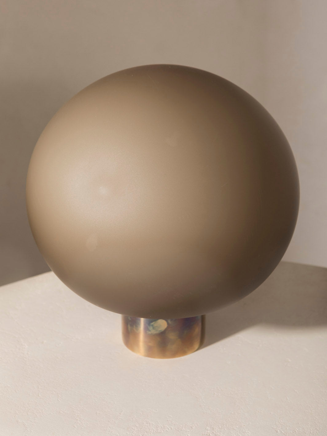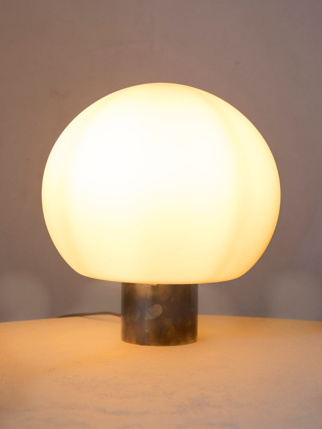 Lámpara de sobremesa italiana de inspiración años 50 con tulipa en cristal de murano color gris y base cilíndrica en latón.