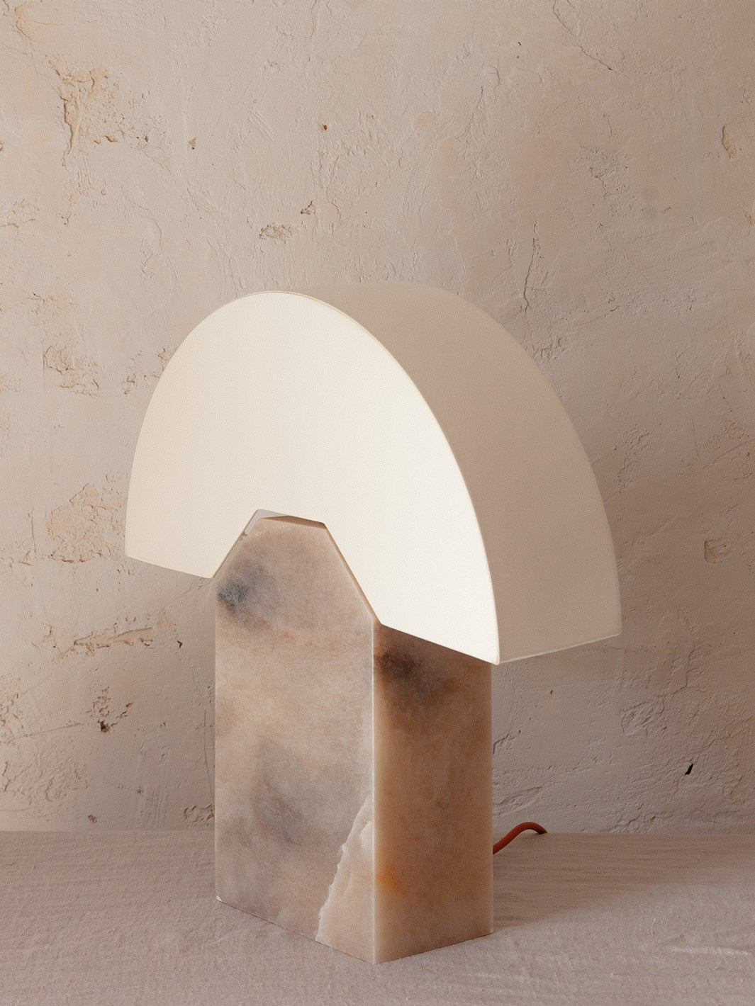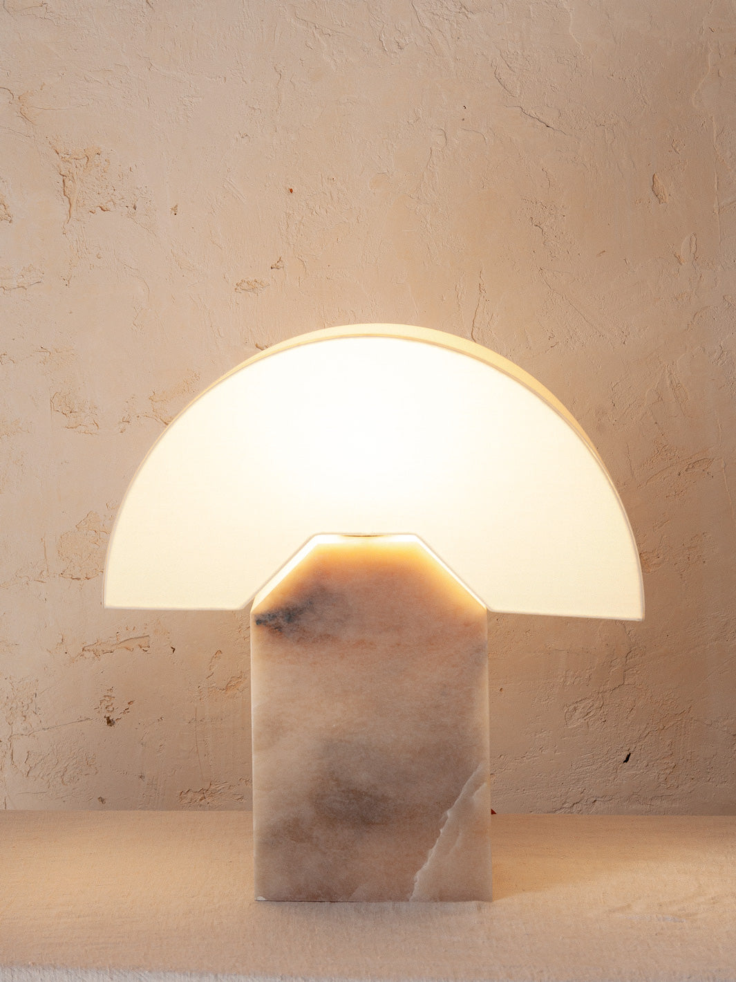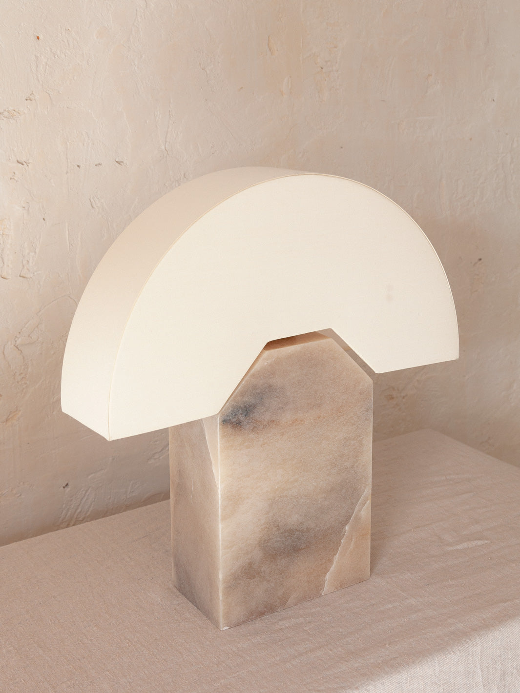 Lámpara de sobremesa Edna del estudio de diseño Simone & Marcel. Base de alabastro y pantalla de algodón crudo. Hecha a mano.