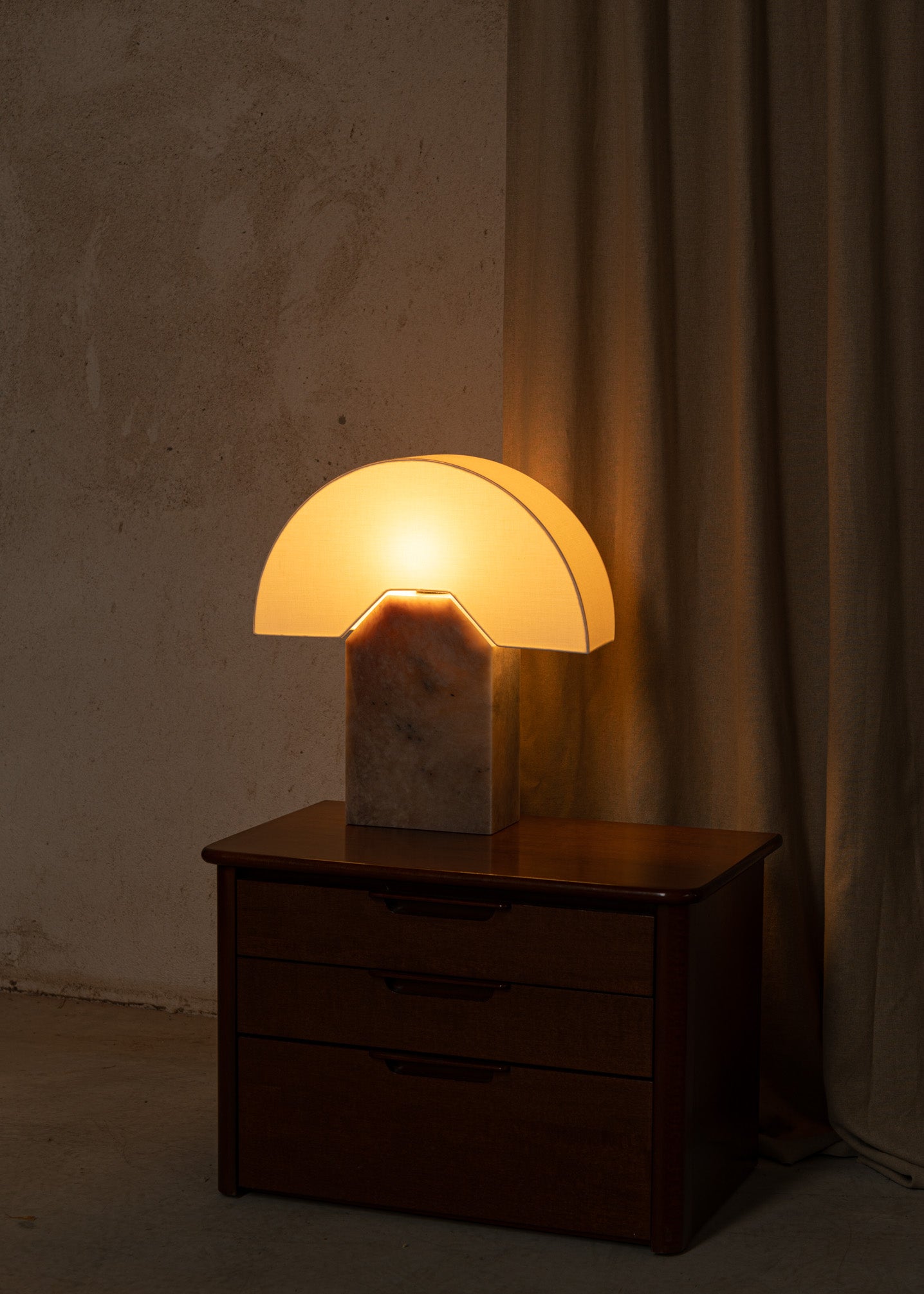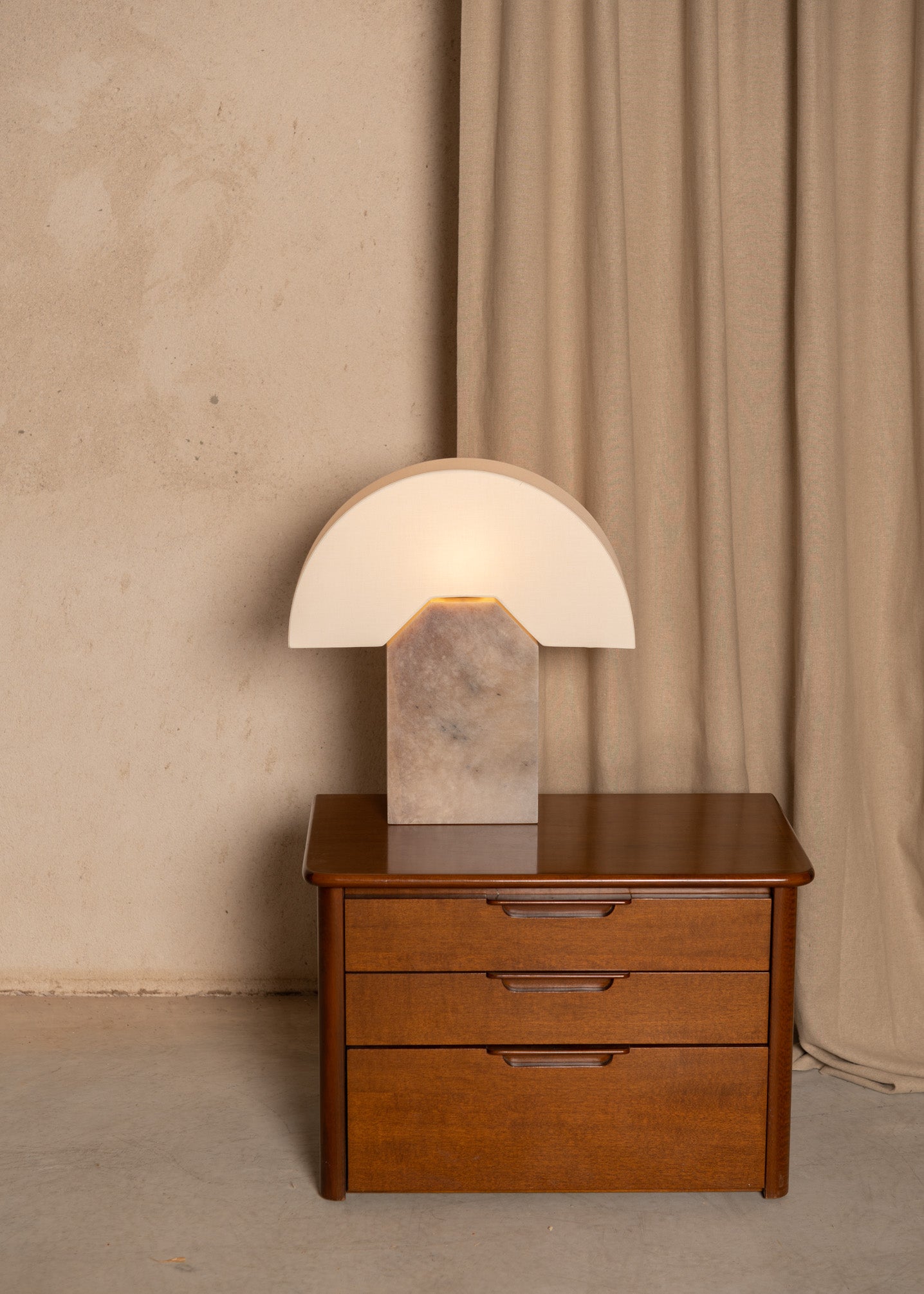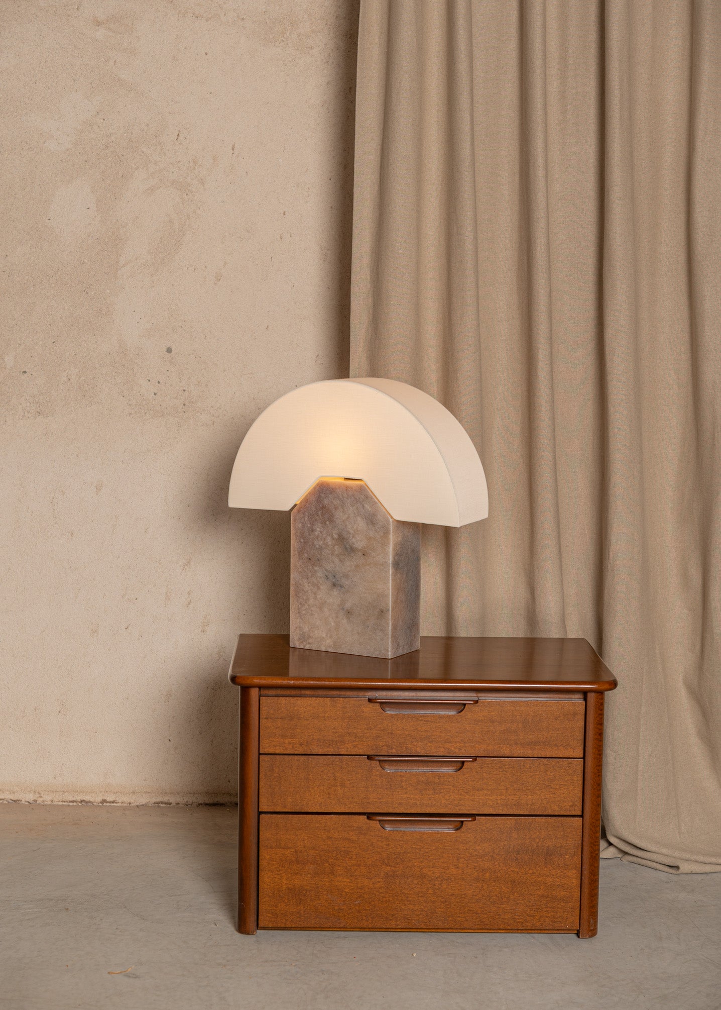 Lámpara de sobremesa Edna del estudio de diseño Simone & Marcel. Base de alabastro y pantalla de algodón crudo. Hecha a mano.