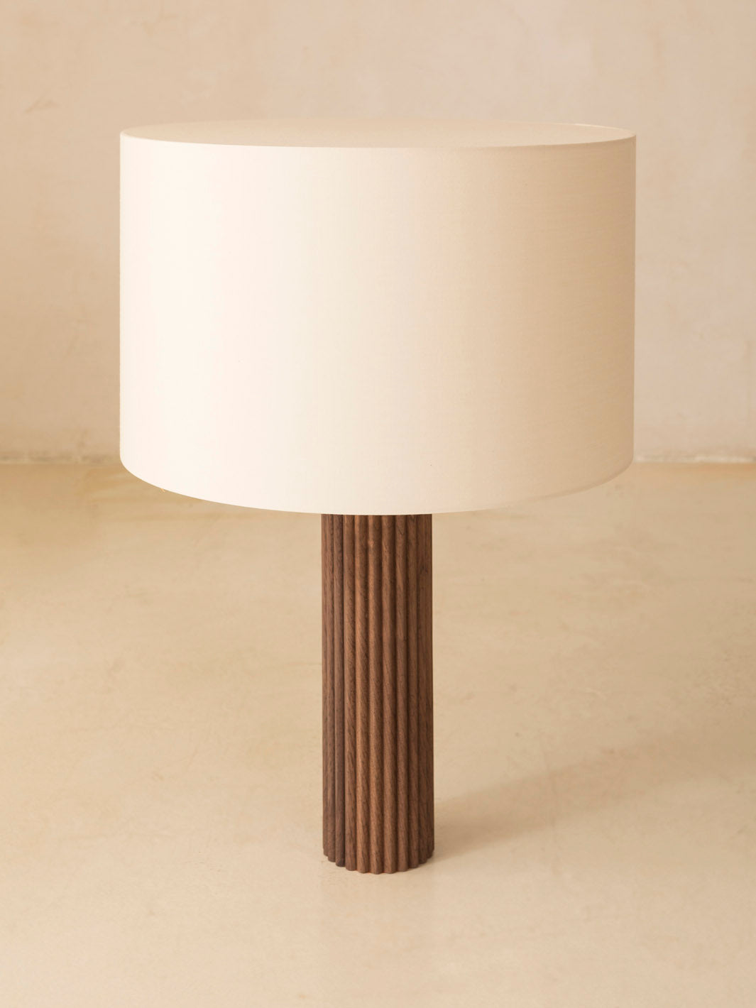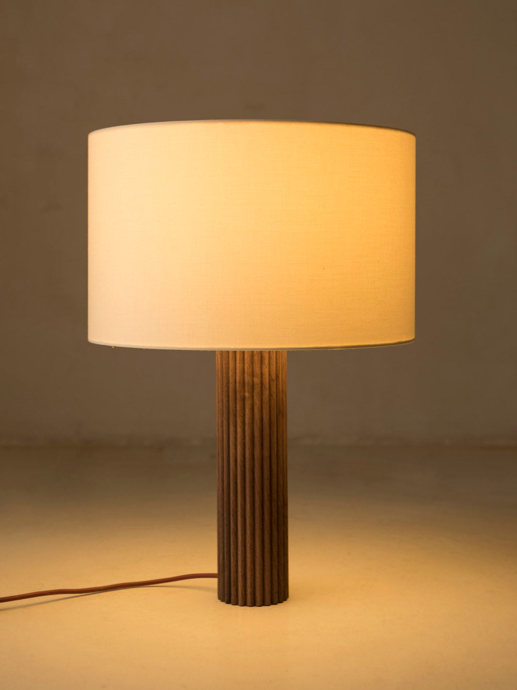 Lámpara de sobremesa Fluta del estudio de diseño Simone & Marcel. Base de madera de nogal con textura de líneas y pantalla de algodón crudo. Hecha a mano.