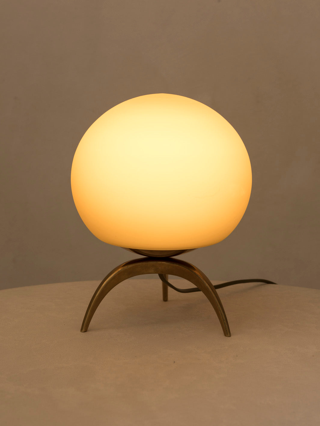 Lámpara de sobremesa italiana de inspiración años 50, con tulipa en cristal de Murano de color gris y pie escultural en latón.
