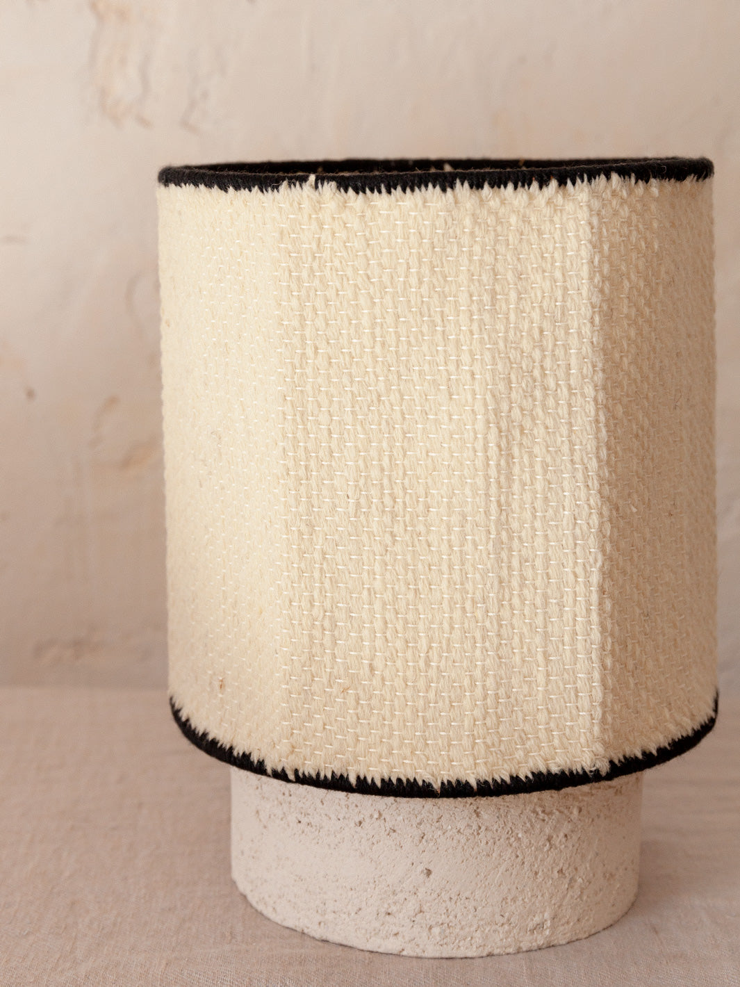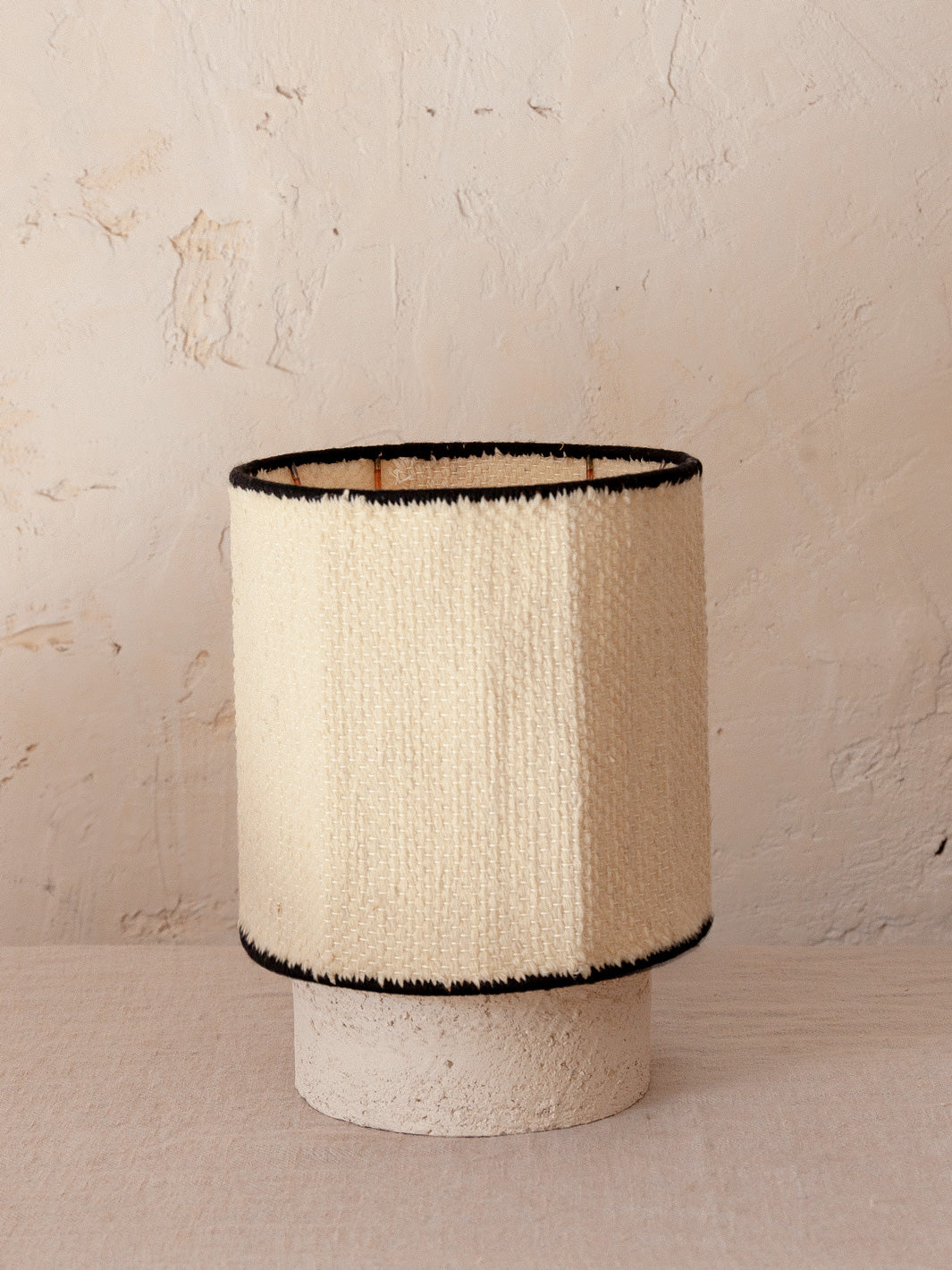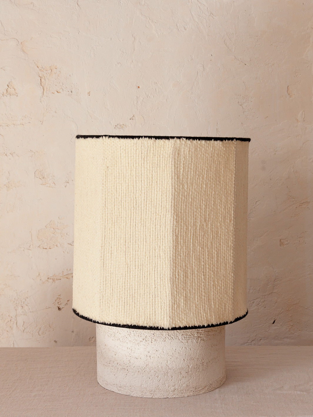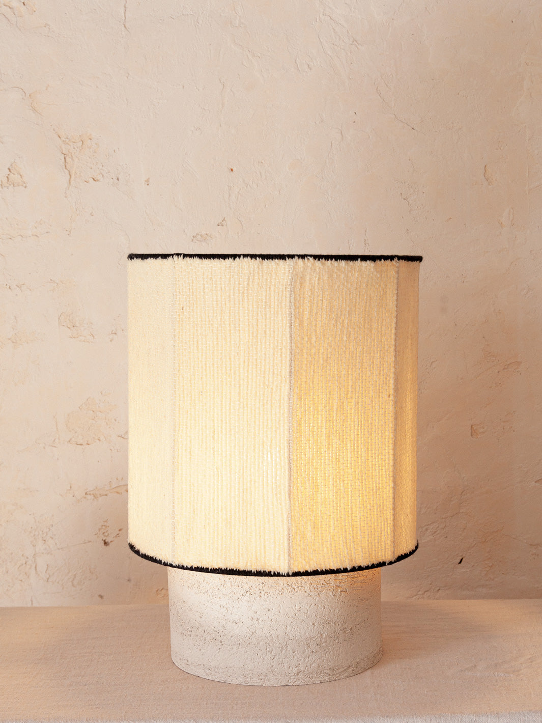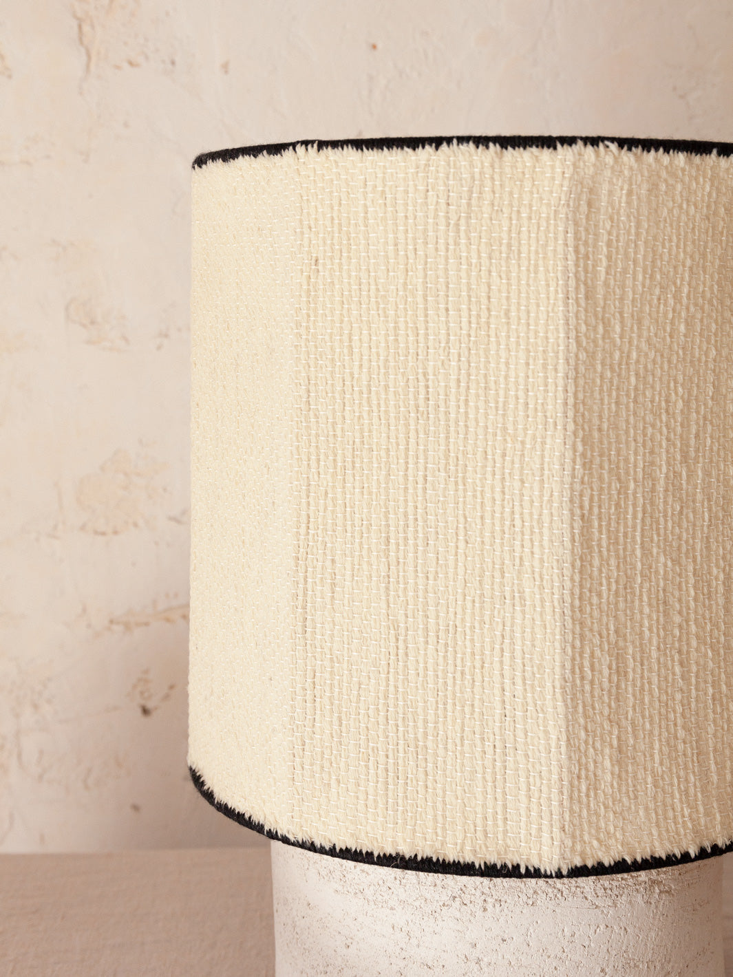 Lámpara de sobremesa de gres y arcilla en color natural con pantalla de lana con vivo negro de la firma francesa Maison de Vacances.