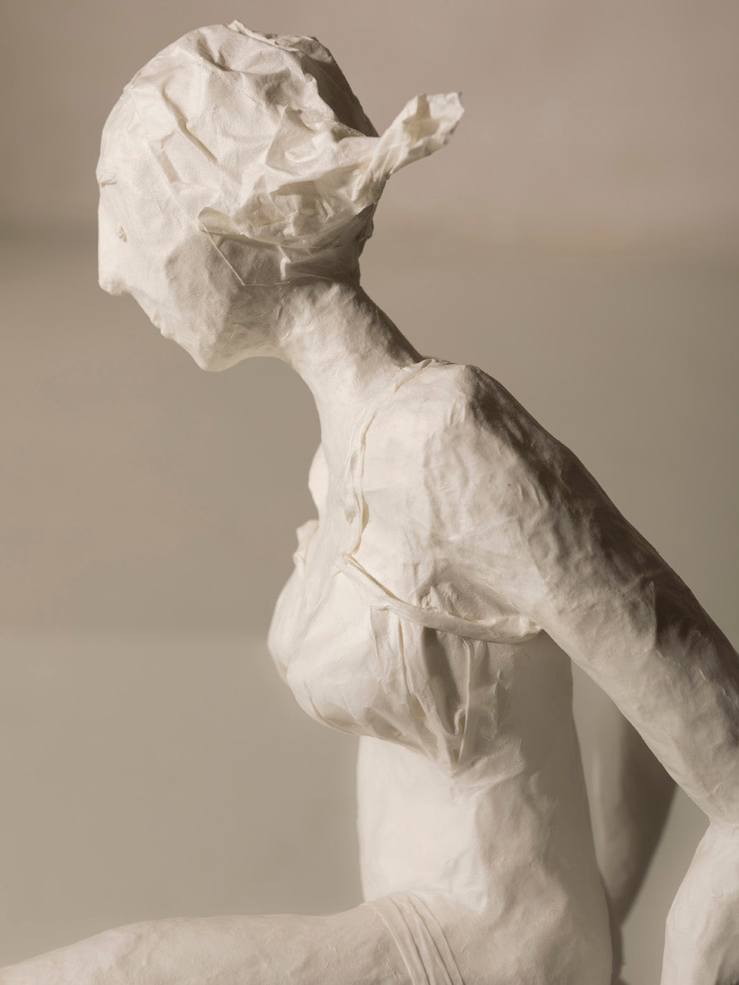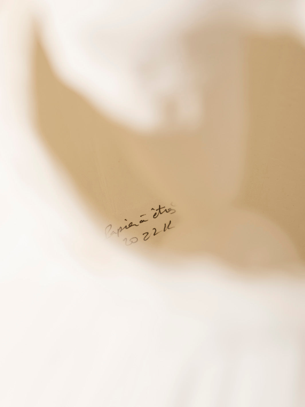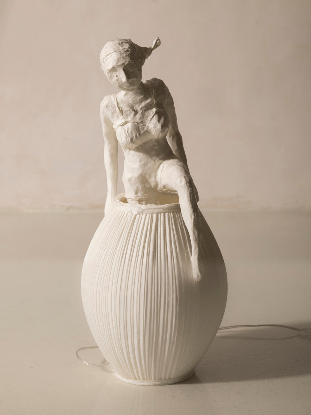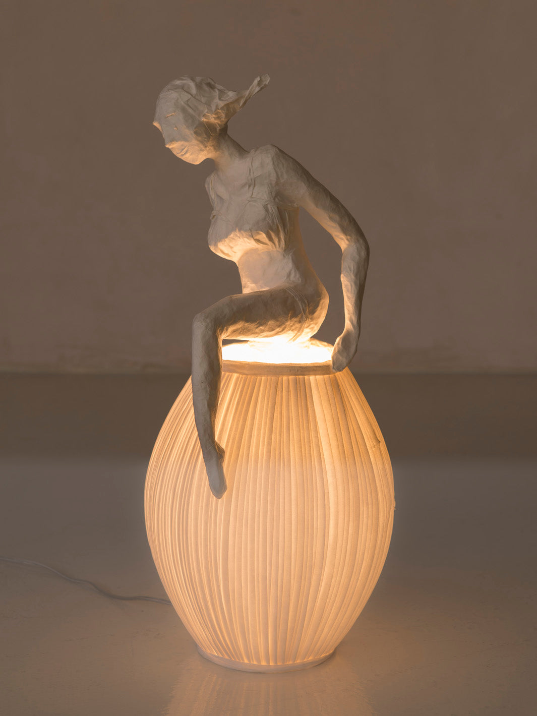 Lámpara escultura de sobremesa diseñada y trabajada manualmente por la pareja de artesanos Papier à êtres con papel de lino.