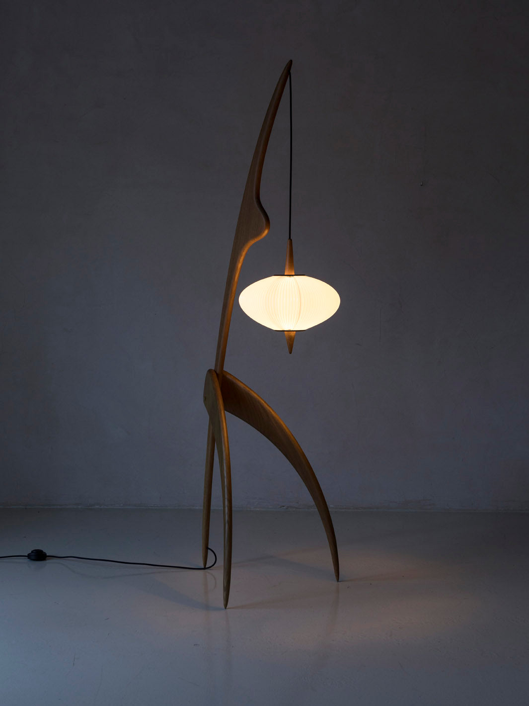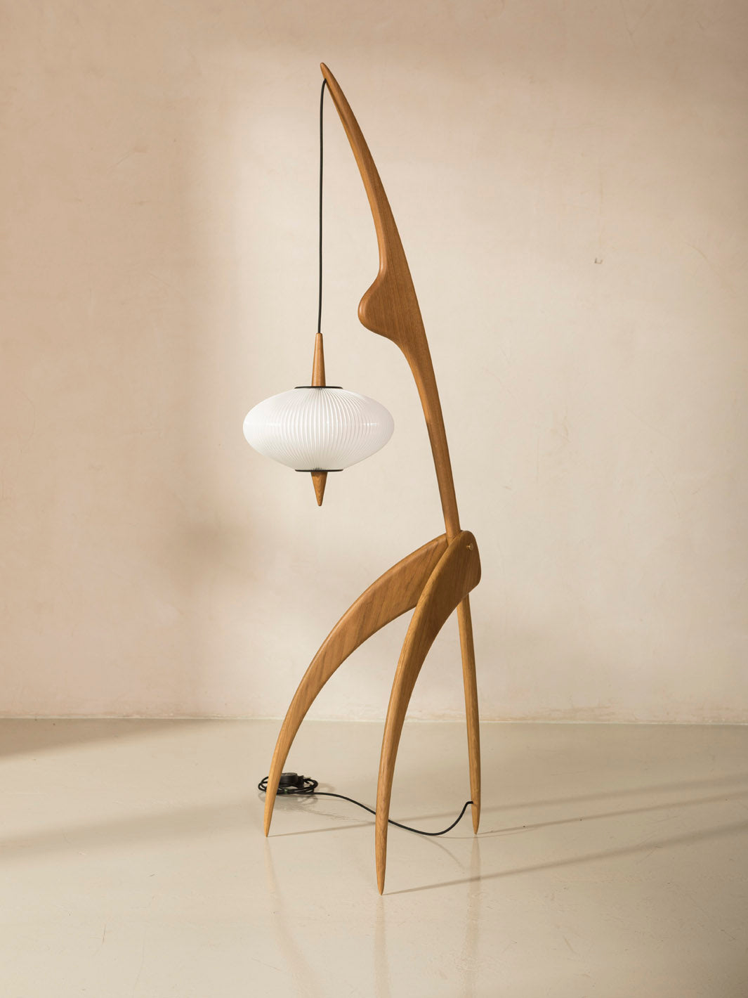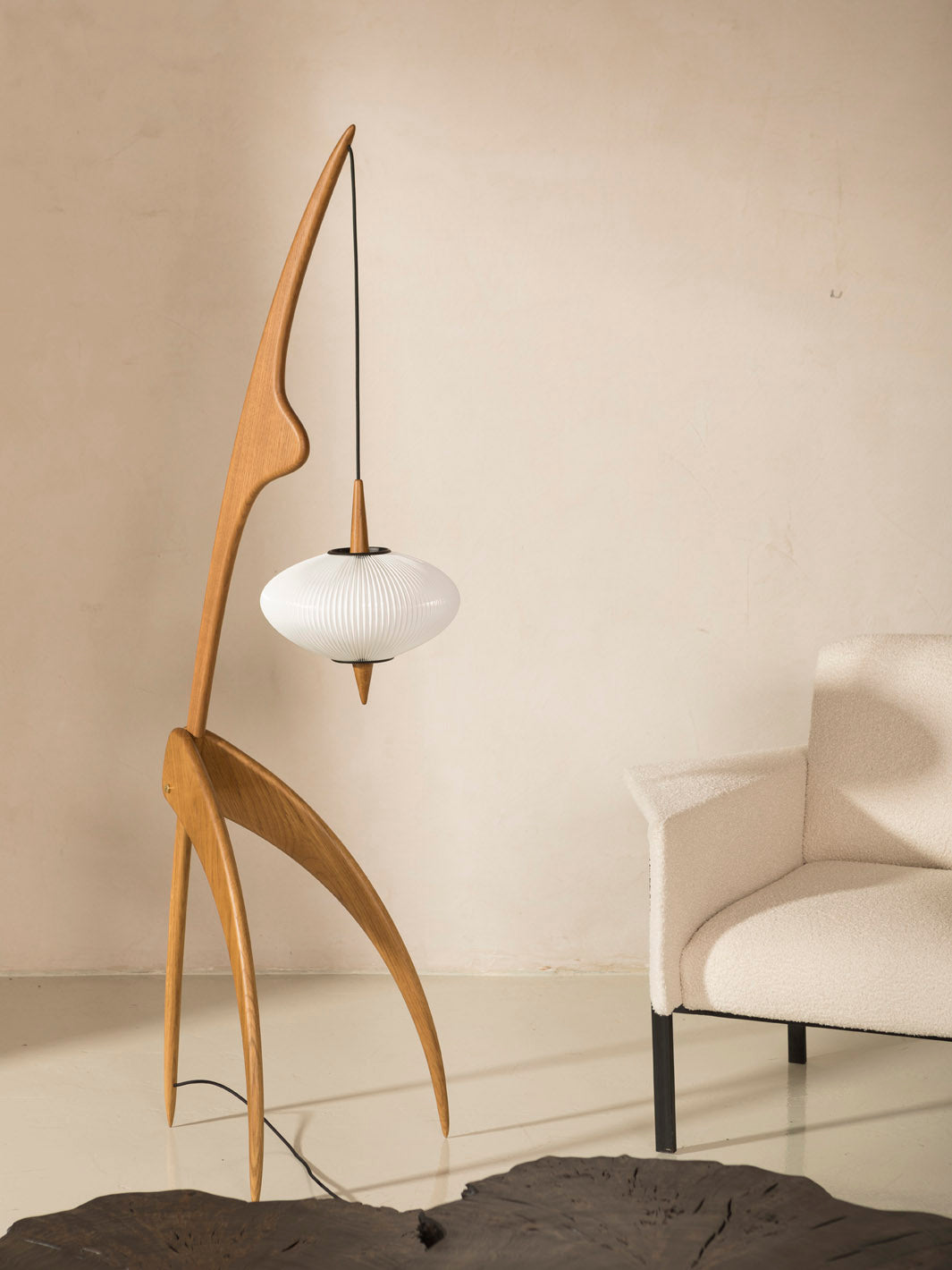 Reedición de la lámpara de pie #14.950 de Rispal de madera de roble.
