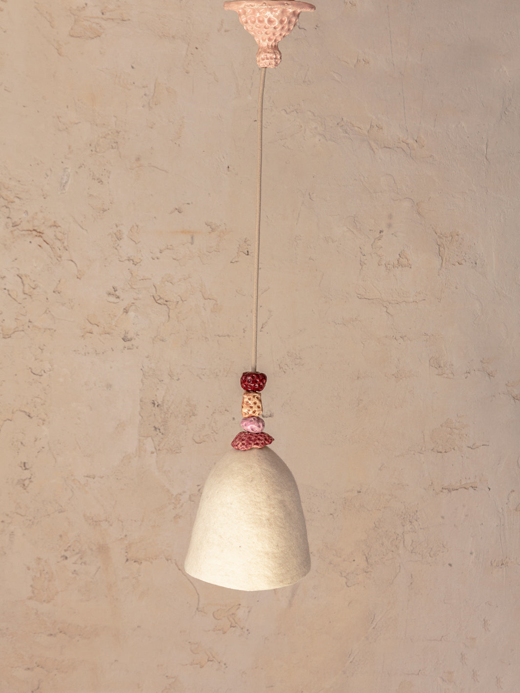 Lámpara de techo francesa con pantalla de fieltro con cazoleta y decoración de cerámica en tonos rosas. Está inspirada en el "qelesh", un sombrero tradicional usado por los hombres en la Albania rural, cada pantalla está hecha artesanalmente con la laboriosa técnica tradicional. Al ser un producto artesanal no existen dos igual, las irregularidades y pequeñas imperfecciones son propias de su proceso de fabricación. Cómprala si de corazón compartes esta filosofía.