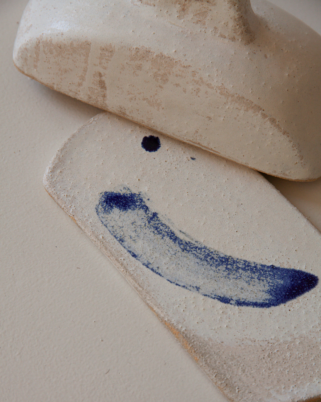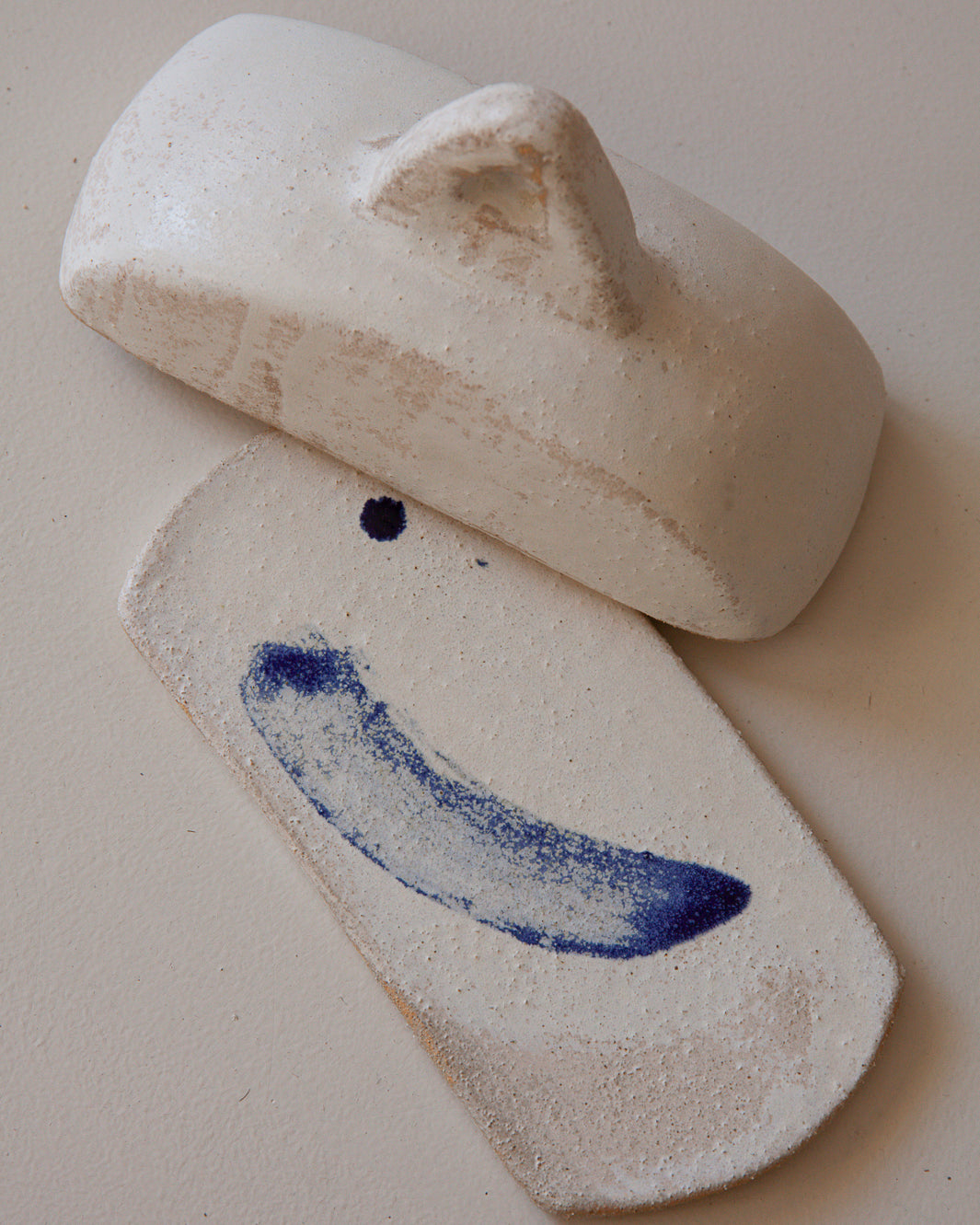 Mantequillera artesanal de cerámica blanca de la ceramista Marta Bonilla con dibujo azul en interior. Inspirado en las chimeneas de las casas de campo mediterráneas.