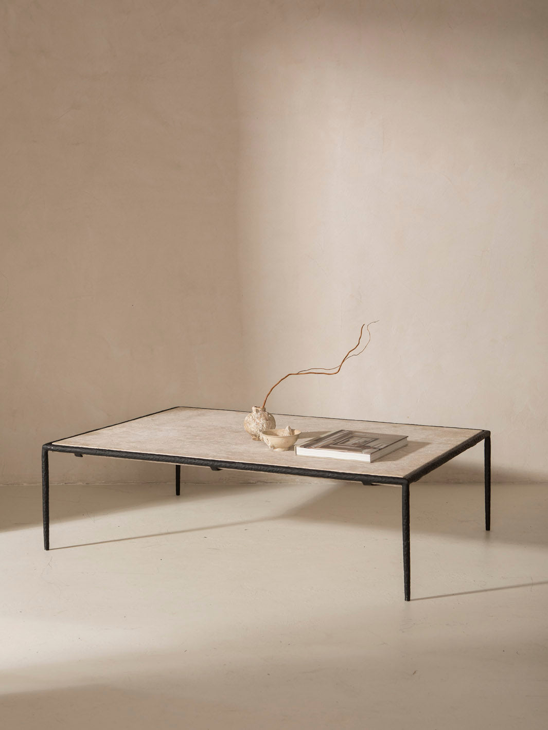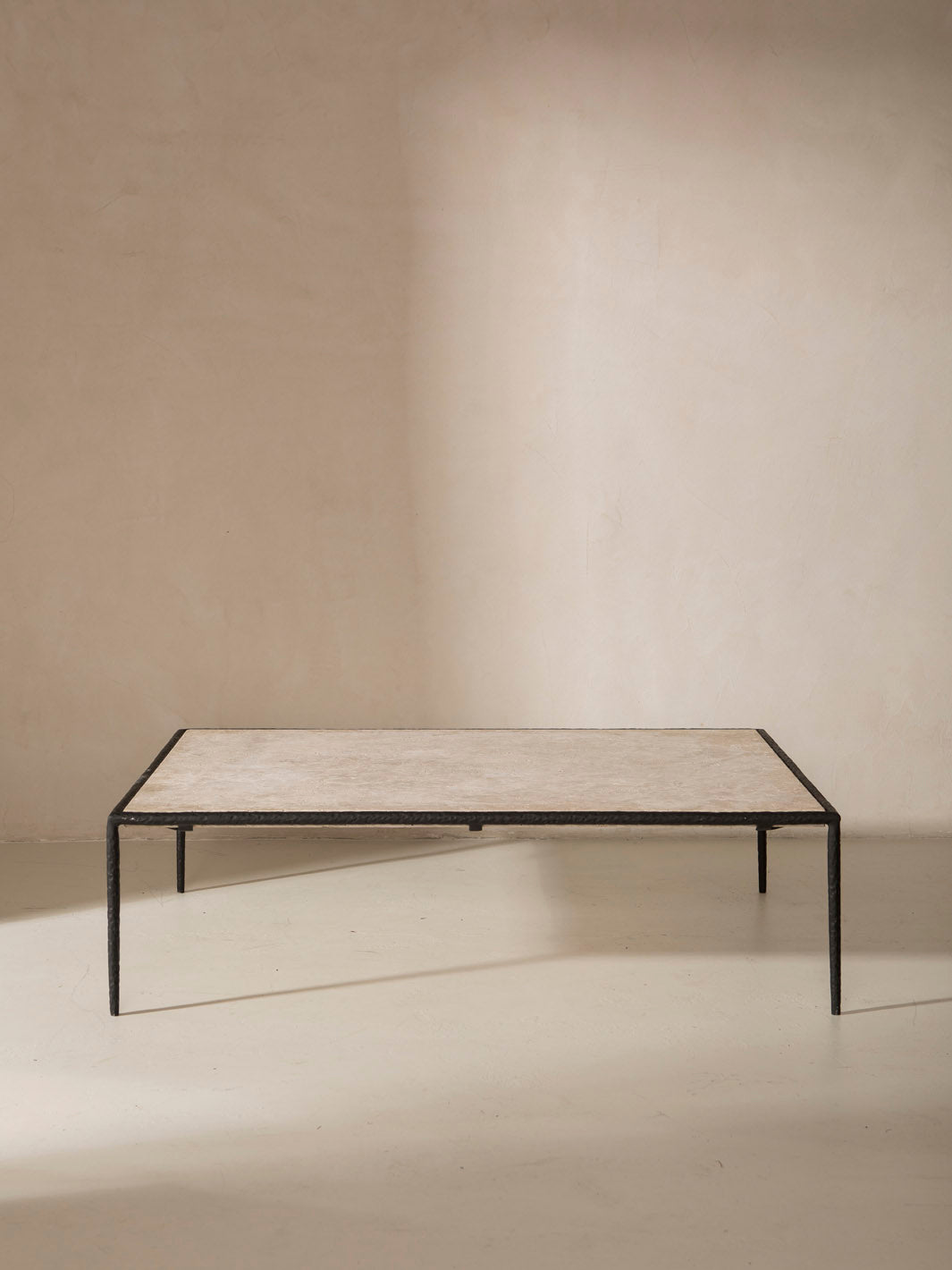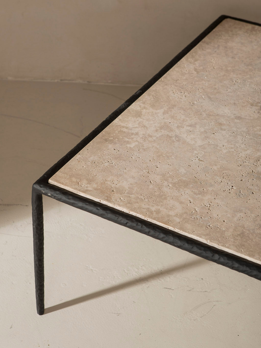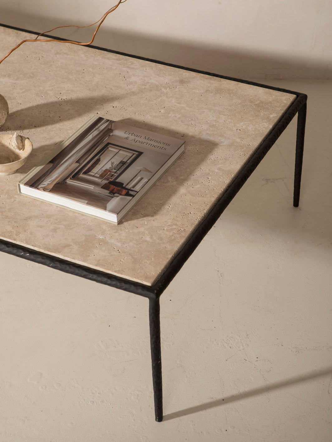 Mesa en travertino bruto encastrada en estructura en hierro martelé termolacado. Una pieza imponente tanto para interior como exterior. Al tratarse de una pieza trabajada a mano puede contener ligeras irregularidades e imperfecciones propias de su proceso de creación artesanal.