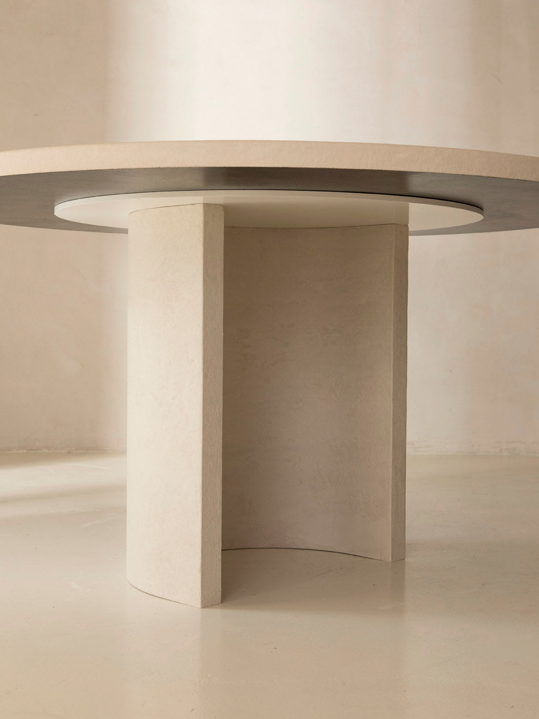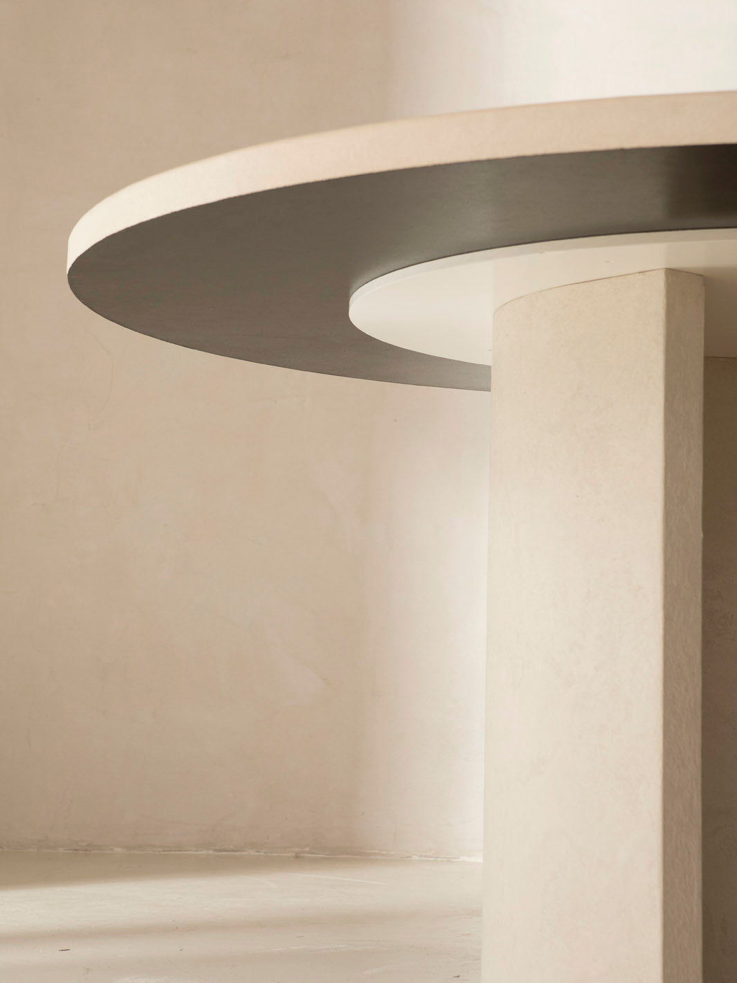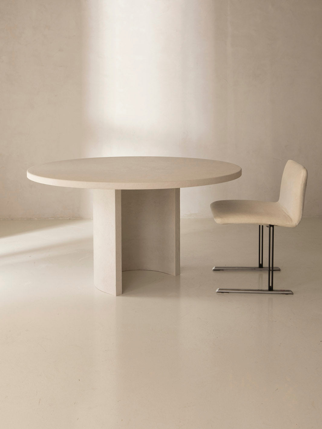Mesa de comedor ovalada en madera revestida de argilita color crema con un pie central en media luna. La argilita es una roca sedimentaria compuesta por arcilla y cuarzo, la belleza de esta mesa de comedor reside en sus elementos naturales. Está diseñada para ser disfrutada y para ser duradera en el tiempo por la resistencia de sus materiales.