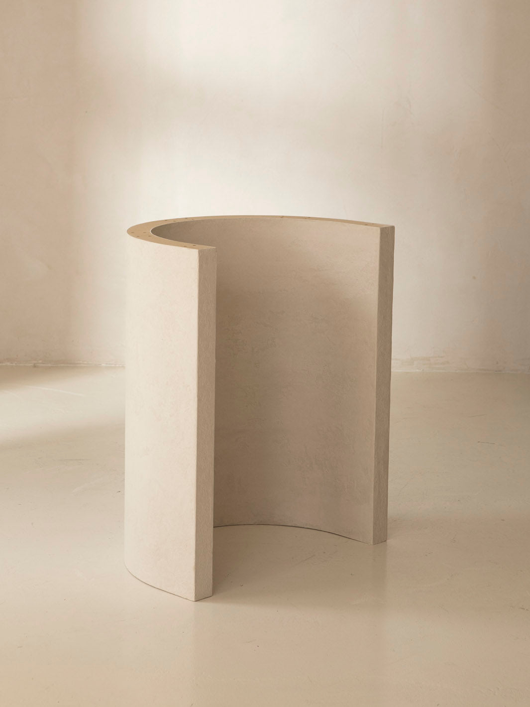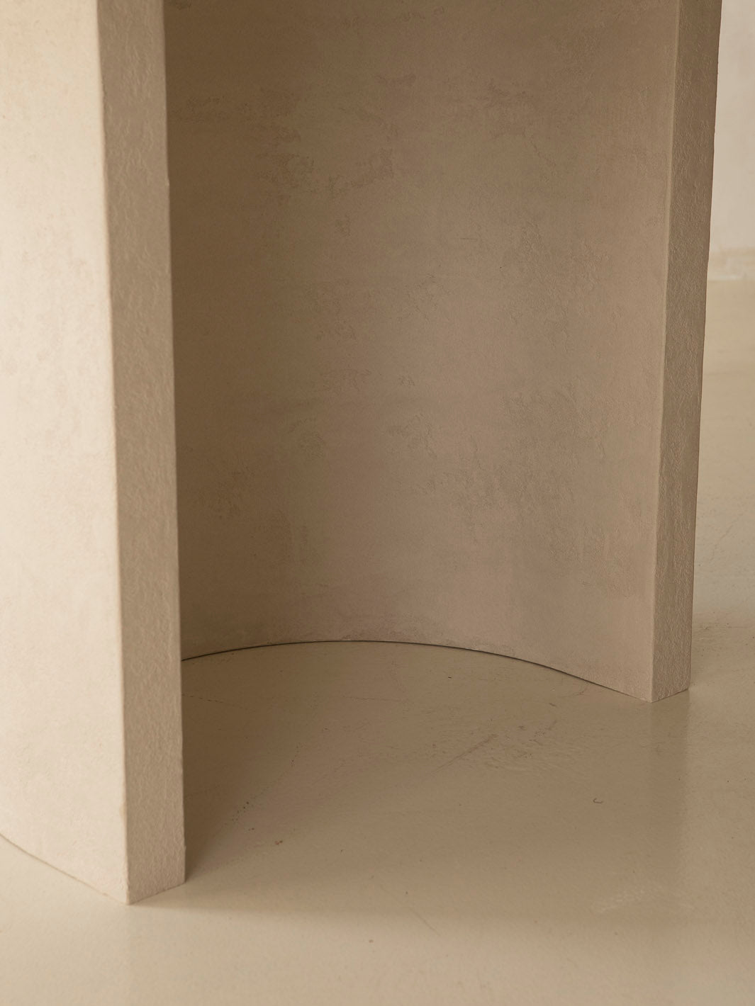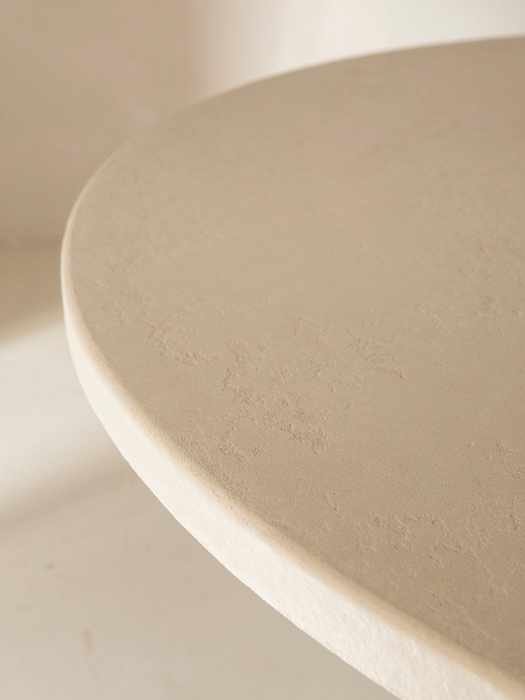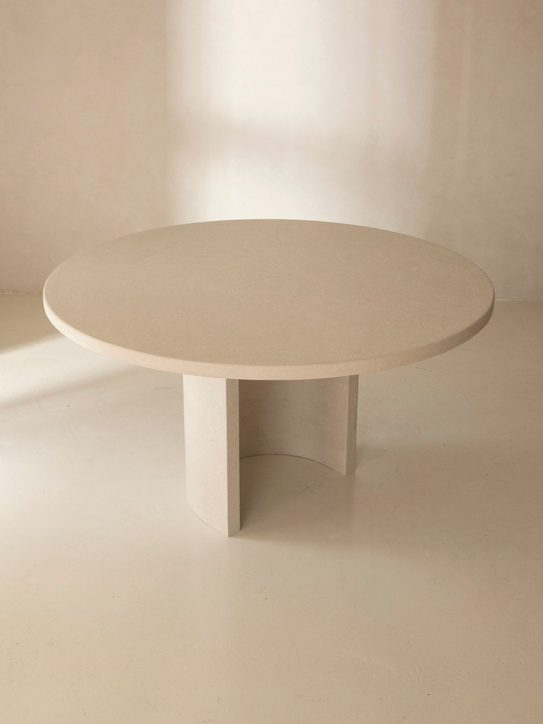 Mesa de comedor ovalada en madera revestida de argilita color crema con un pie central en media luna. La argilita es una roca sedimentaria compuesta por arcilla y cuarzo, la belleza de esta mesa de comedor reside en sus elementos naturales. Está diseñada para ser disfrutada y para ser duradera en el tiempo por la resistencia de sus materiales.