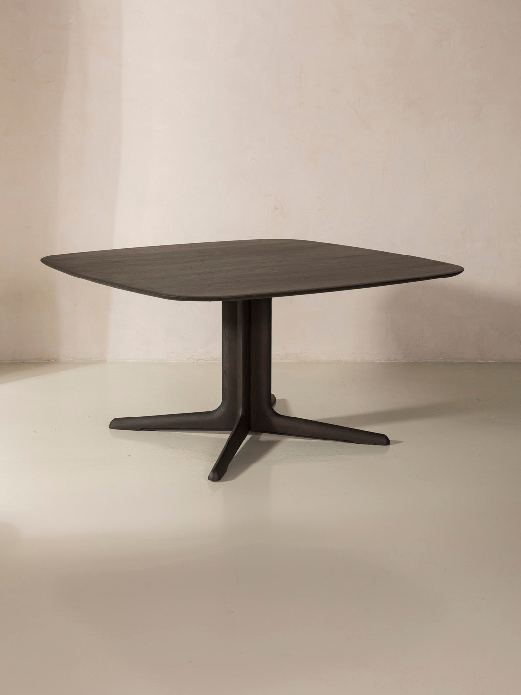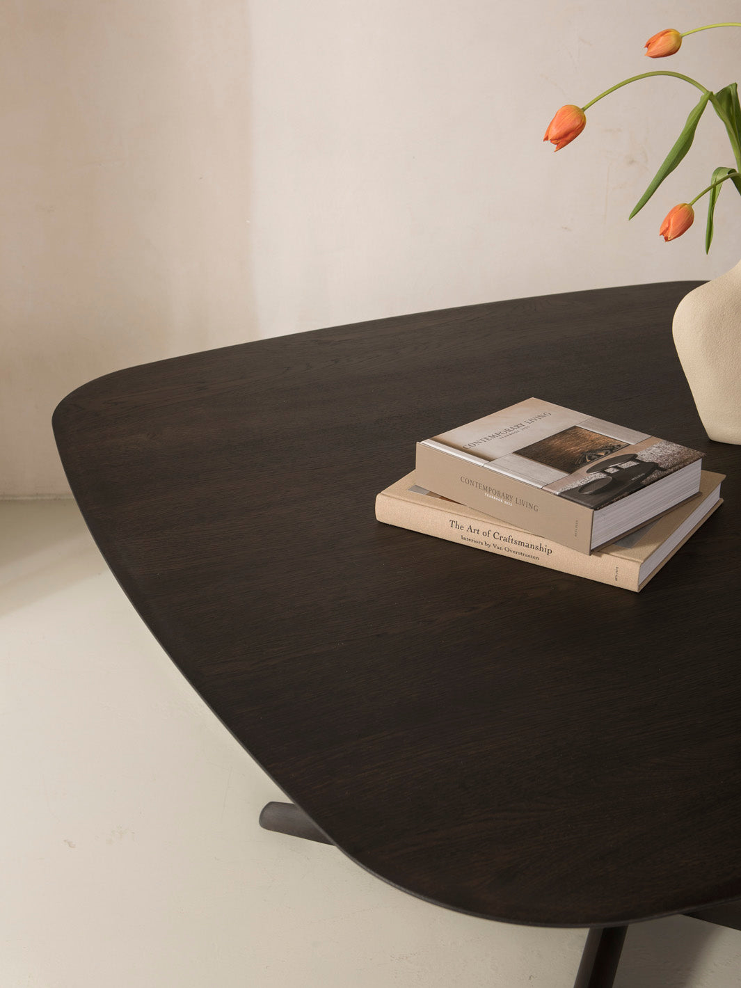 La base central de la mesa Corto, que recuerda a las bóvedas de los grandes diseños arquitectónicos, proporciona tanto interés visual como estabilidad práctica y comodidad. El tablero de roble macizo de color marrón está elaborado con la forma perfecta, con esquinas redondeadas únicas para crear largas sobremesas y reuniones.