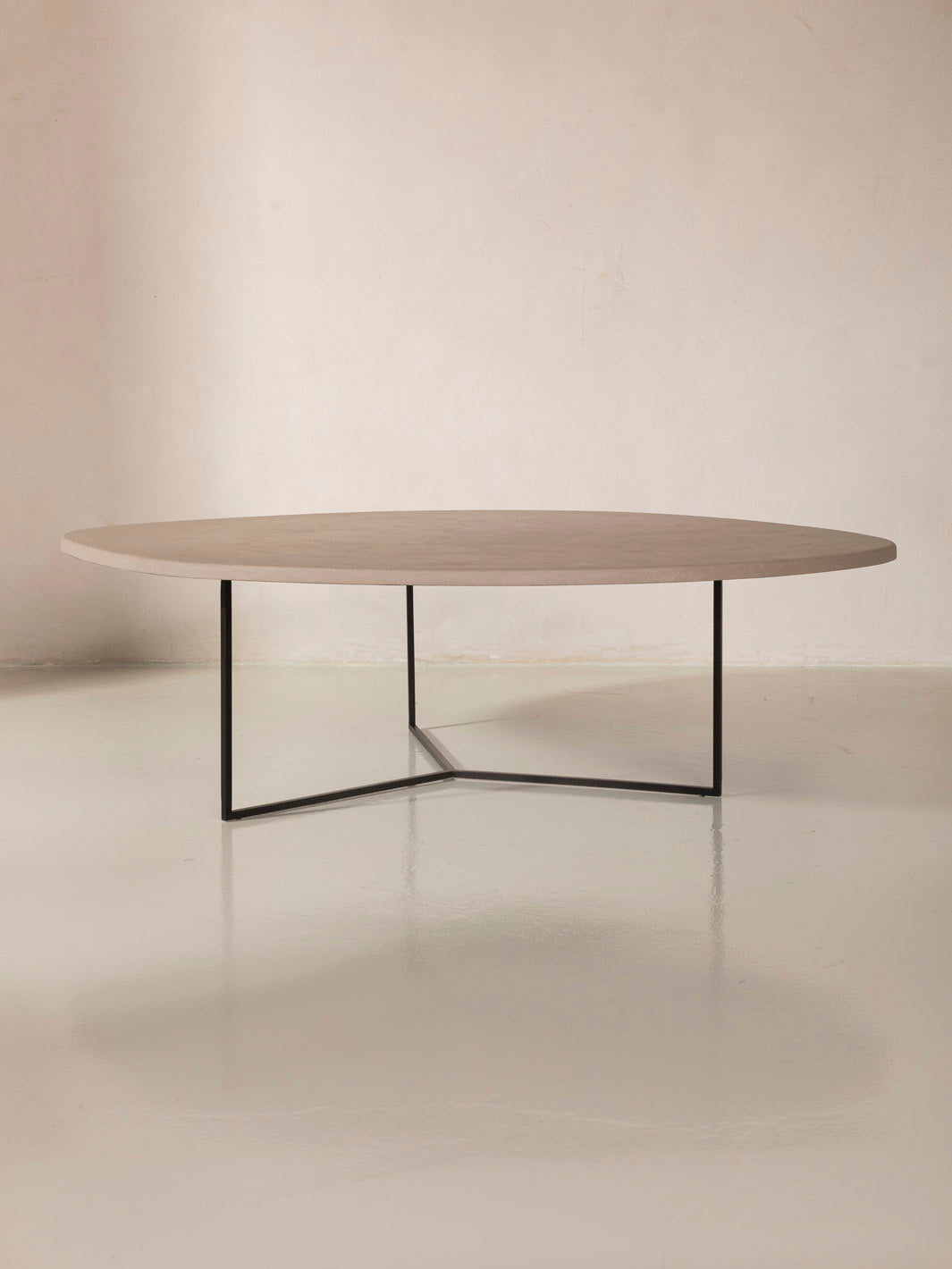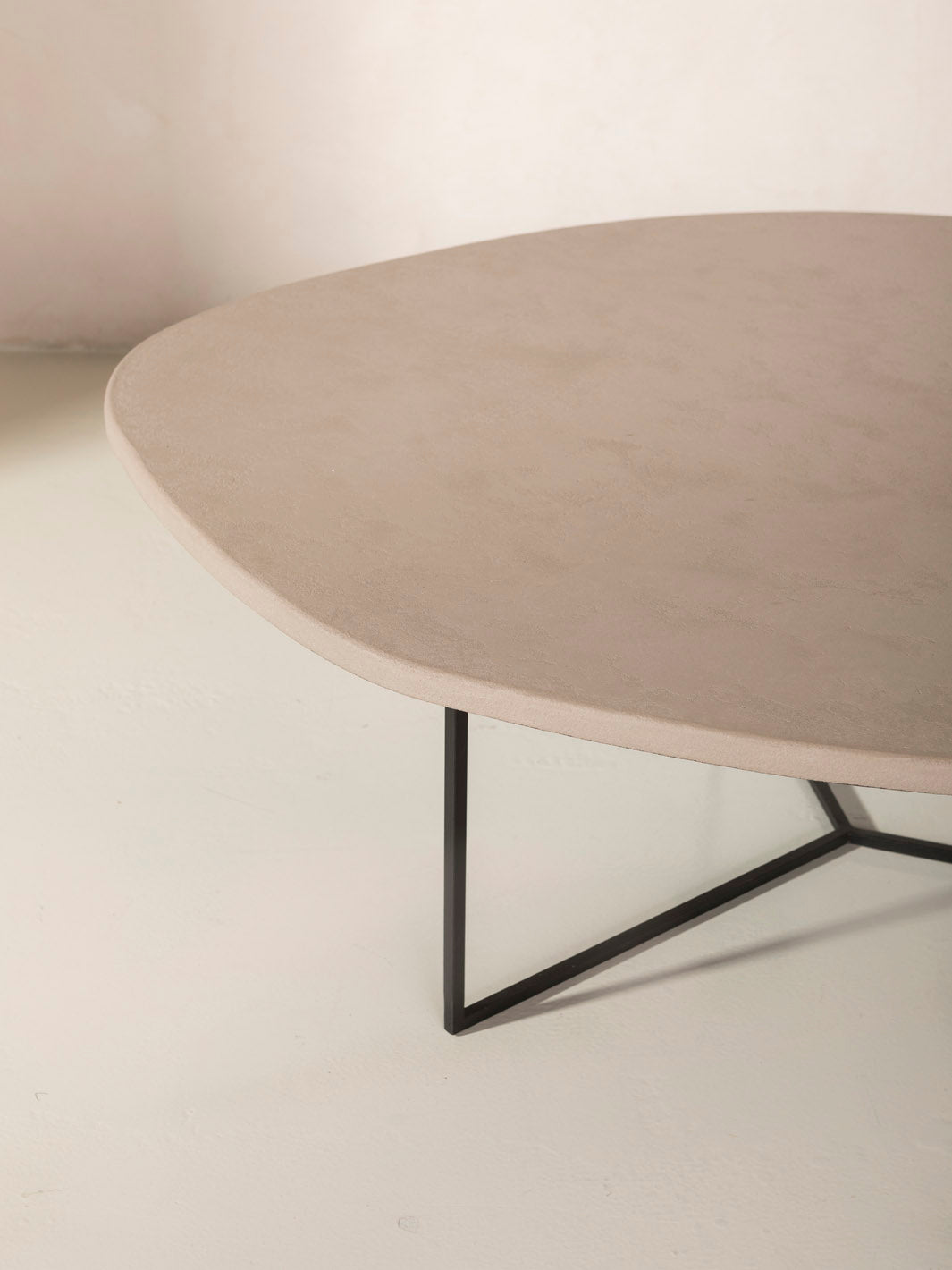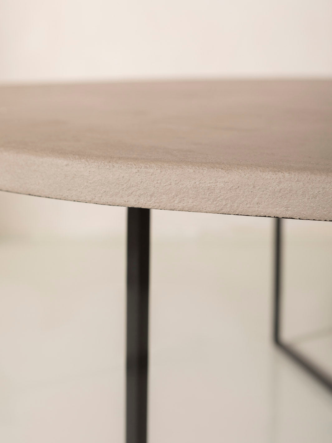 Mesa con forma redondeada de argilita y estructura de metal reciclado negro. La argilita es una roca sedimentaria compuesta por arcilla y cuarzo.