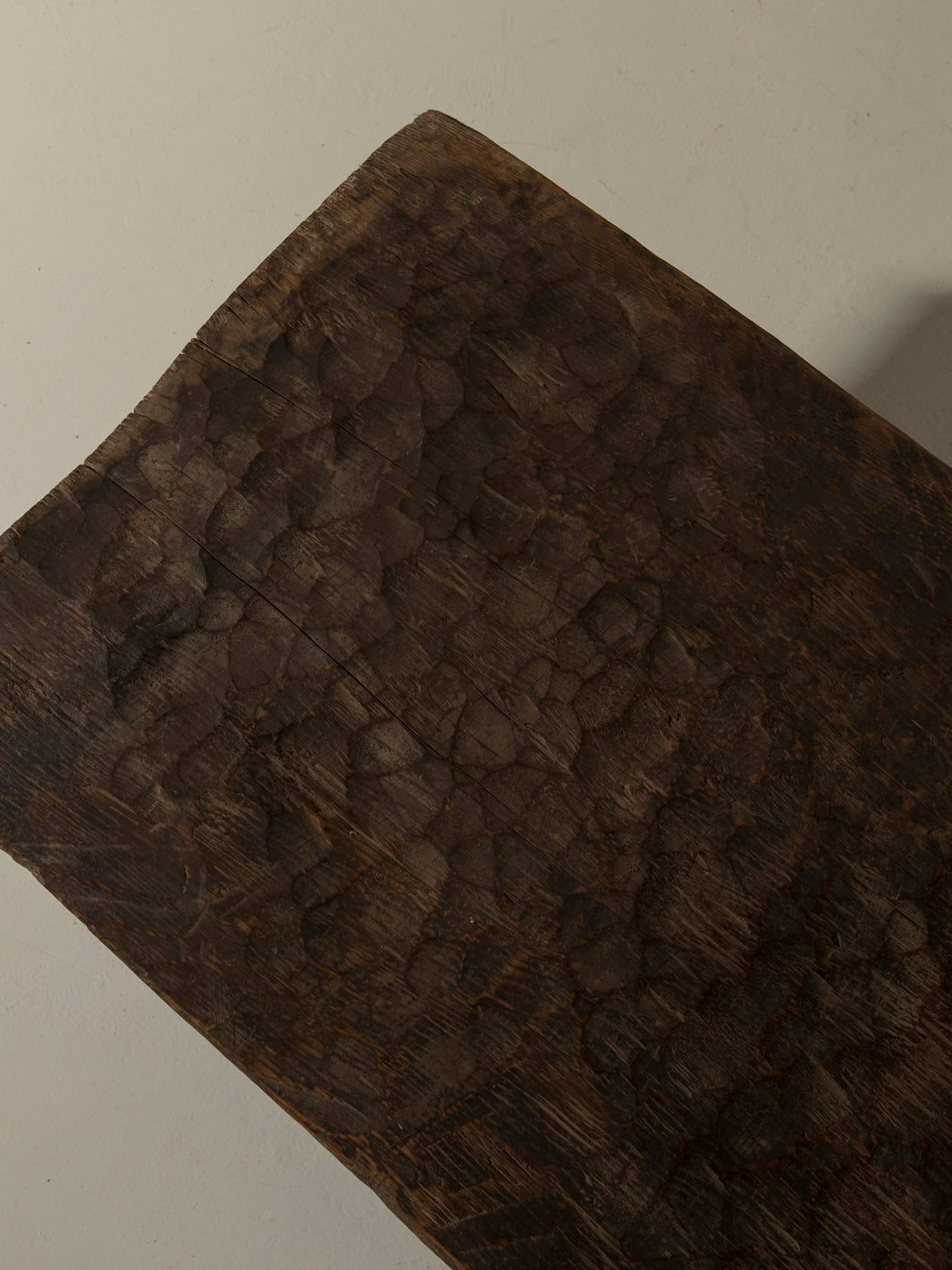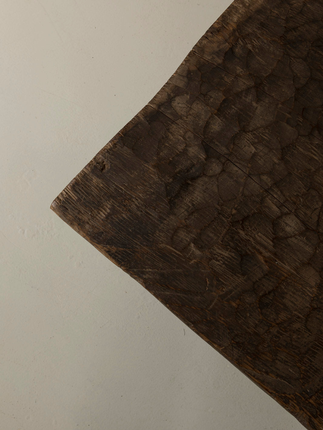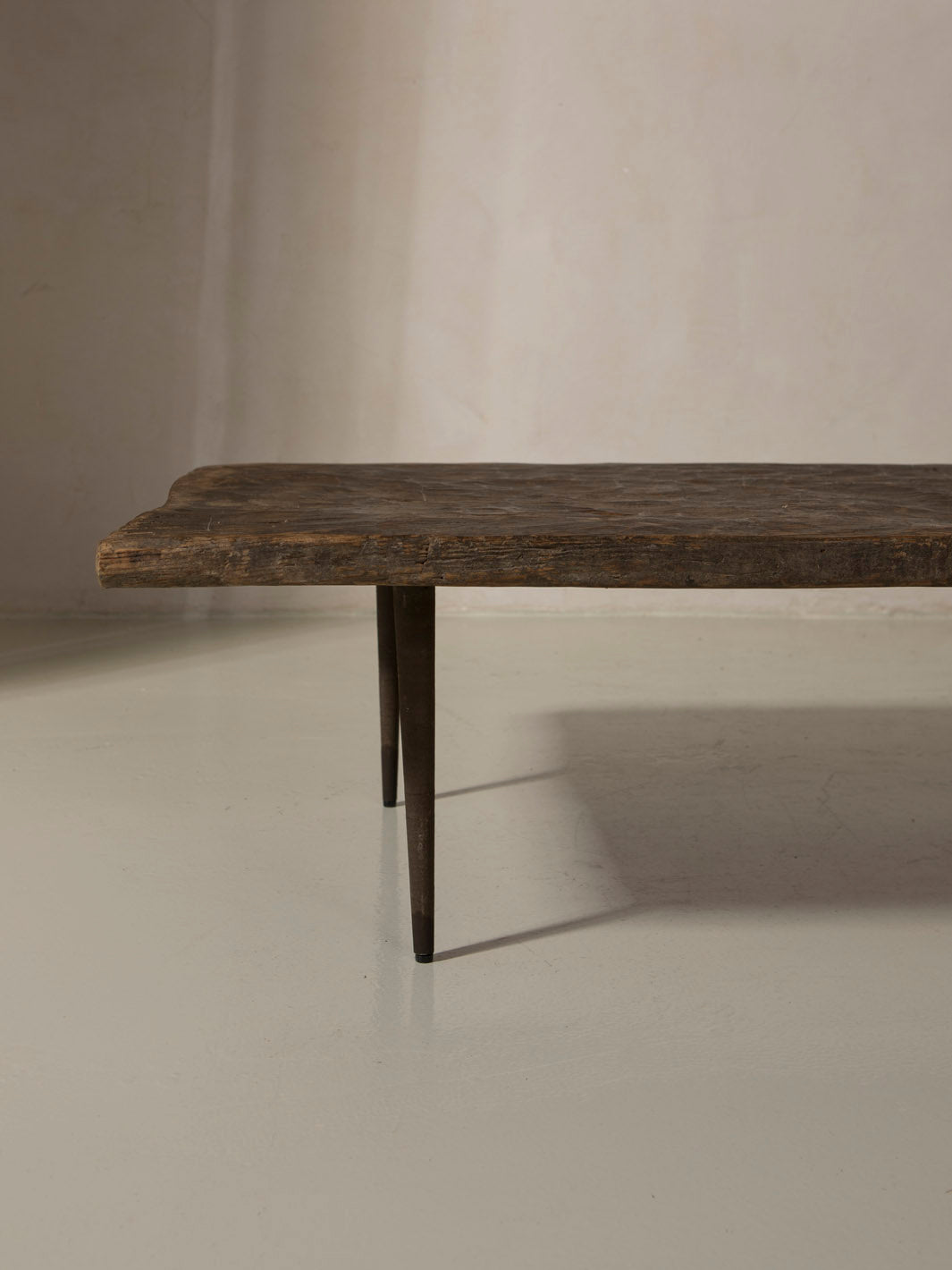 Mesa de centro con sobre en roble natural martillado a mano, sostenido por patas metálicas en forma de pico que aportan carácter y ligereza visual.