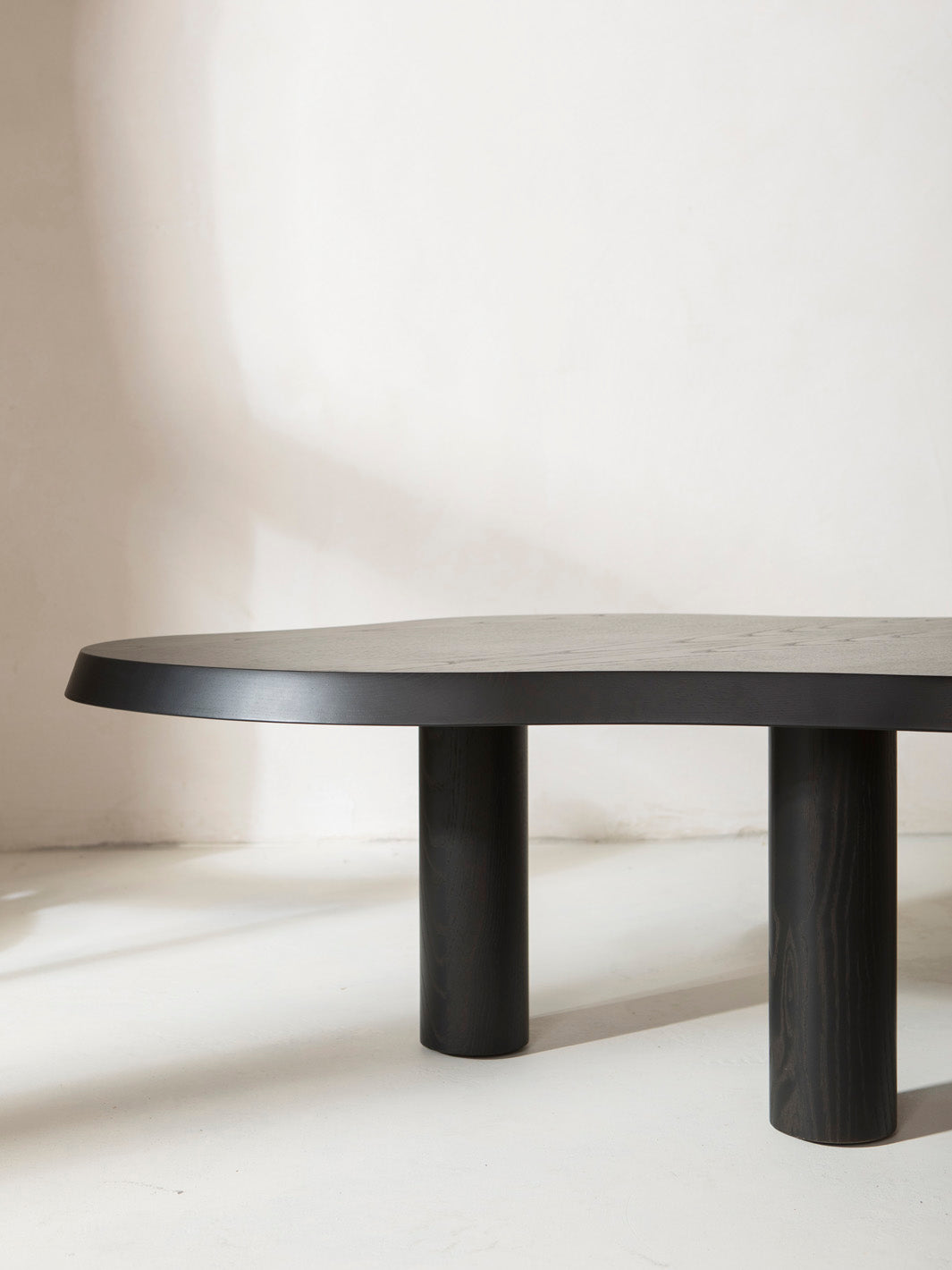 Mesa de centro de fresno negro que evoca la naturaleza: una nube, una piedra, un lago... Una estética simple y depurada que deja espacio a la imaginación.