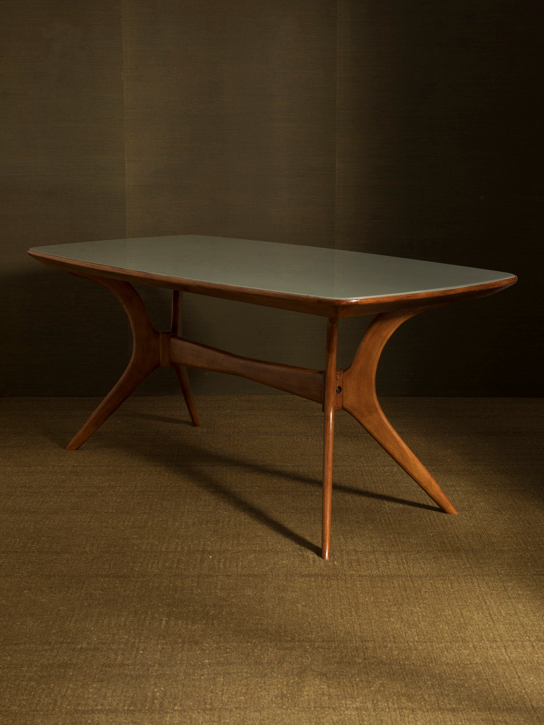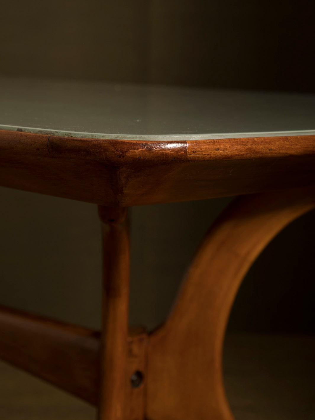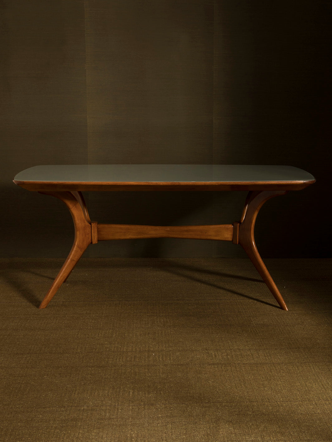 Esta elegante mesa de comedor italiana de los años 50 combina la calidez del nogal macizo con la sofisticación del cristal. Su diseño escultórico, de líneas fluidas y patas estilizadas, refleja la maestría del mobiliario de mediados de siglo, aportando ligereza y dinamismo al espacio. Una pieza atemporal y refinada, fruto de una artesanía excepcional.
