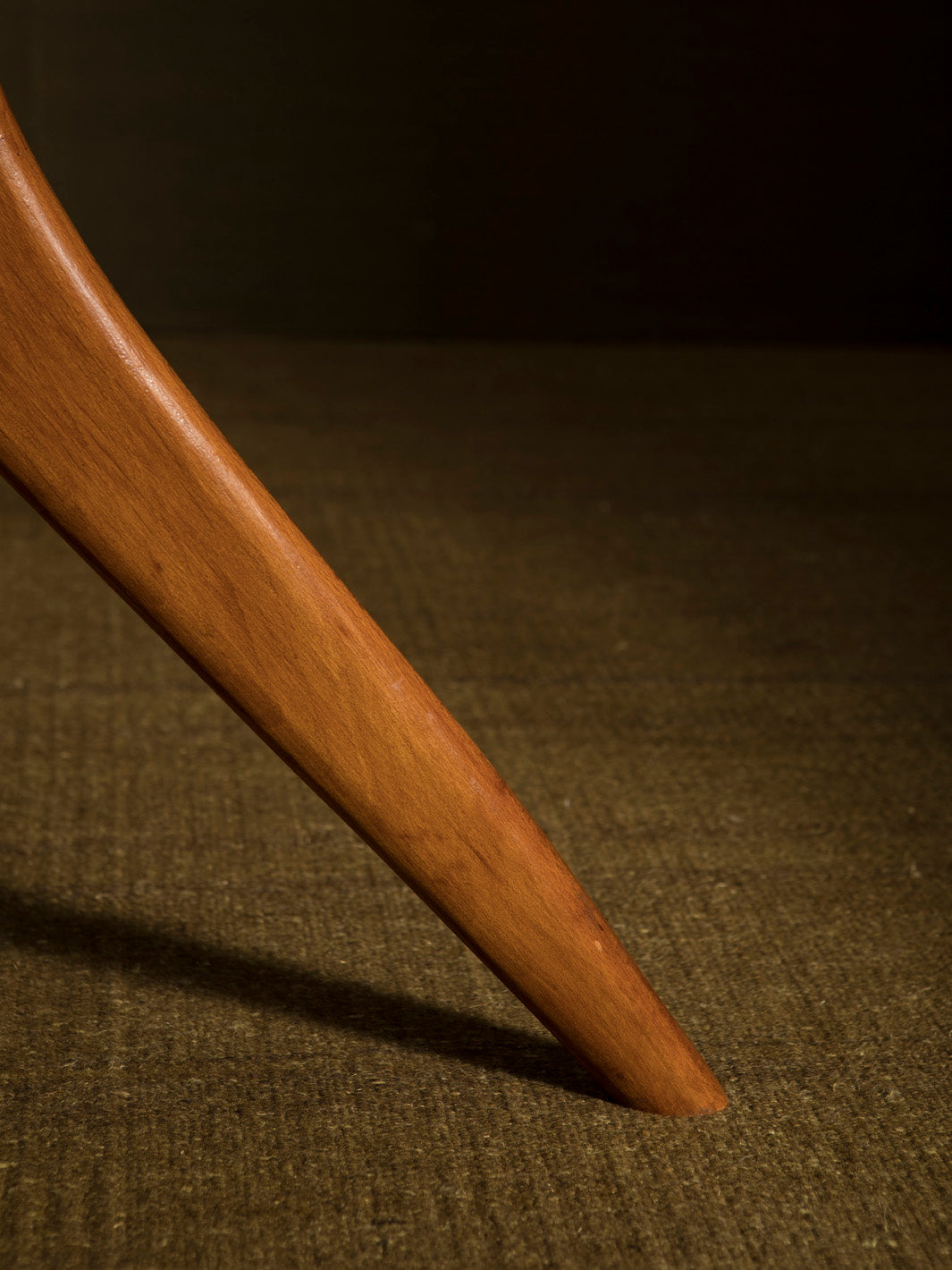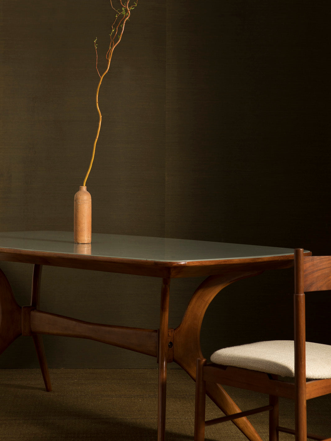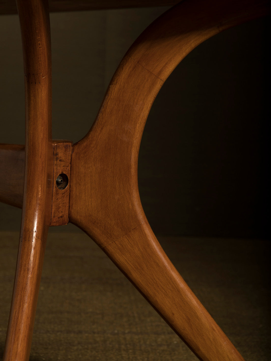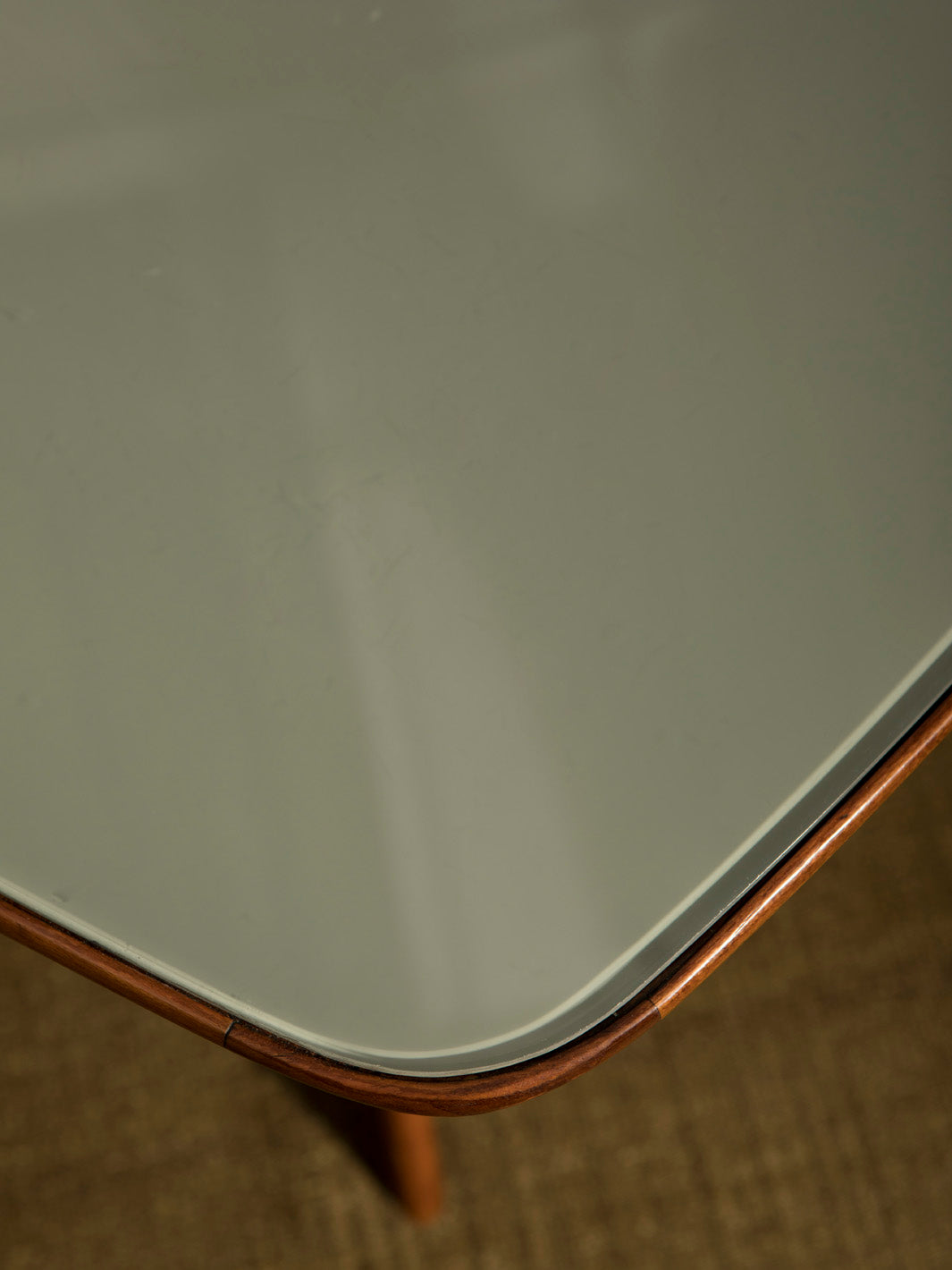 Esta elegante mesa de comedor italiana de los años 50 combina la calidez del nogal macizo con la sofisticación del cristal. Su diseño escultórico, de líneas fluidas y patas estilizadas, refleja la maestría del mobiliario de mediados de siglo, aportando ligereza y dinamismo al espacio. Una pieza atemporal y refinada, fruto de una artesanía excepcional.