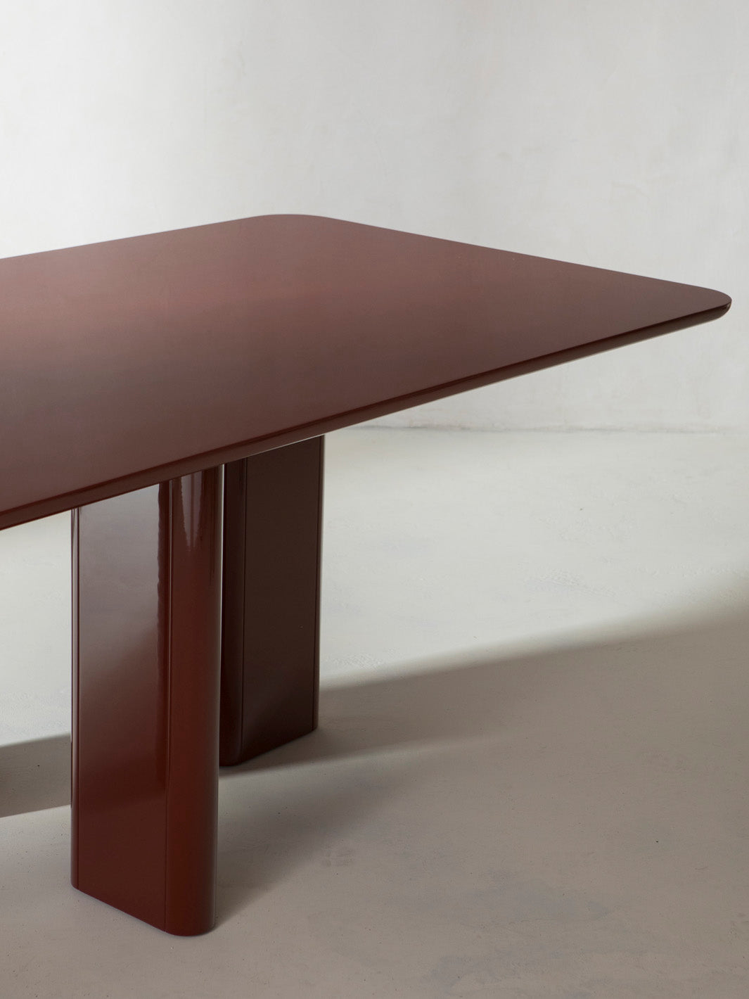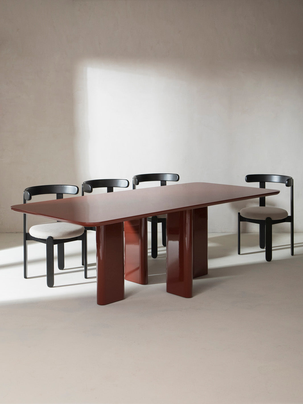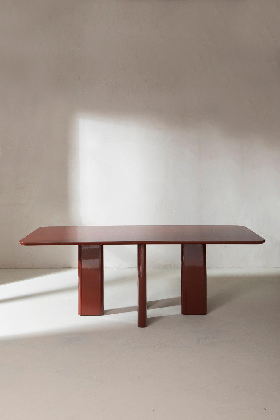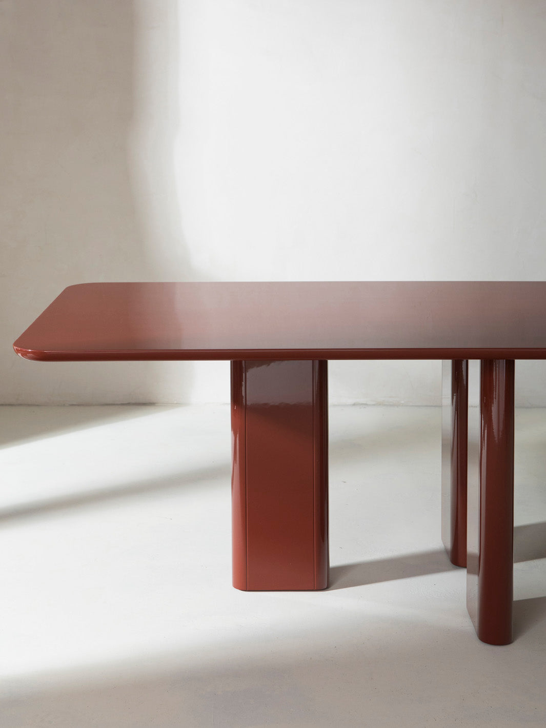 Mesa de comedor de madera lacada disponible en 4 colores: burgundy, caramel, kaki y blanco. Materiales nobles, detalles sofisticados y líneas marcadas. La laca adopta una estética audaz, con bordes biselados y formas contrastantes.