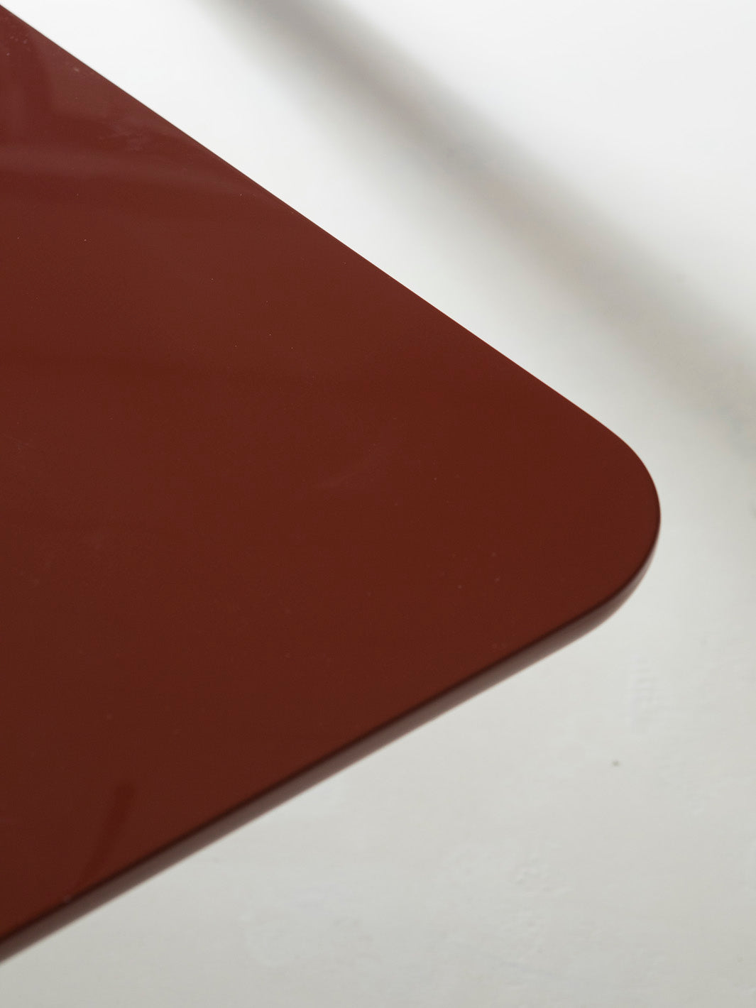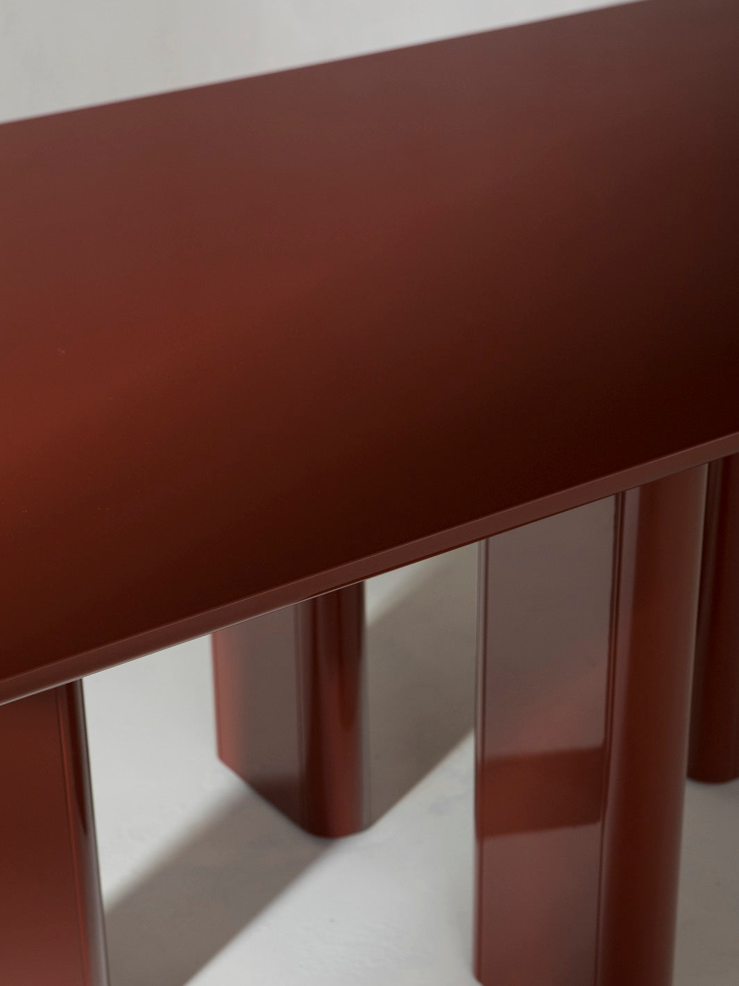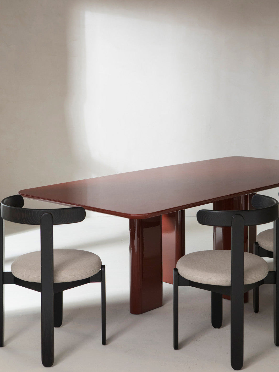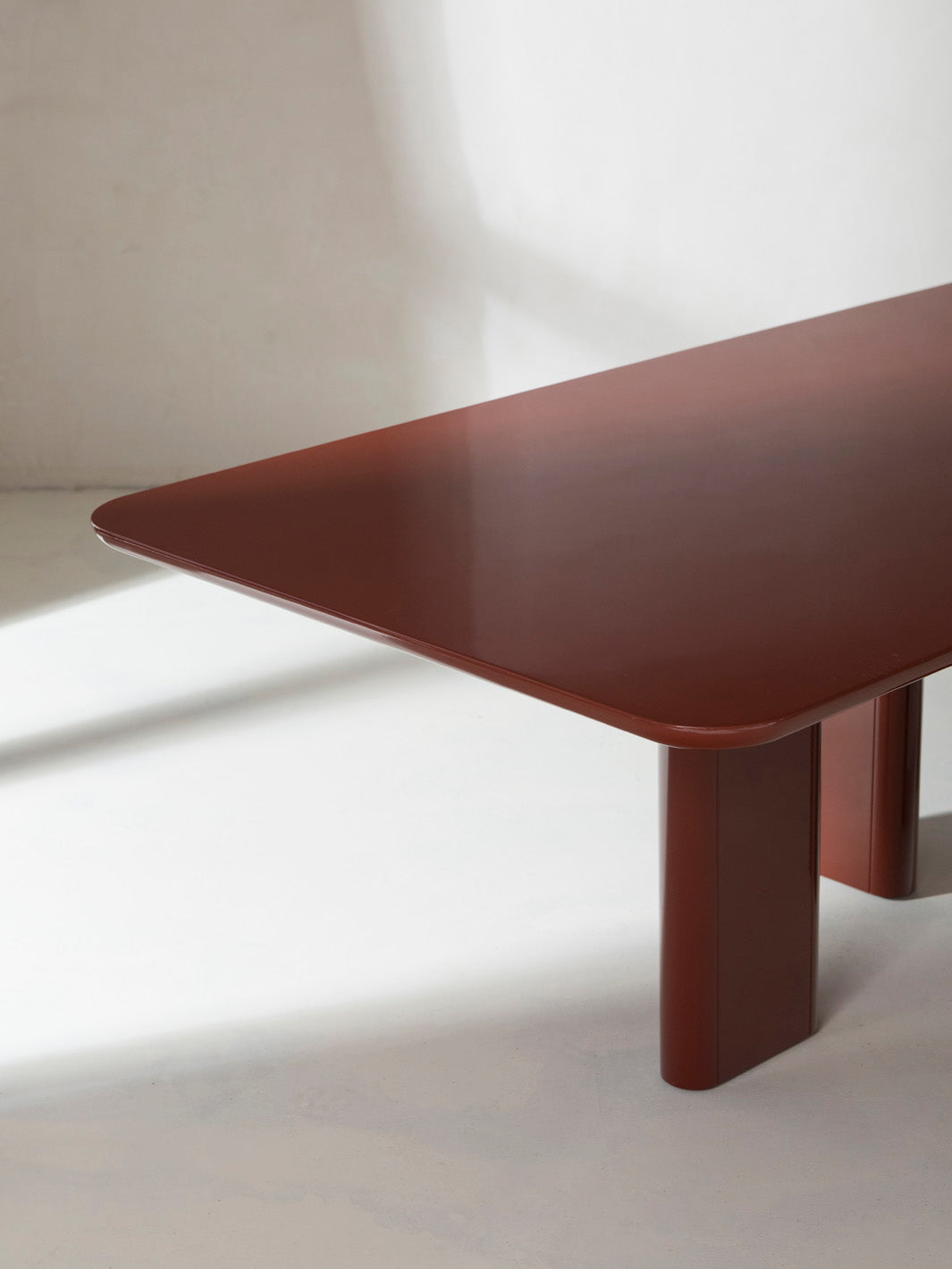 Mesa de comedor de madera lacada disponible en 4 colores: burgundy, caramel, kaki y blanco. Materiales nobles, detalles sofisticados y líneas marcadas. La laca adopta una estética audaz, con bordes biselados y formas contrastantes.